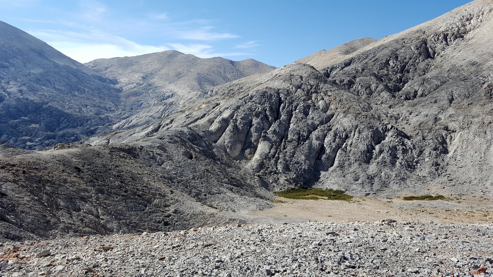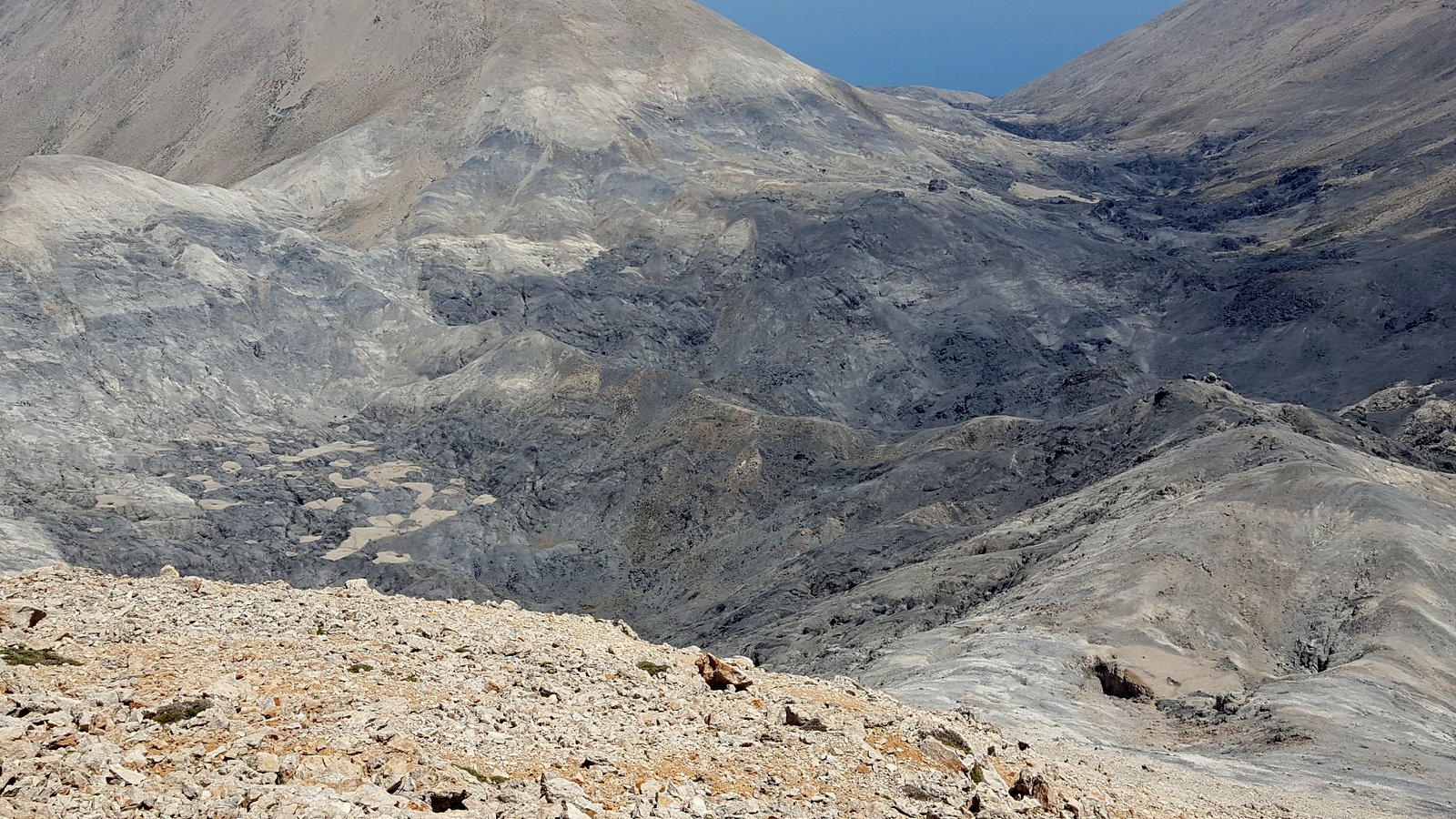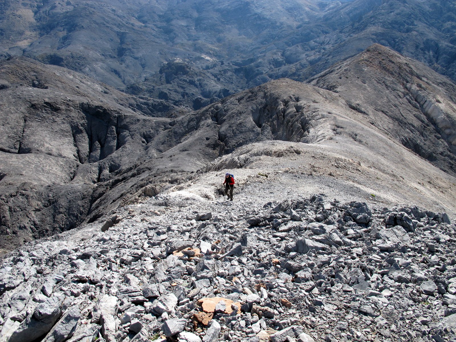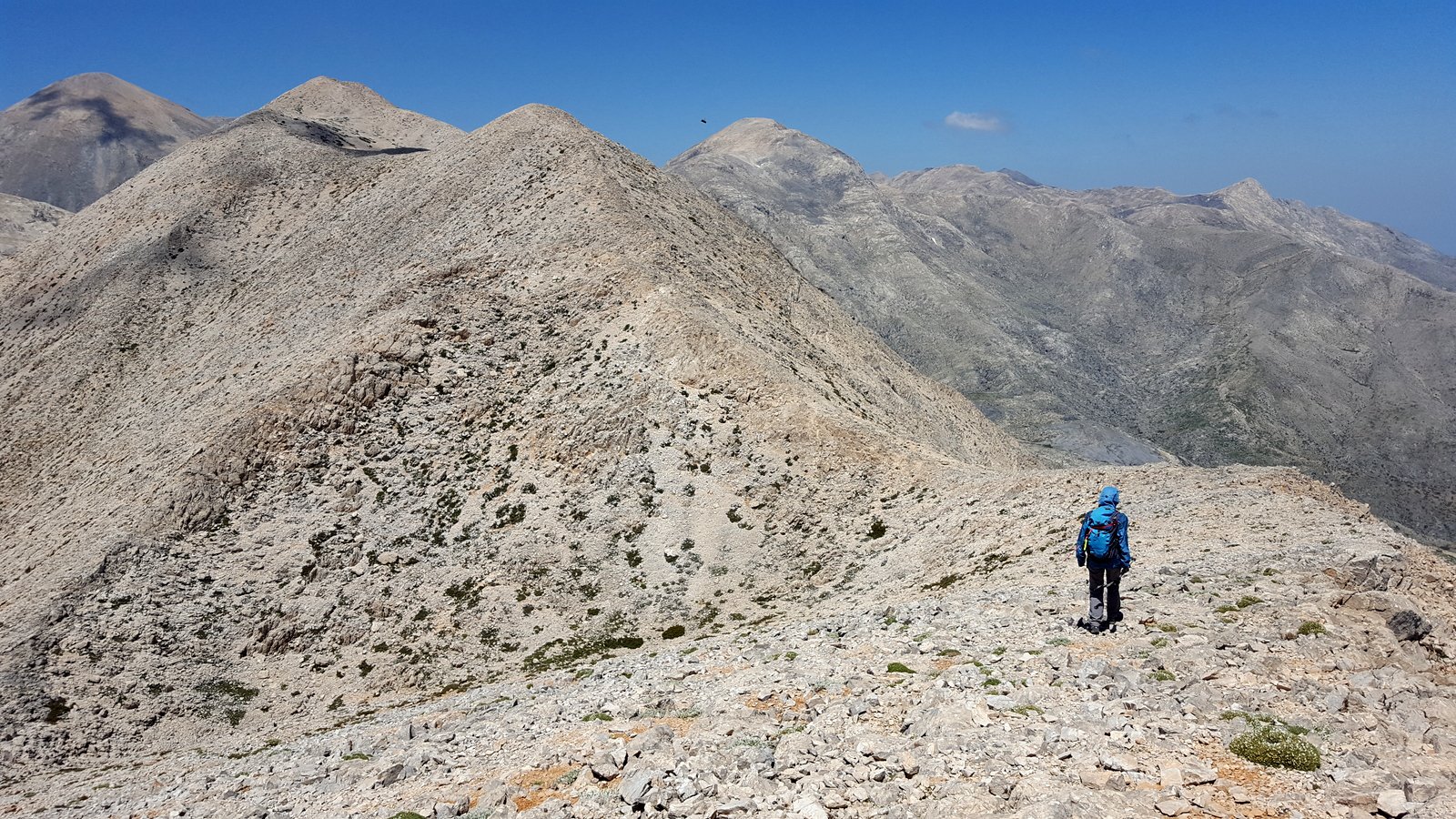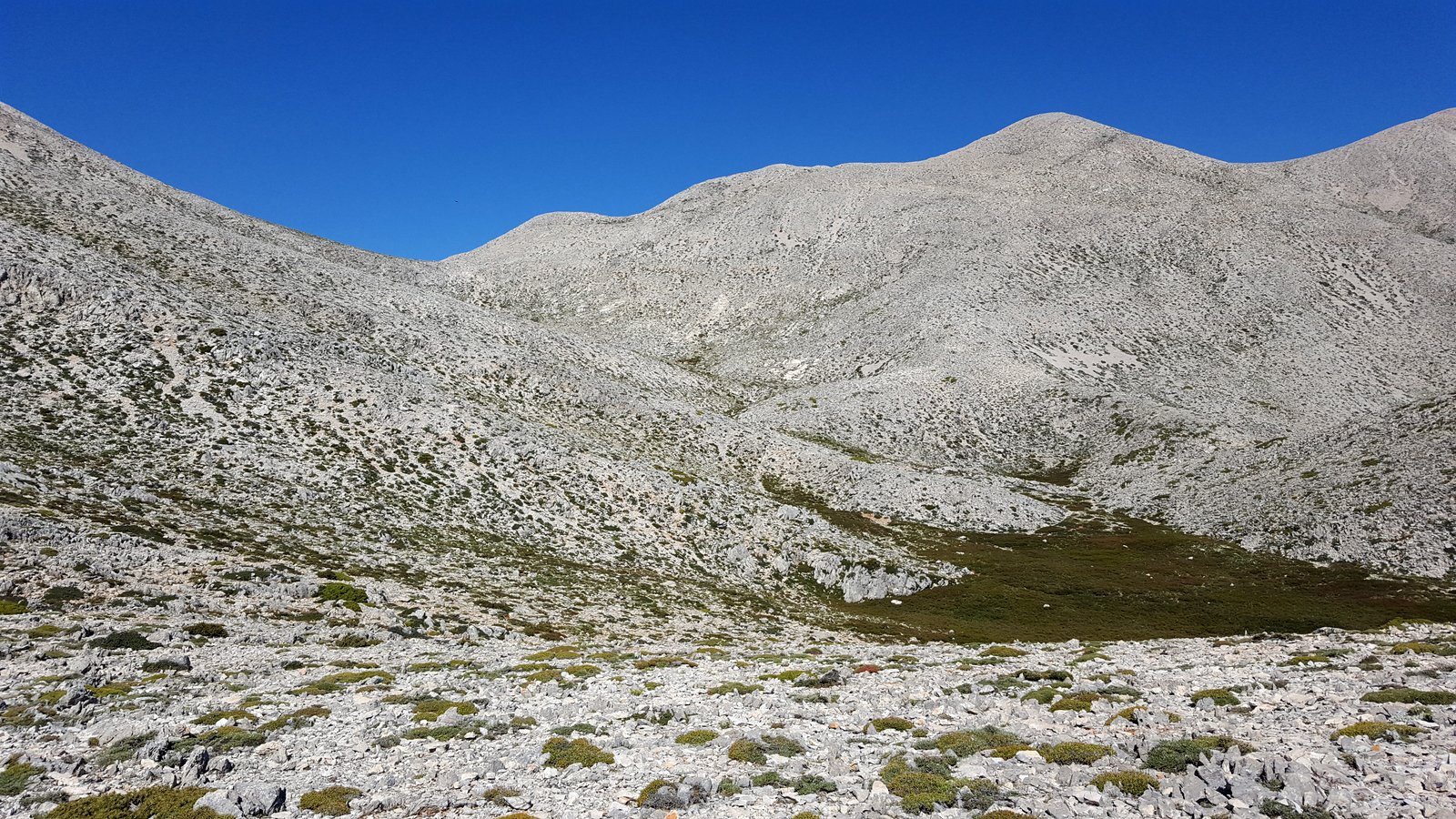 Si torna sul tracciato dell’E4 (segnavia giallo-neri) che, con traverso in direzione ESE, conduce al colletto alla base dell’Askyfiotikos Soros. Si abbandona nuovamente il sentiero e si risale faticosamente il pendio N del monte (qualche tracciolina fra i detriti) fino alla vetta (mt. 2213). Quindi si scende dalla parte opposta su terreno ripido e infido, sfruttando eventualmente gli affioramenti obliqui di roccia più salda. Arrivati alla base dell’Askyfiotikos, si continua lungo l’ampia dorsalona progressivamente verso SSE, oltrepassando due piccoli rilievi rocciosi e puntando ad un ultimo castello dove le dorsale finisce. Si aggira con attenzione quest’ultima formazione rocciosa alla sua base sx (breve passaggio che richiede l’uso delle mani) per portarsi sul pendio dal quale si accede ad un altro crinale che separa due vaste depressioni.