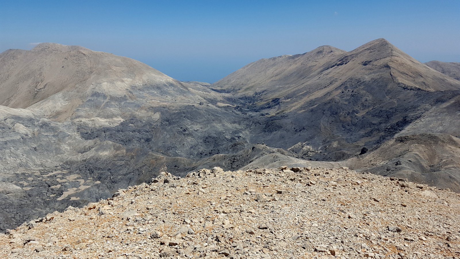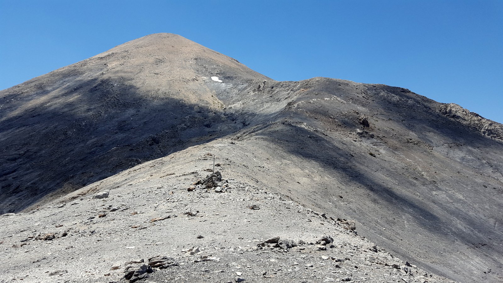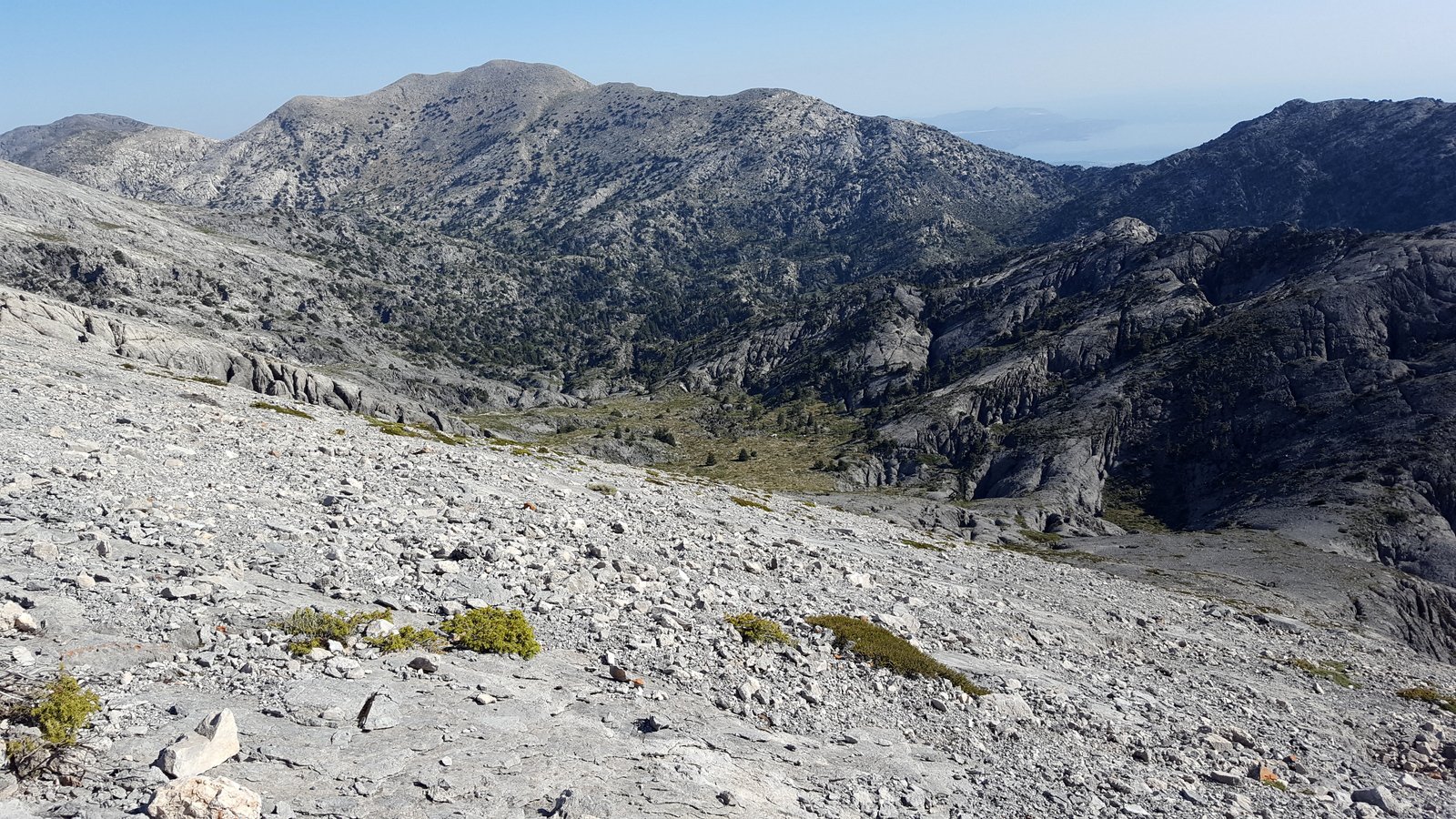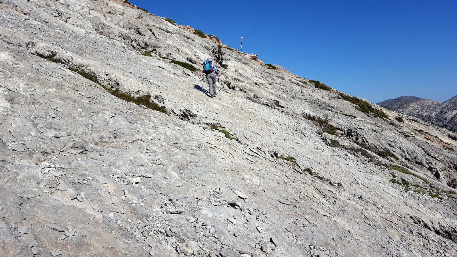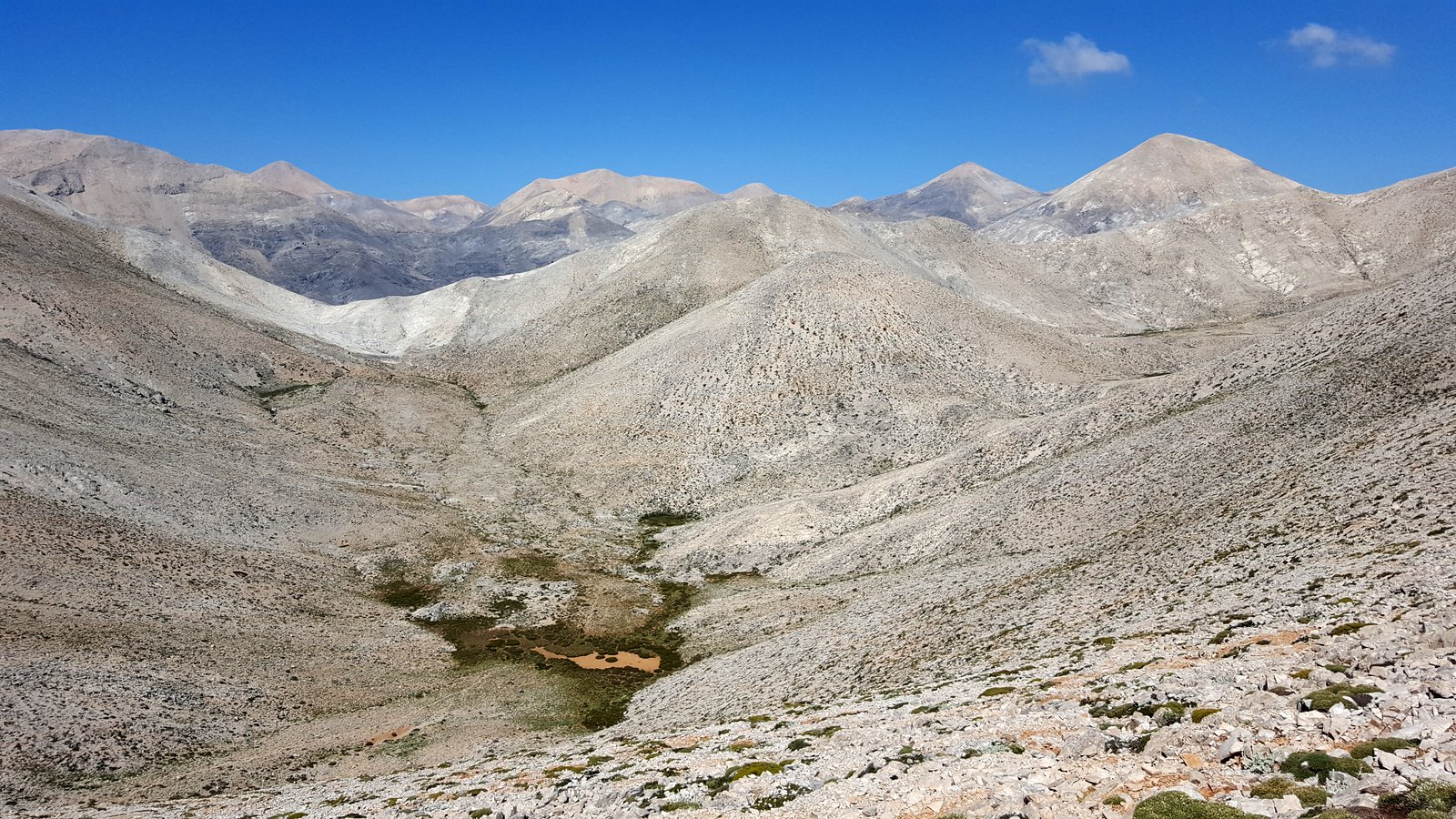 Si torna sul tracciato dell’E4 (segnavia giallo-neri) che, con traverso in direzione ESE, conduce al colletto alla base dell’Askyfiotikos Soros. Si abbandona nuovamente il sentiero e si risale faticosamente il pendio N del monte (qualche tracciolina fra i detriti) fino alla vetta (mt. 2213). Quindi si scende dalla parte opposta su terreno ripido e infido, sfruttando eventualmente gli affioramenti obliqui di roccia più salda. Arrivati alla base dell’Askyfiotikos, si continua lungo l’ampia dorsalona progressivamente verso SSE, oltrepassando due piccoli rilievi rocciosi e puntando ad un ultimo castello dove le dorsale finisce. Si aggira con attenzione quest’ultima formazione rocciosa alla sua base sx (breve passaggio che richiede l’uso delle mani) per portarsi sul pendio dal quale si accede ad un altro crinale che separa due vaste depressioni.