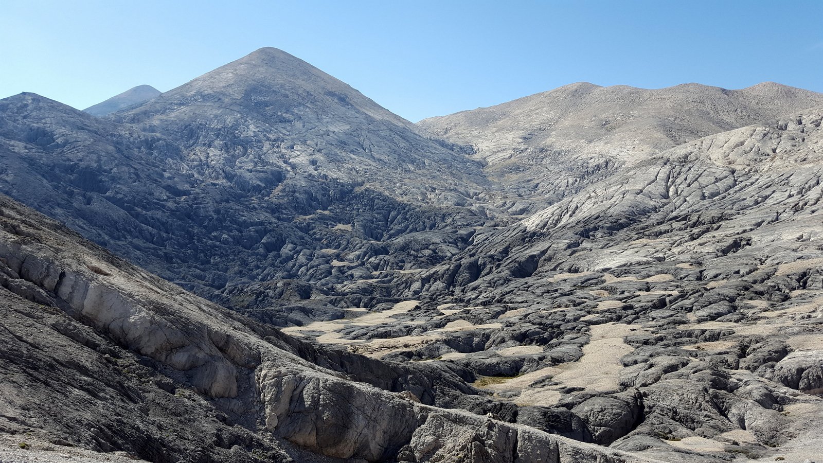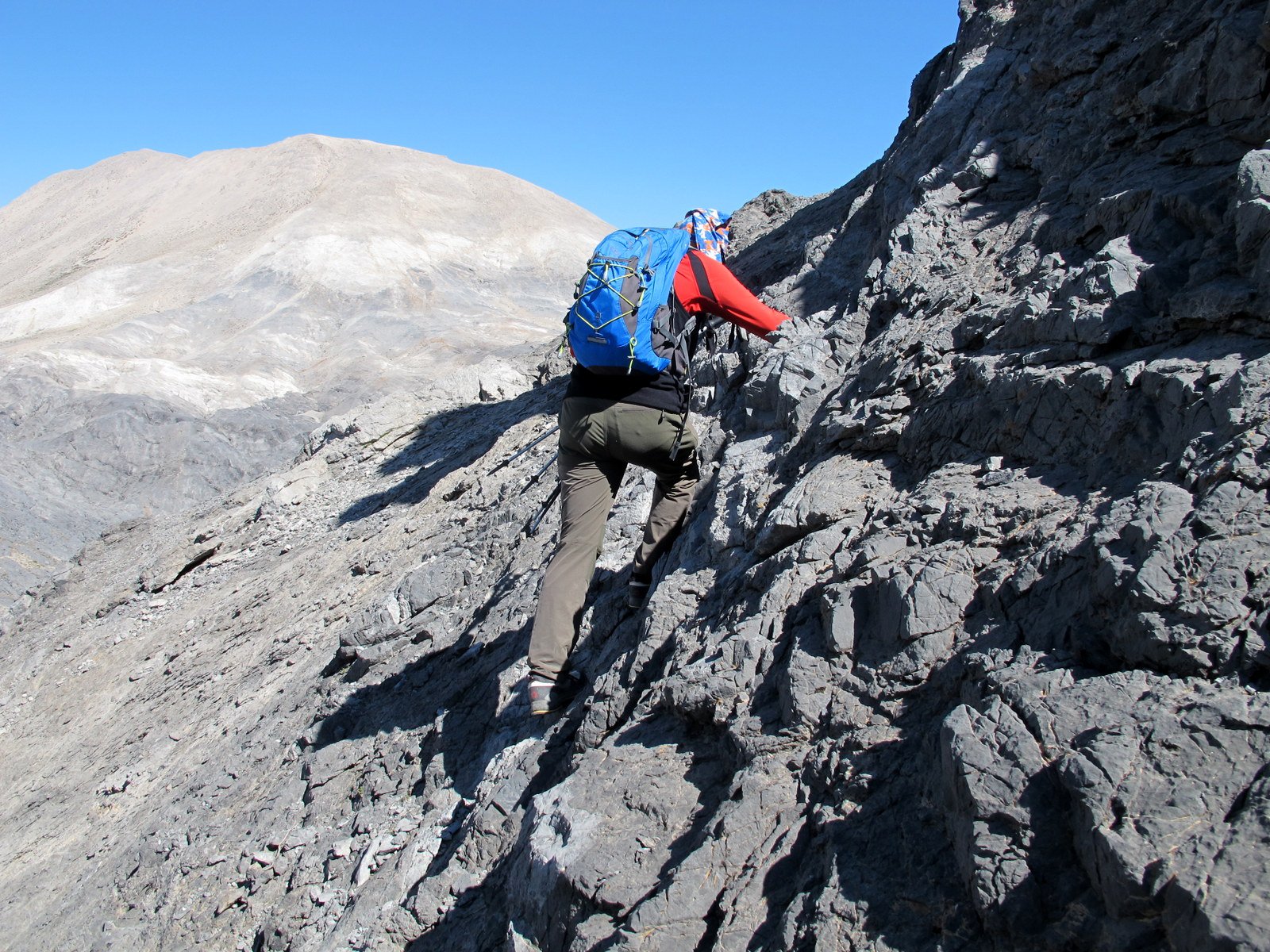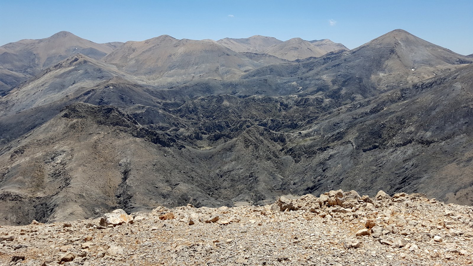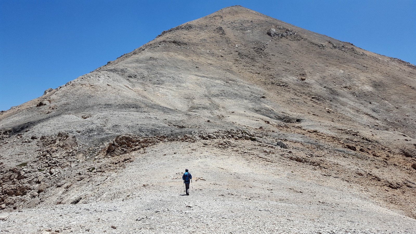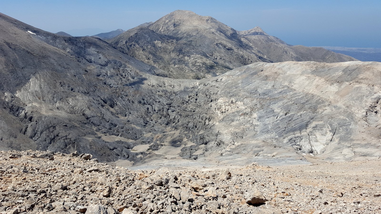 Si torna sul tracciato dell’E4 (segnavia giallo-neri) che, con traverso in direzione ESE, conduce al colletto alla base dell’Askyfiotikos Soros. Si abbandona nuovamente il sentiero e si risale faticosamente il pendio N del monte (qualche tracciolina fra i detriti) fino alla vetta (mt. 2213). Quindi si scende dalla parte opposta su terreno ripido e infido, sfruttando eventualmente gli affioramenti obliqui di roccia più salda. Arrivati alla base dell’Askyfiotikos, si continua lungo l’ampia dorsalona progressivamente verso SSE, oltrepassando due piccoli rilievi rocciosi e puntando ad un ultimo castello dove le dorsale finisce. Si aggira con attenzione quest’ultima formazione rocciosa alla sua base sx (breve passaggio che richiede l’uso delle mani) per portarsi sul pendio dal quale si accede ad un altro crinale che separa due vaste depressioni.