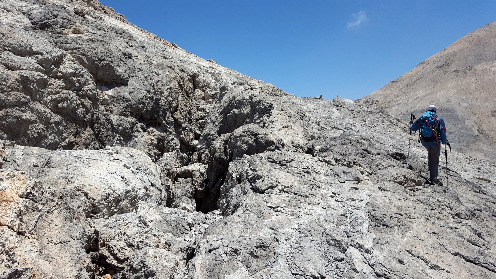 Si attraversa così la zona più aspra e inquietante della valle di Mavri Lakki, dove si susseguono doline, voragini e fenditure profonde nella roccia, la cui colorazione e natura varia passando dal bianco scintillante al nero al color terracotta.