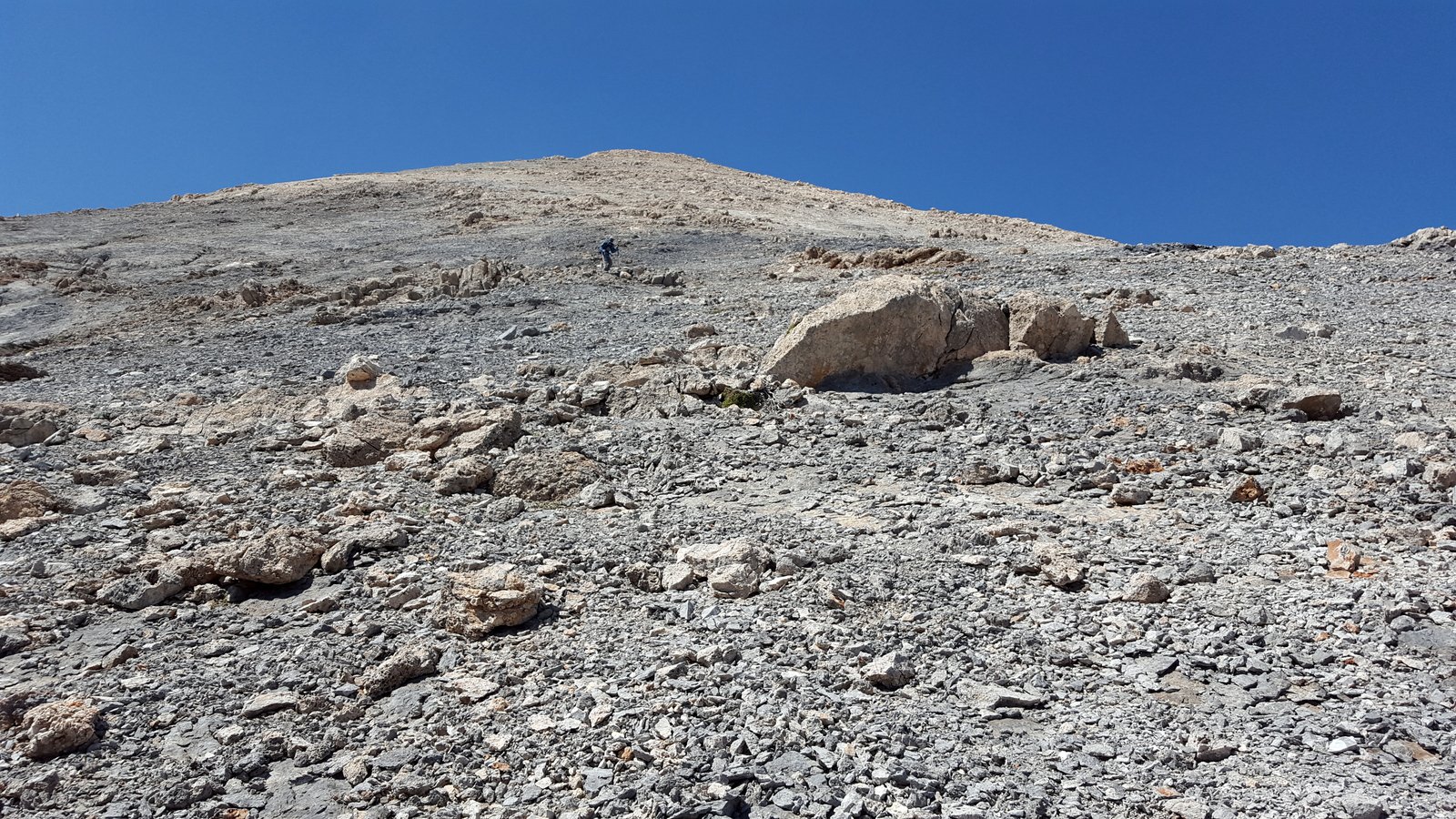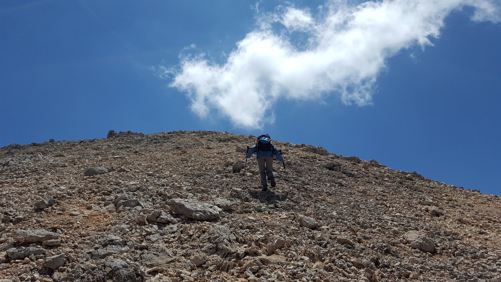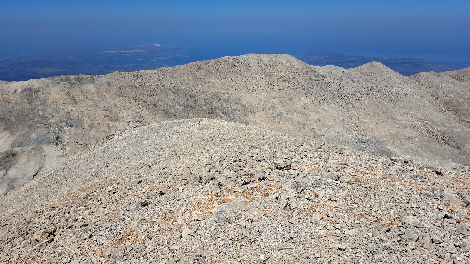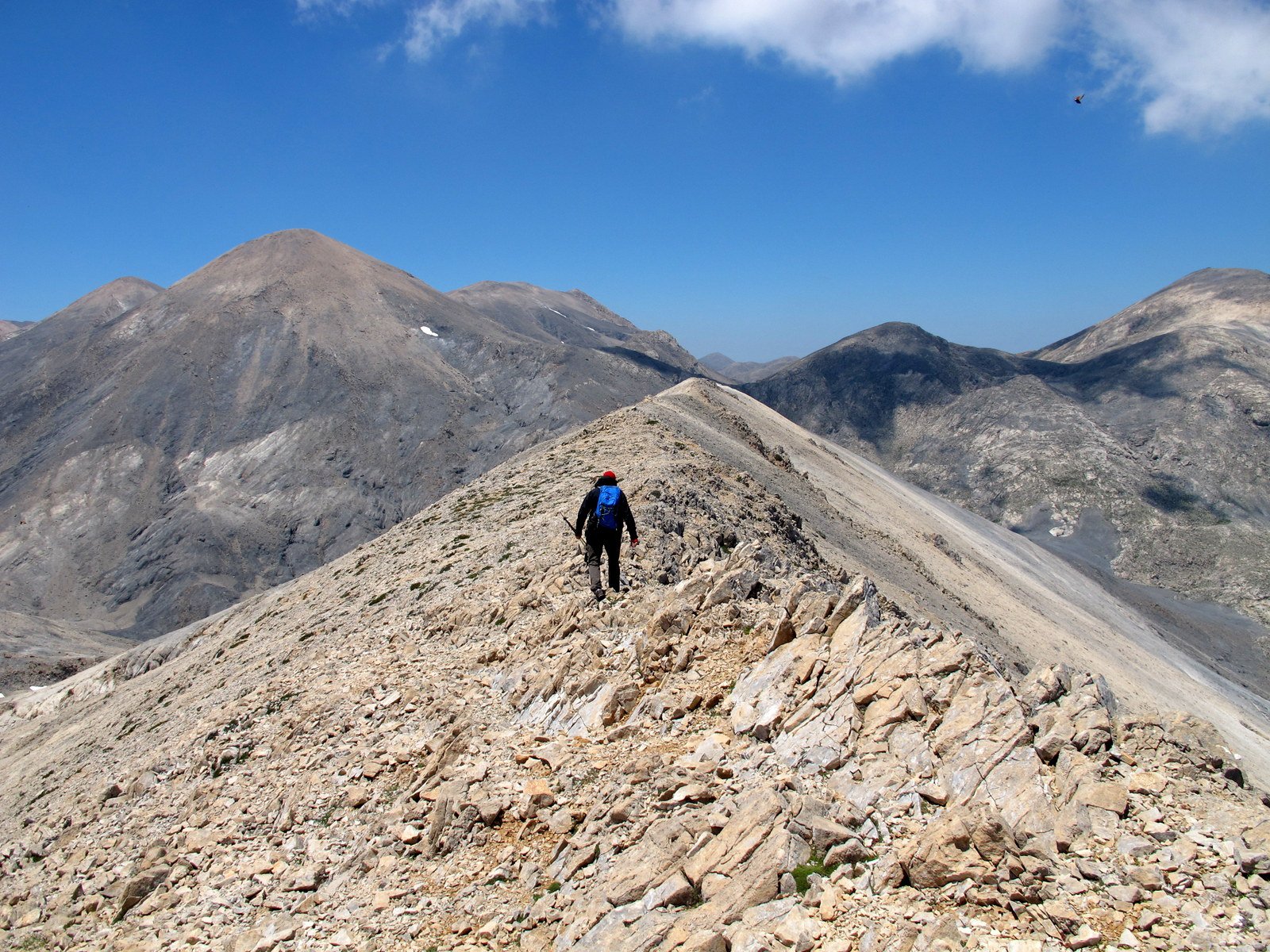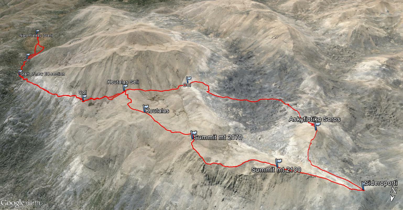 Si abbandona l’E4 e ci si innalza a destra per la dorsale sud del Monte Koutalàs. Si aggira a sx una dolina e si mette piede in breve sull’anticima. Si prosegue in direzione NO, scendendo e poi risalendo alla vera cima (q. 1995). Qui il crestone si fa meno ripido e invita a continuare per la vetta non nominata di quota 2070, formata da tre piccole cime, sulla più alta delle quali vi è il segnale trigonometrico dell’esercito greco. La dorsale compie un ampio giro e, con diversi saliscendi e aggiramenti di doline, mantenendo in generale la direzione Ovest, tocca il suo punto di massima elevazione (mt. 2100). Da qui si segue lo spartiacque ancora verso Ovest, e si rimane per un lungo tratto più o meno alla medesima quota (impressionanti i pendii di ghiaioni ai lati), scendendo infine alla depressione di Sideroportì (palina E4).