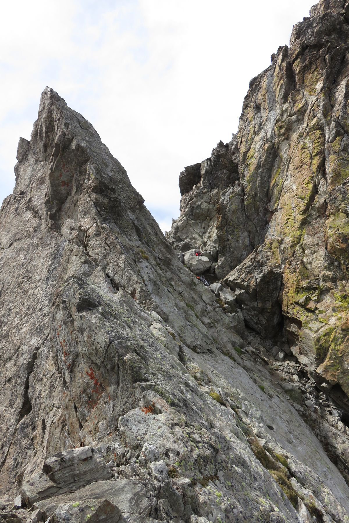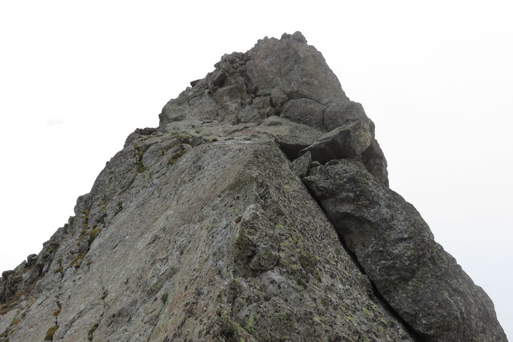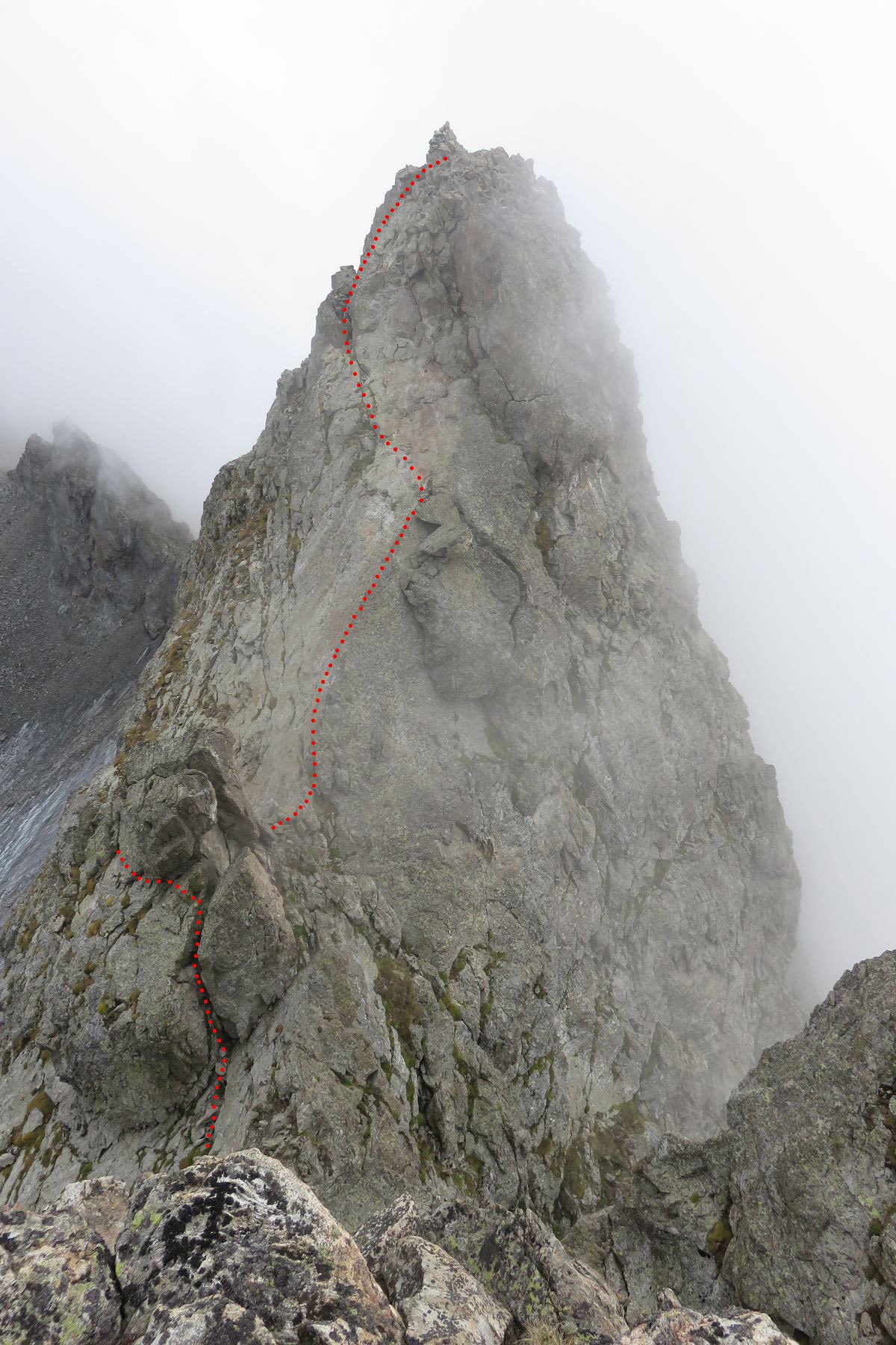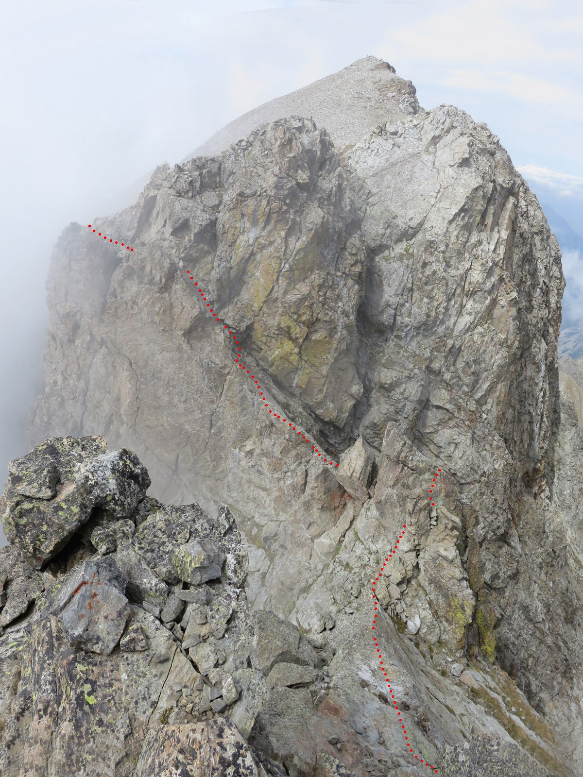 Da San Giacomo salire al Passo del Pagarì e seguire il percorso per la via normale al Monte Clapier. Giunti ad un centinaio di metri dalla vetta del Clapier, a quota 3000 m circa, lasciarla a sx e tagliare a mezzacosta la pietraia fino a raggiungere la cresta SE inizialmente ancora costituita di sfasciumi. Raggiunto un salto roccioso verticale, imboccare una stretta cengia orizzontale una decina di metri sul lato meridionale, decisamente esposta, che riporta sul filo sotto il salto, ad un colletto a sx di un gendarme affilato. Scendere per una decina di metri un canalino roccioso sul versante opposto (NO), quindi tagliare orizzontalmente verso sx, a monte di lisce placche terminanti poco sotto con un salto nel vuoto, sfruttando un’esile cengia. Si traversa così il gendarme raggiungendone il filo opposto. Si scende sullo spigolo (2 m, III, molto esposto) e si tocca un secondo colletto. Si attacca ora il gendarme successivo appena a sx del filo sfruttando un facile camino, si scavalcano gli ultimi metri sul versante settentrionale (II, esposto) e si scende al colletto successivo (delicato, lame di roccia poco solide). Si attacca ora la crestina finale, di roccia solida, che forma inizialmente uno spigolo arrotondato ma un po’ liscio che si supera (6 m, III). Si raggiunge così un terrazzo alla base del salto finale che si può vincere sulla sx del filo per un muretto piuttosto ripido (2 m, III) oppure piegando leggermente sul versante NO, scendendo qualche passo e sfruttando un caminetto e una breve paretina più articolata e abbattuta (II, sempre molto esposto).