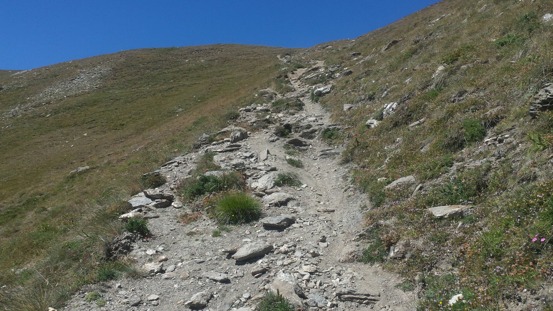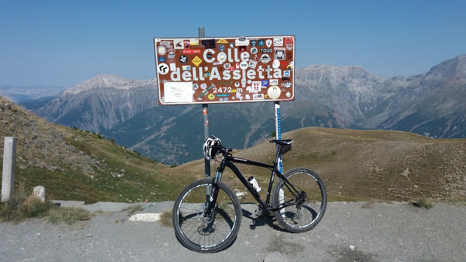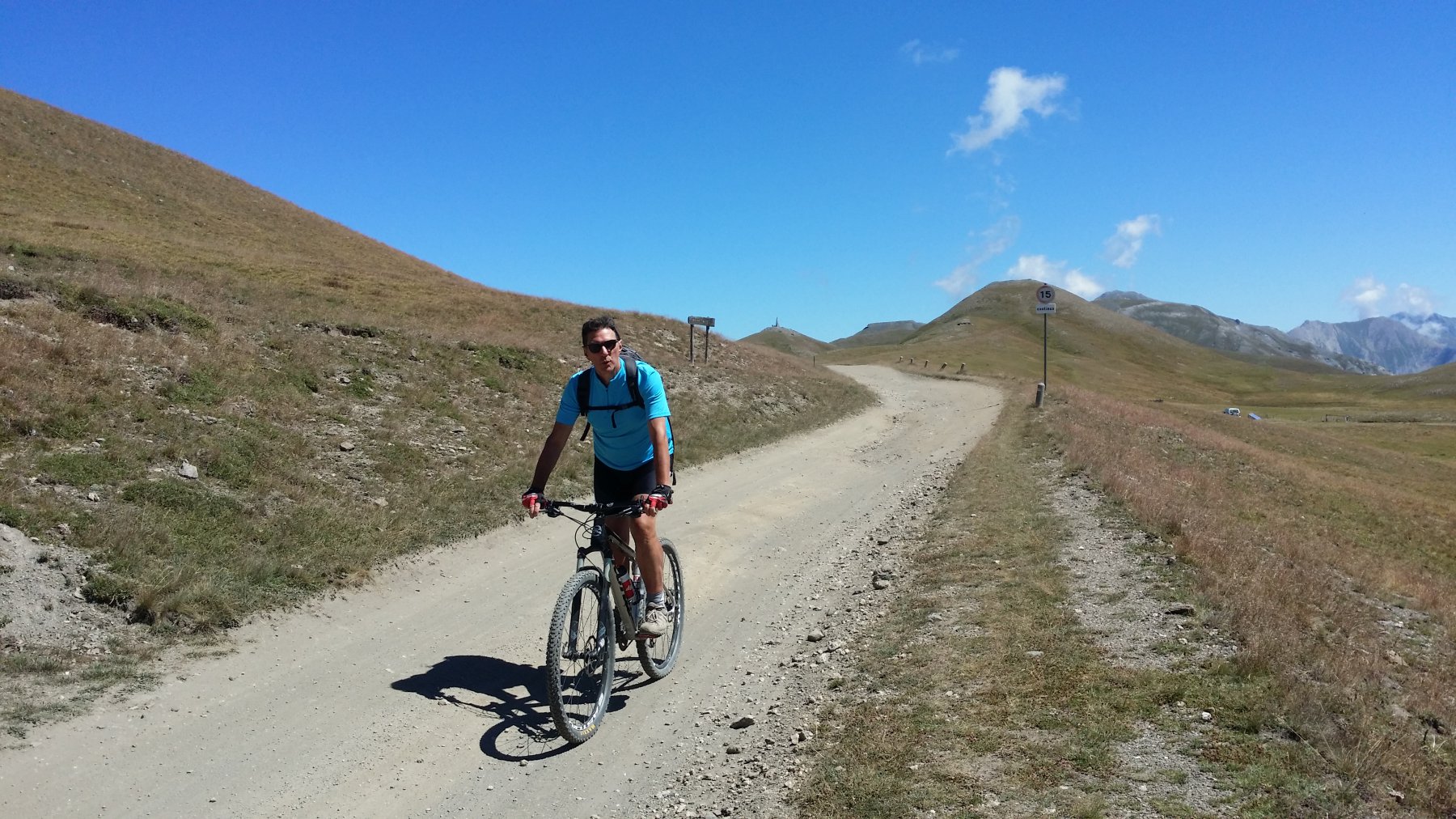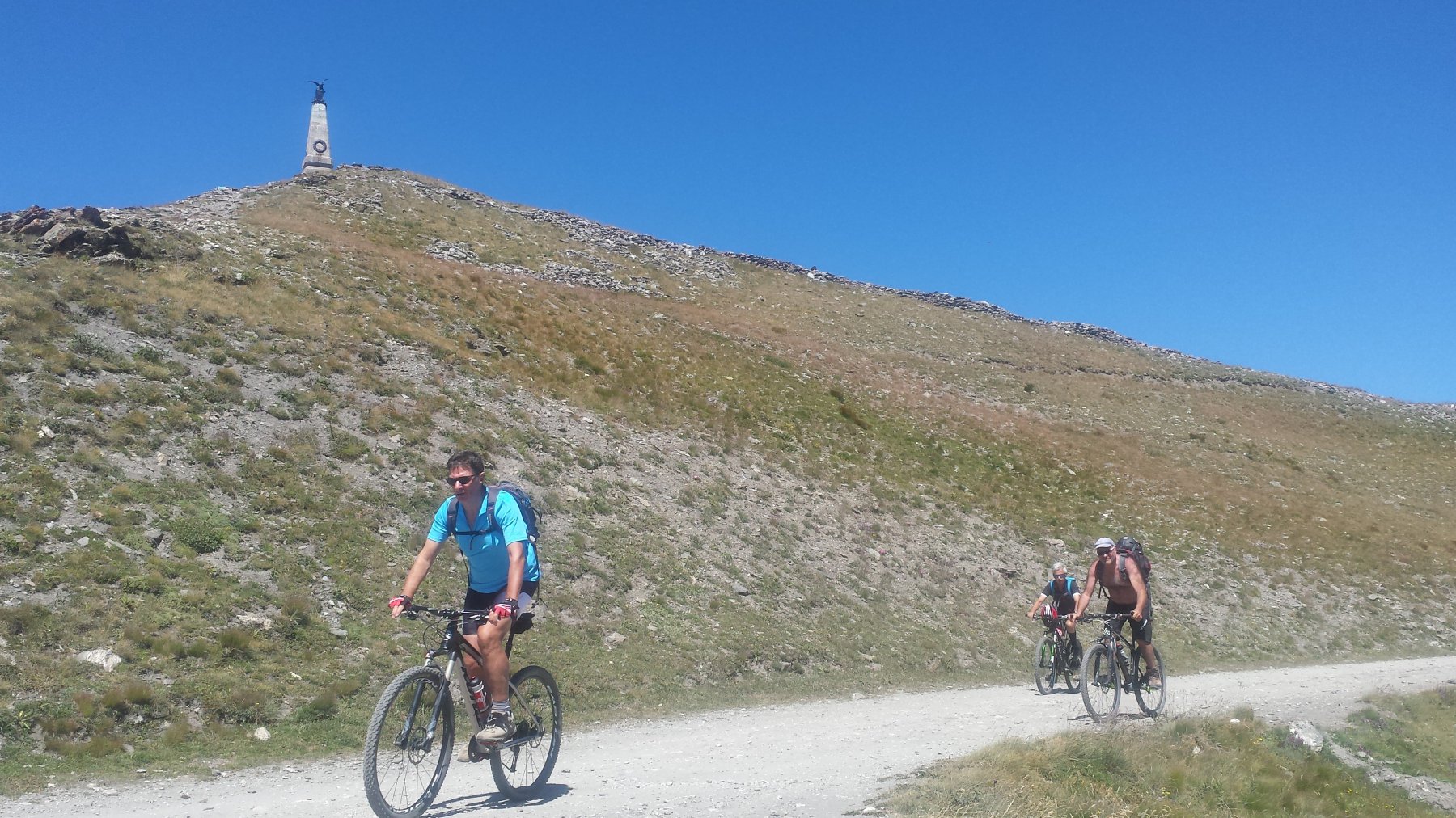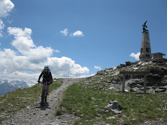 La salita prosegue con pendenze sempre regolari fino al Colle dell’Assietta (2.472 m), posto sullo spartiacque tra Val di Susa e Val Chisone. Con un ultimo breve tratto di salita si giunge in vista del monumento che campeggia sulla modesta elevazione della Testa dell’Assietta (2.565 m), che si raggiunge con una deviazione di pochi minuti.