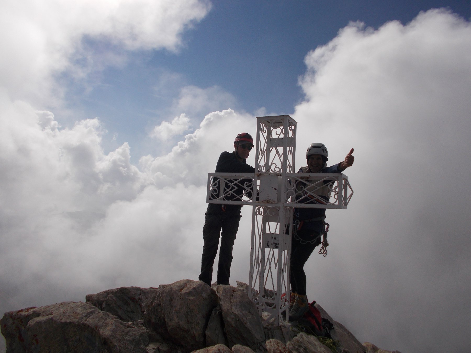 Dal Cervino in scala reale ad un Cervino di dimensioni decisamente parecchio piu’ contenute, la musica cambia e come. Con lo zoccolo composto da placche appoggiate e chiodatura praticamente assente (visto un solo chiodo) il dislivello da attacco a croce arriva a 200metri tondi tondi. Attratti dalla parete sud (una variante all’altrimenti rimanere sul filo) in quanto di roccia qualitativame3nte piu’ buona, ancor piu’ incoraggiati dalla presenza degli spit piu’ vicini, l’abbiamo salito divertendoci un sacco. Peccato non aver preso con noi le scarpette i passaggi almeno due non proprio facili riusciti bene anche con gli scarponi con le pedule sarebbero stati un giochetto il superarli. Abbiamo fatto in sostanza la variante AD+. Molto il detrito nella parte iniziale e nel tratto finale prima della croce. in questi punti smuovere coi piedi significa rischio di scaricare addosso roba al socio sotto e tirare com mani meno lame possibili. Va bene che in questi casi di tratti coricati sono piu’ i piedi che lavorano al posto delle mani. Bello e aereo lo spigolo del tratto centrale dove si trovano chiod tradizionali e spit posti a distanza relativamente vicina tra loro.Scesi dalla normale (pur sempre una PD+)con una calata di 20m da sosta attrezzata con cavo metallico e per cengia alla sella d’asti con qualche tratto sceso in disarrampicata nella parte ormai bassa della via.