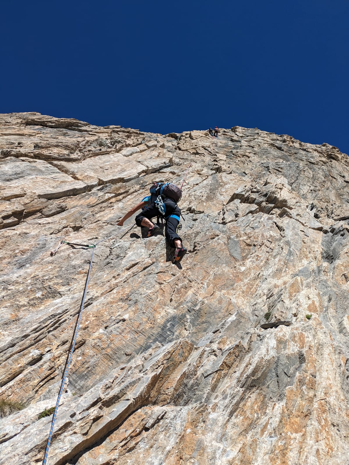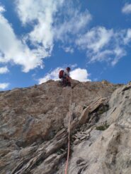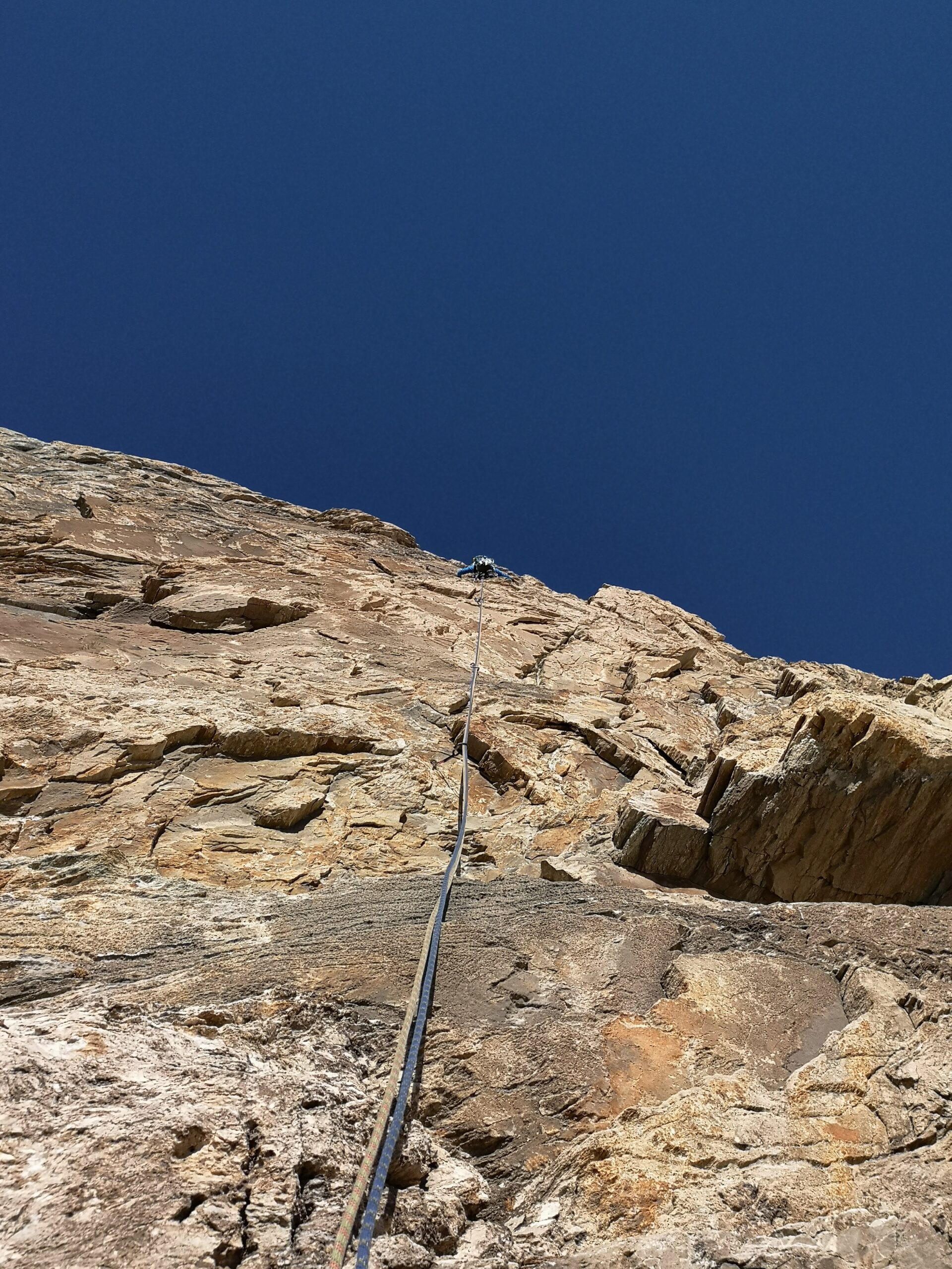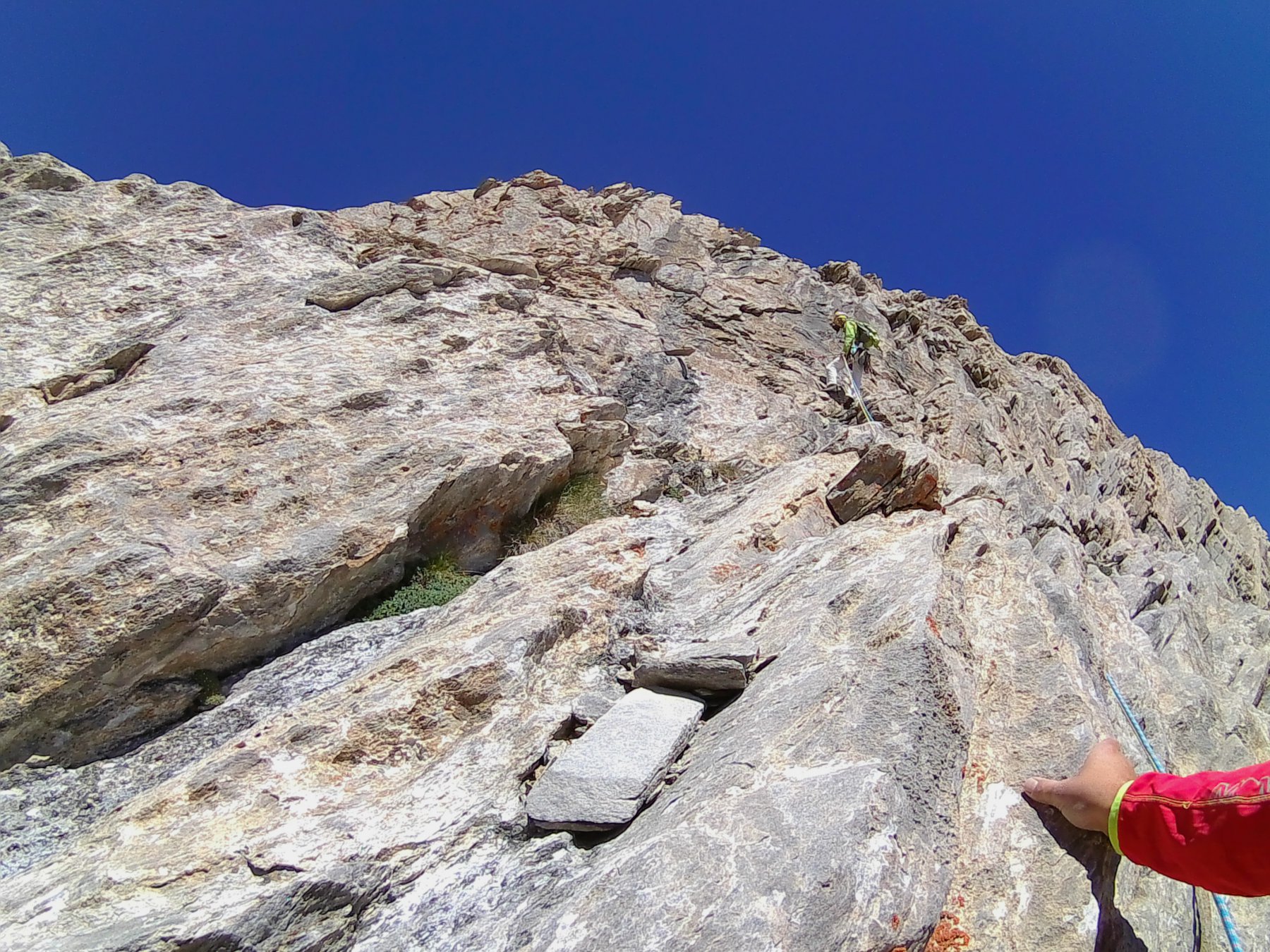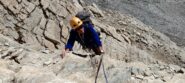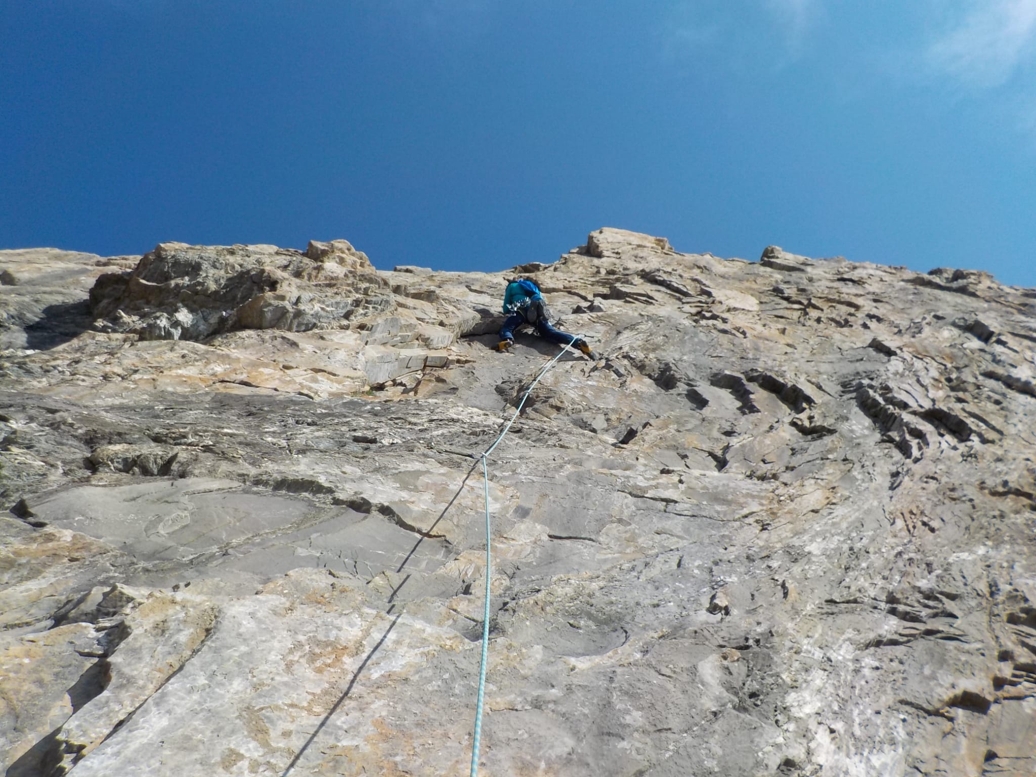 - 2° tiro: sempre obliquando verso destra per diversi metri poi si esce dritti sulla cengia, 5b/c 55/60 metri ,