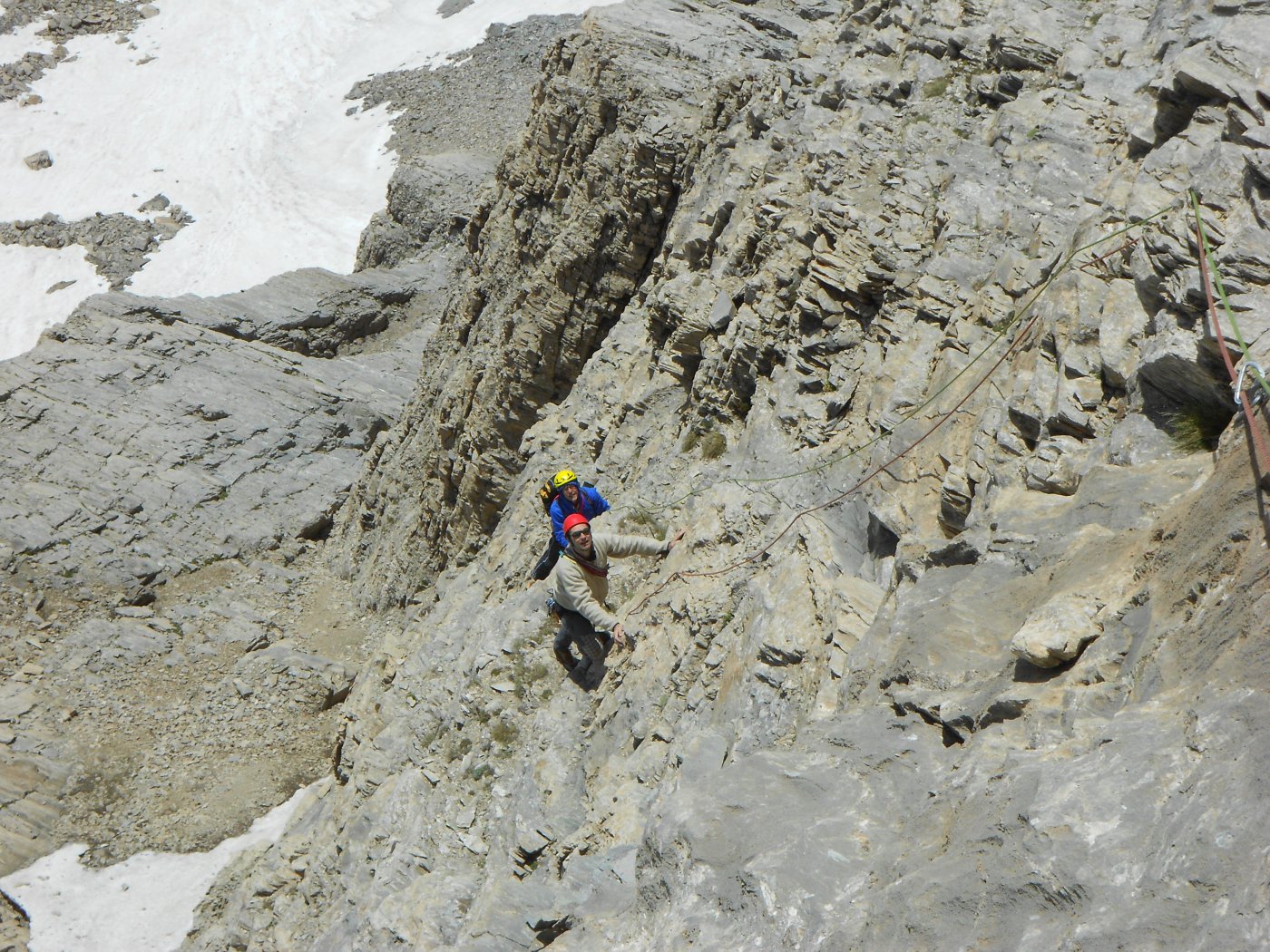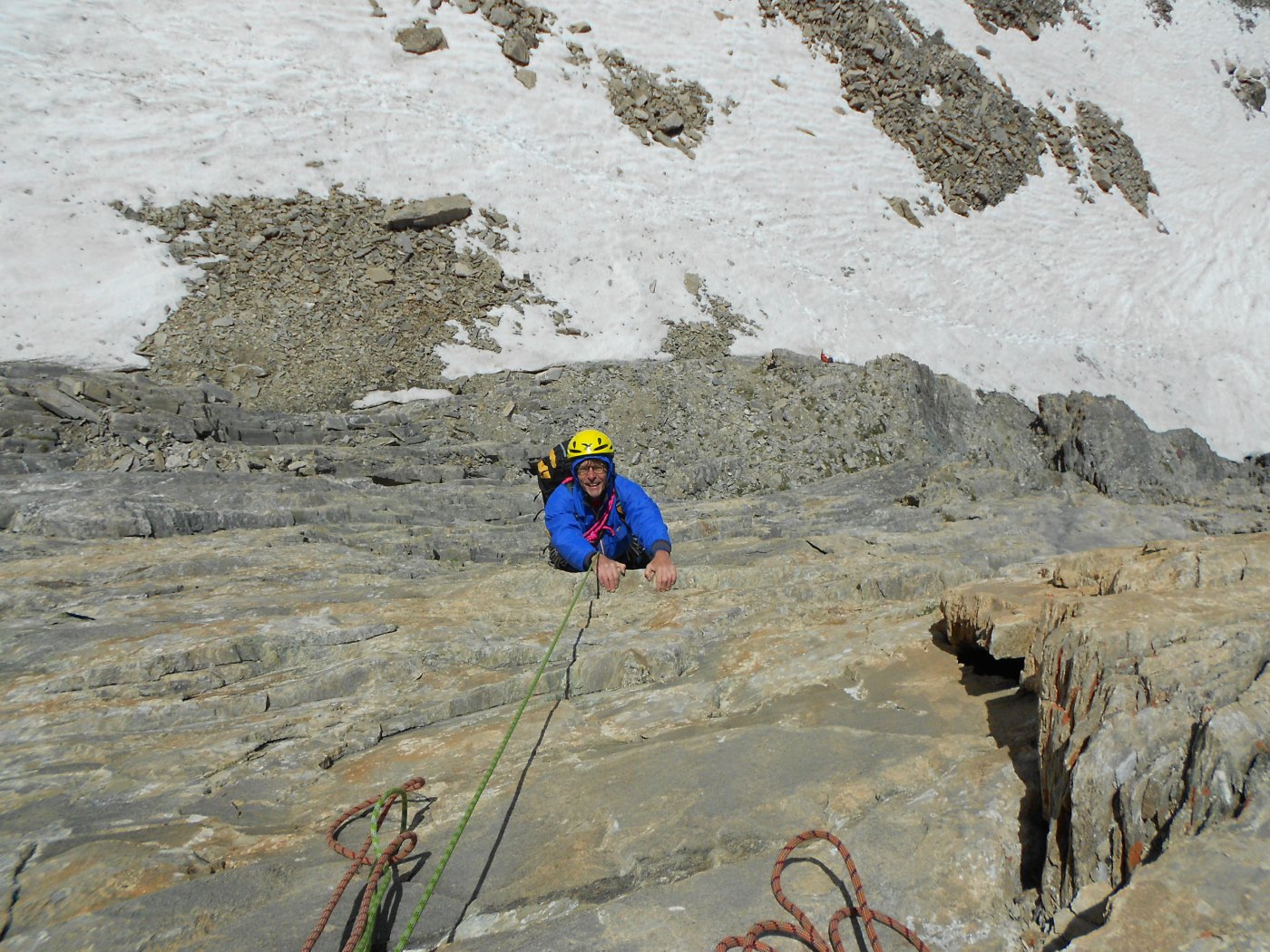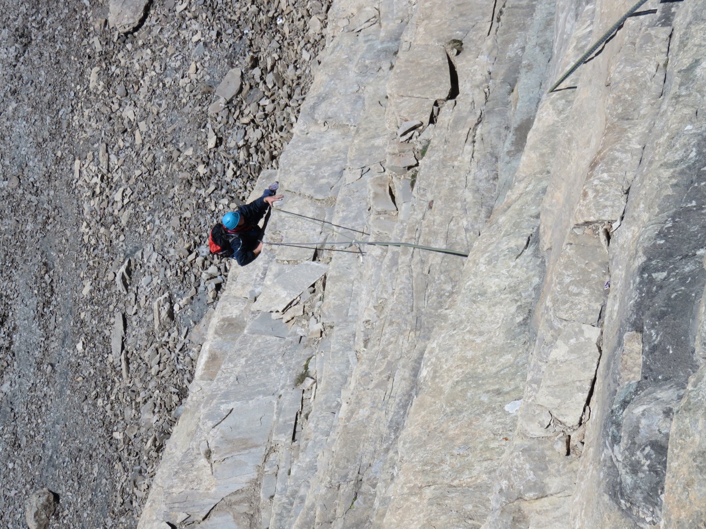 - 2° tiro: sempre obliquando verso destra per diversi metri poi si esce dritti sulla cengia, 5b/c 55/60 metri ,