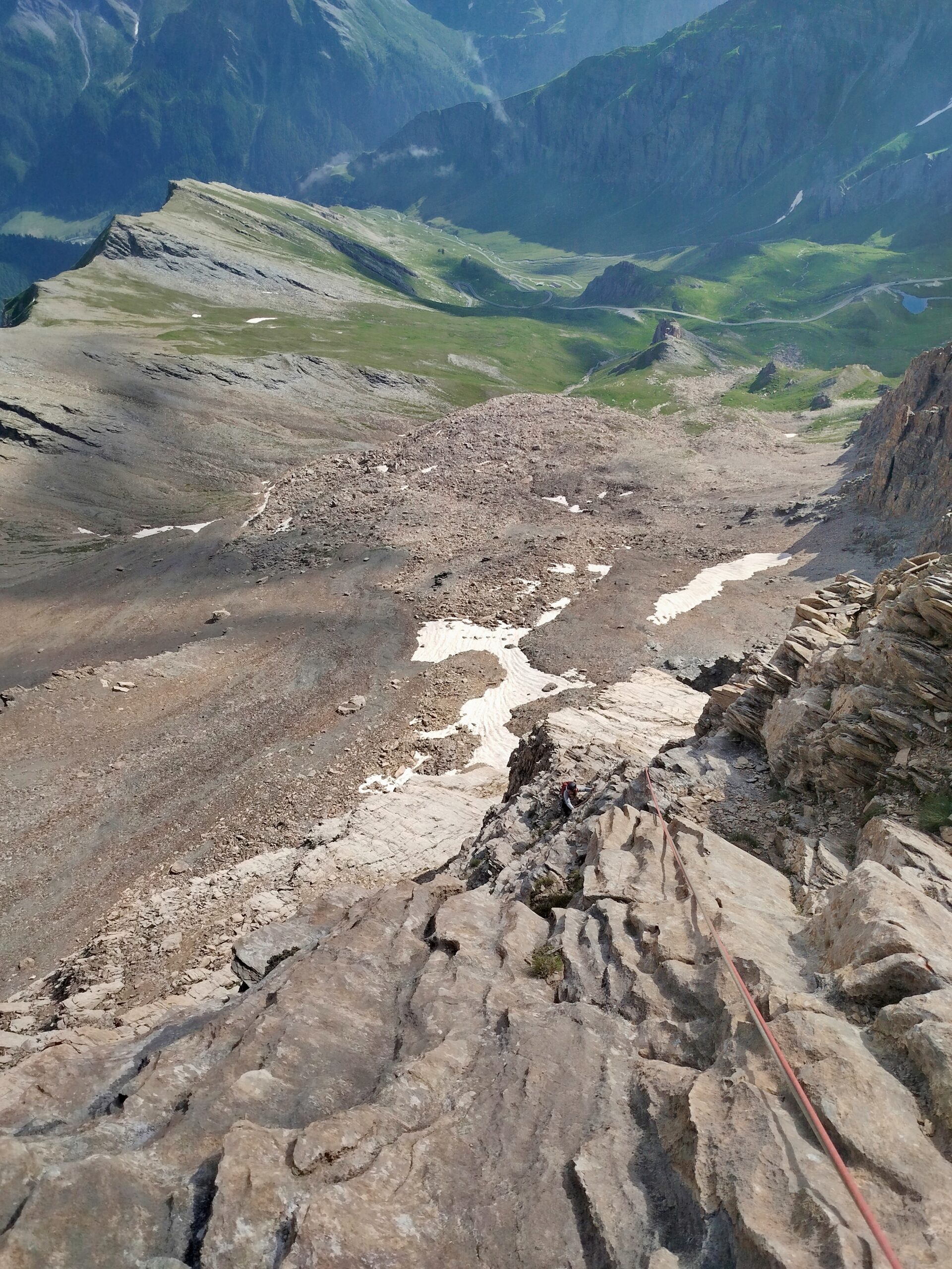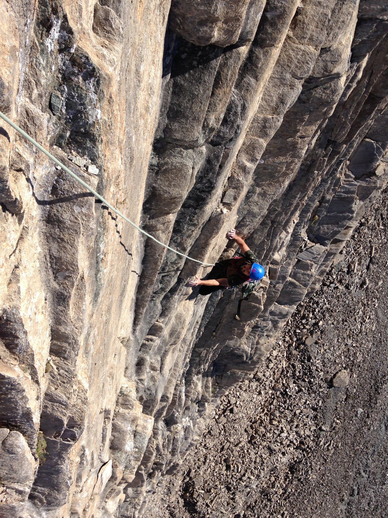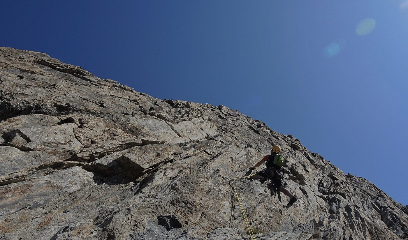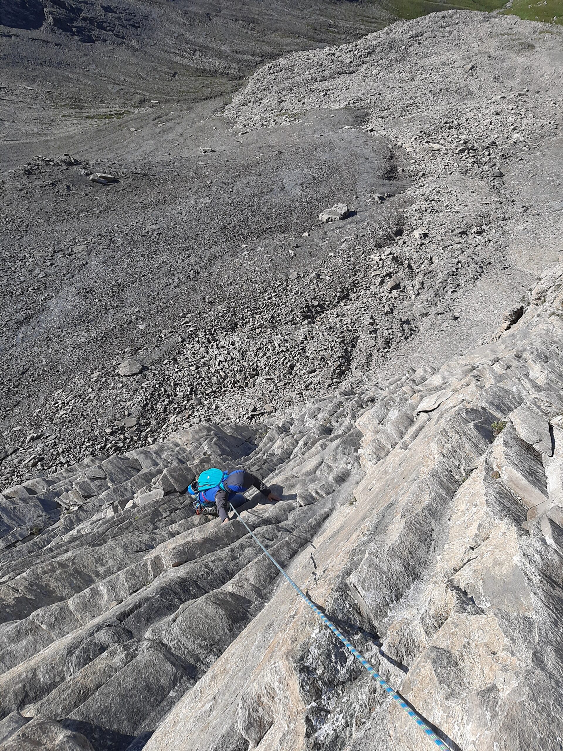 - 2° tiro: sempre obliquando verso destra per diversi metri poi si esce dritti sulla cengia, 5b/c 55/60 metri ,