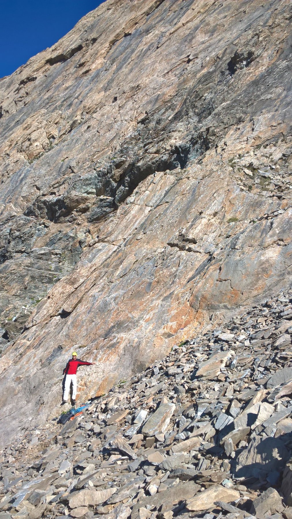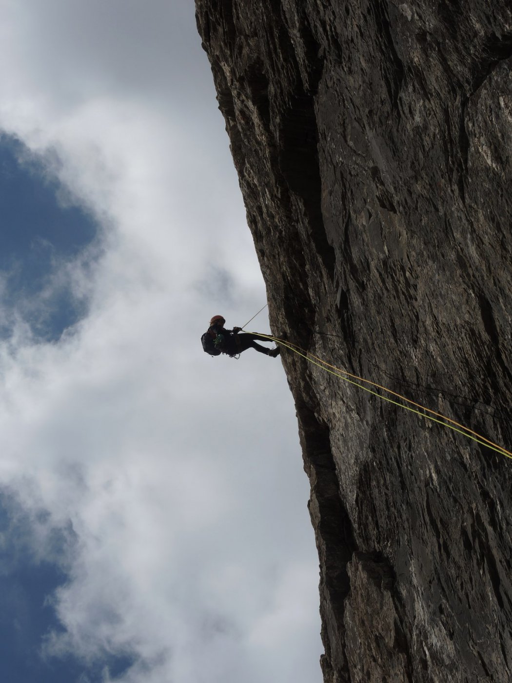 - 3° tiro: facile trasferimento fin sotto la parete superiore(1 spit alla base per assicurarsi), 40 metri e prestare molta attenzione a non muovere pietre specialmente se ci sono altre cordate