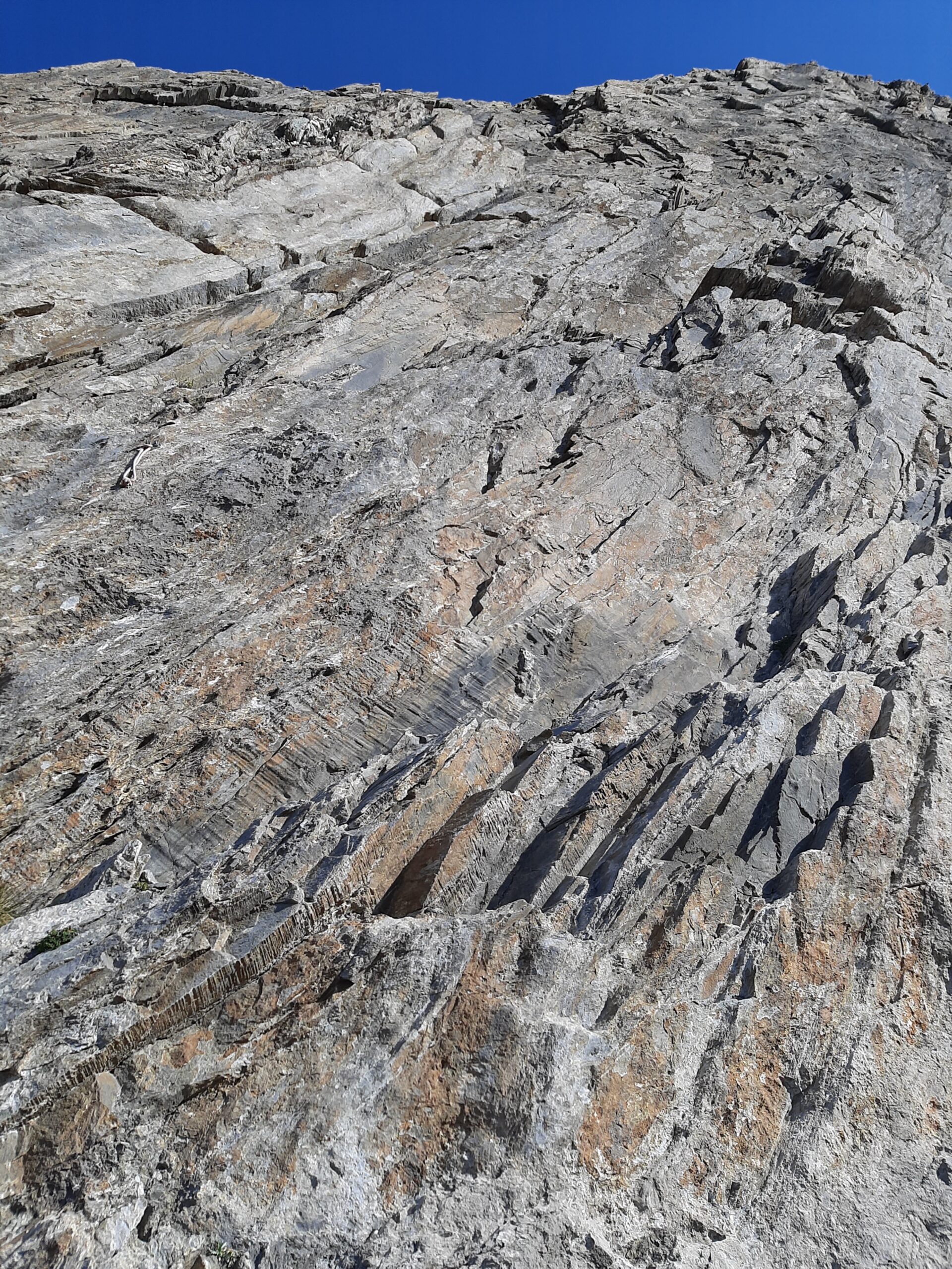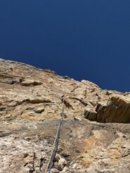 - 1° tiro: Si sale una decina di metri (spit con cordino)fino ad una cengia e si continua dritti(spit sempre visibili) ma sempre obliquando verso destra fino alla sosta(2 spit collegati con cordone e maillon), difficoltà 5c circa 60 metri