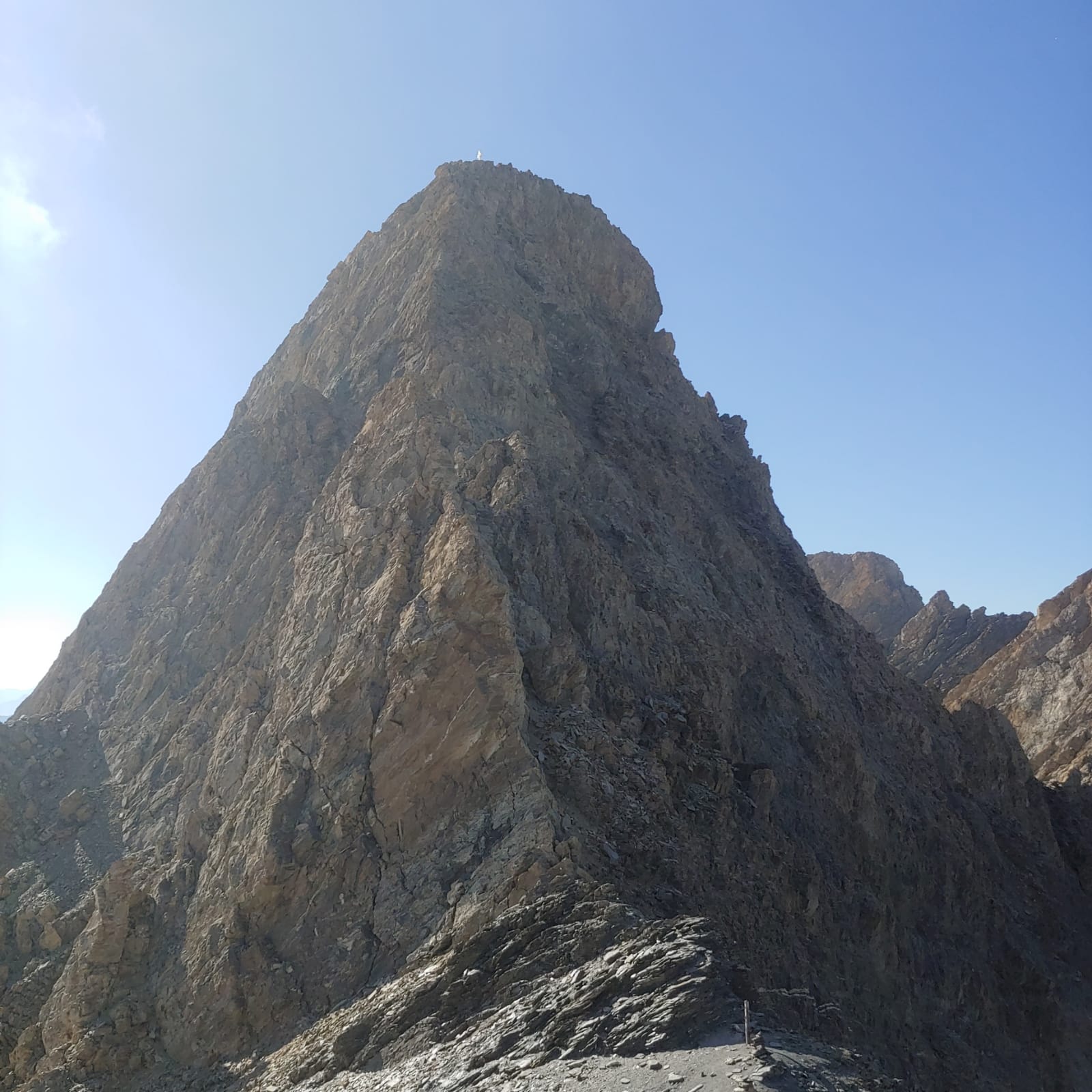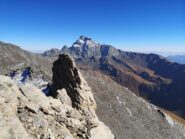 - 6° tiro: decisamente a destra poi, o si continua ancora obliquando verso destra per facili cenge o si sale sulla cresta, si può fare sosta direttamente sulla croce di vetta(consigliato) o su due spit una decina di metri prima, 4 e 3 , circa 60metri(fino alla croce di vetta).