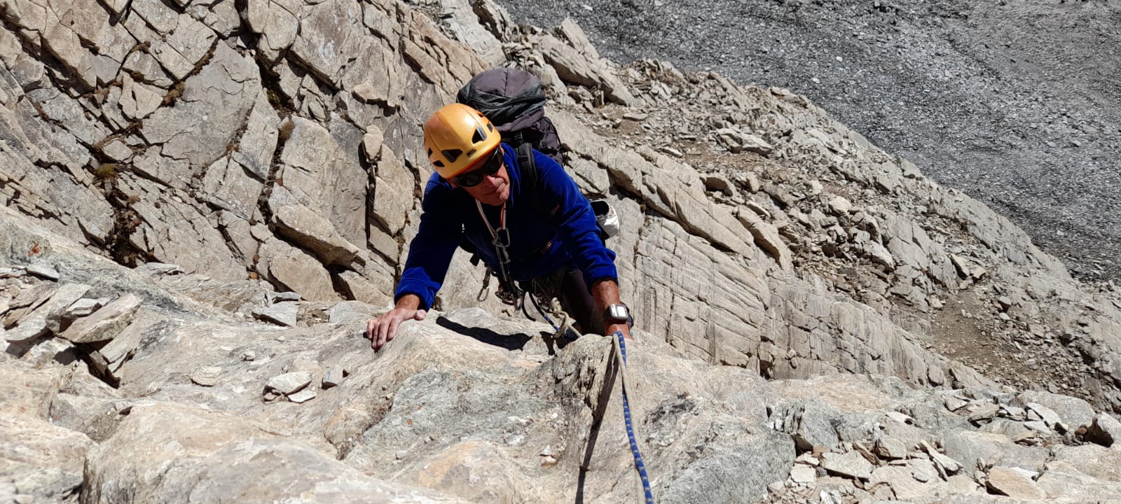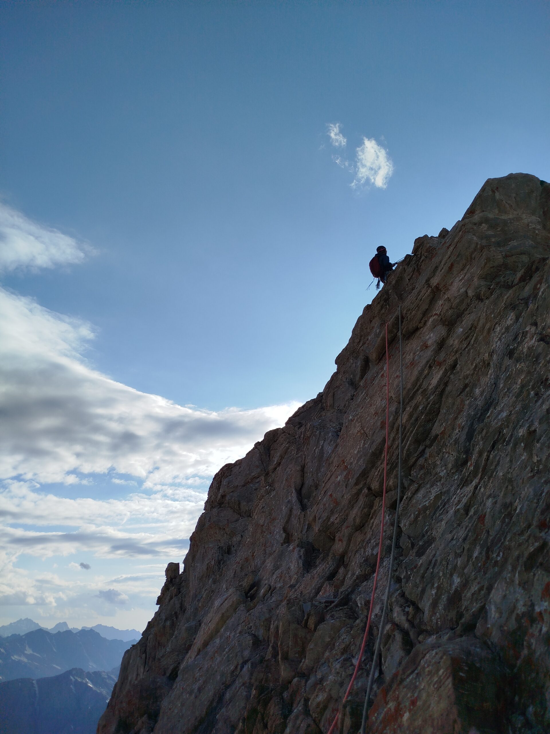 Via ben protetta a spit marchiati FFME, sono sufficienti anche se distanziati, in caso possono essere utili 2/3 friends medi per integrare se non ci si fida troppo della qualità della roccia, che comunque nonostante le apparenze (calcescisti) è abbastanza buona e con ottima aderenza, ma bisogna valutare a volte dove si passa e stare delicati sulle genge, casco indispensabile ovviamente... comunque un bel modo per raggiungere questa bella vetta!