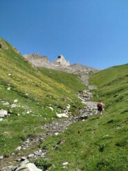 Dal lago imboccare il sentiero per la Sella d' Asti fino a quota circa 3000 m (1 h), un centinaio di metri o poco più prima della Sella d'Asti abbastanza a centro parete si nota una linea di spit e pure la prima sosta, e al primo spit in partenza si nota un cordino ora di colore rosa. (non sbagliarsi ad andare a cercare troppo a sinistra perchè vicino allo spigolo sud-ovest dovrebbe esserci un' altra via a spit ed anche una sua variante che forse non sono troppo sicure per la qualità della roccia)