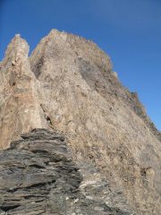 bella gita in compagnia di marco. da non sottovalutare per le rocce instabili e l’esposizione. oggi c’era un pò di verglas e neve all’inizio e per questo abbiamo proceduto in cordata attrezzando per non rischiare troppo. bello l’ultimo tratto di cresta. panorama mozzafiato e soltanto un’altra cordata al pic. sicuramente meritevole