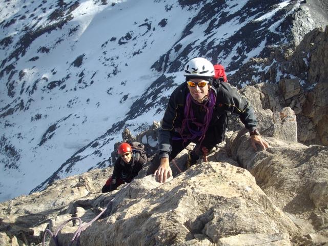 Scesi con due brevi doppie lungo la cresta di salita anche se si può scendere senza troppe difficoltà disarrampicando.