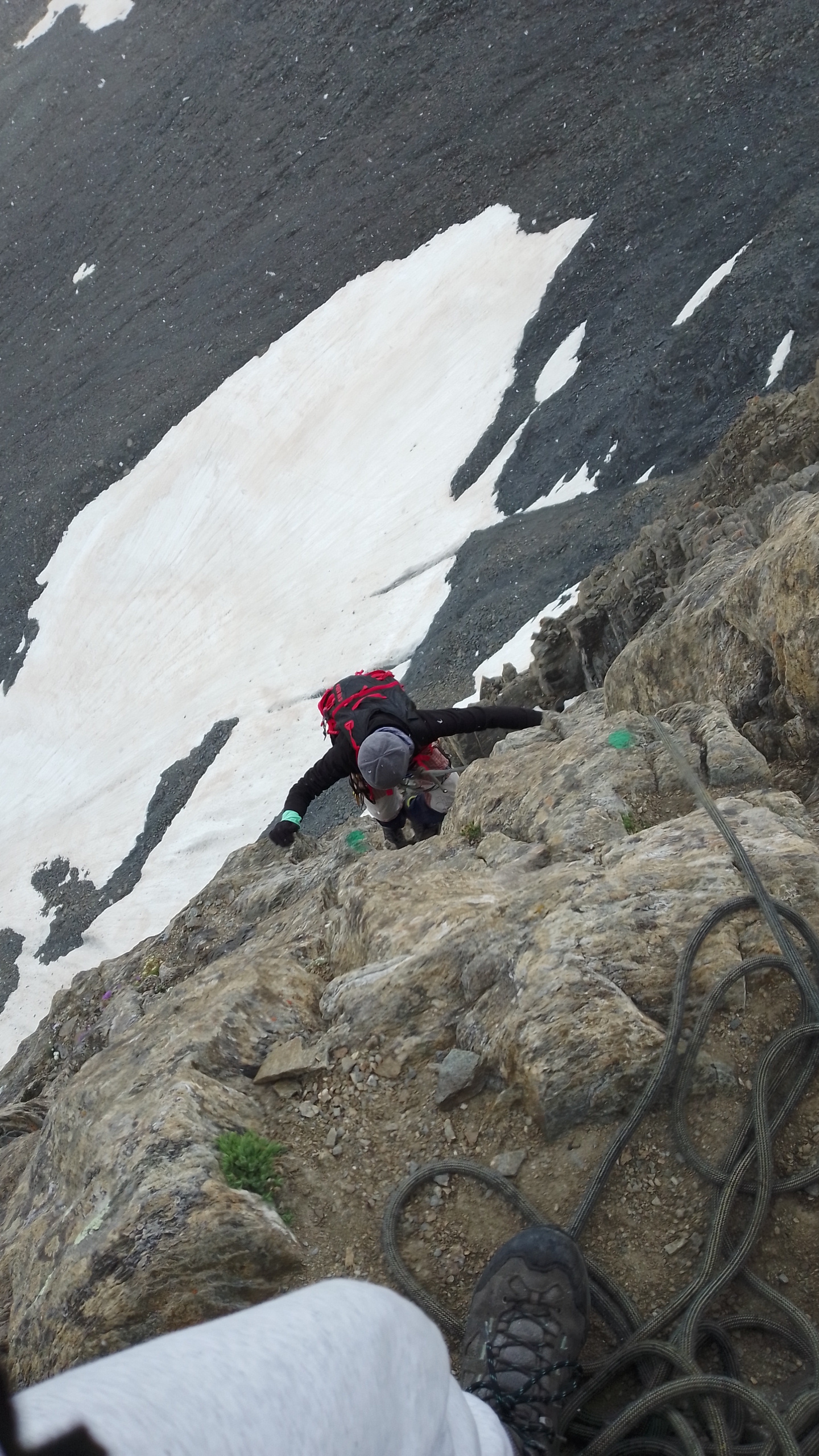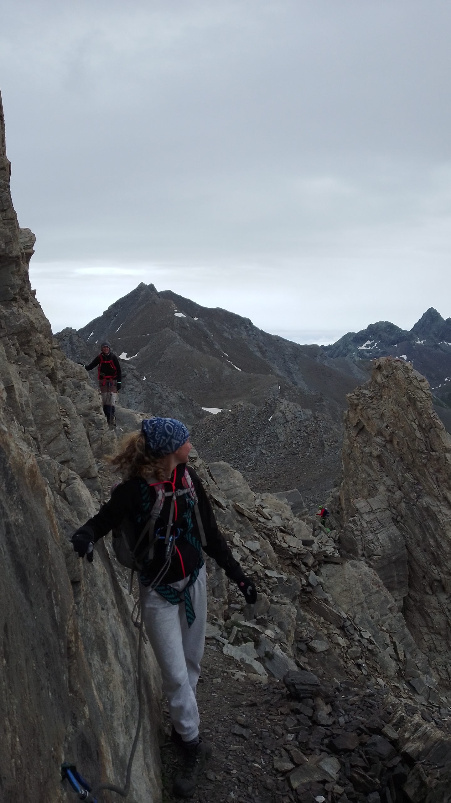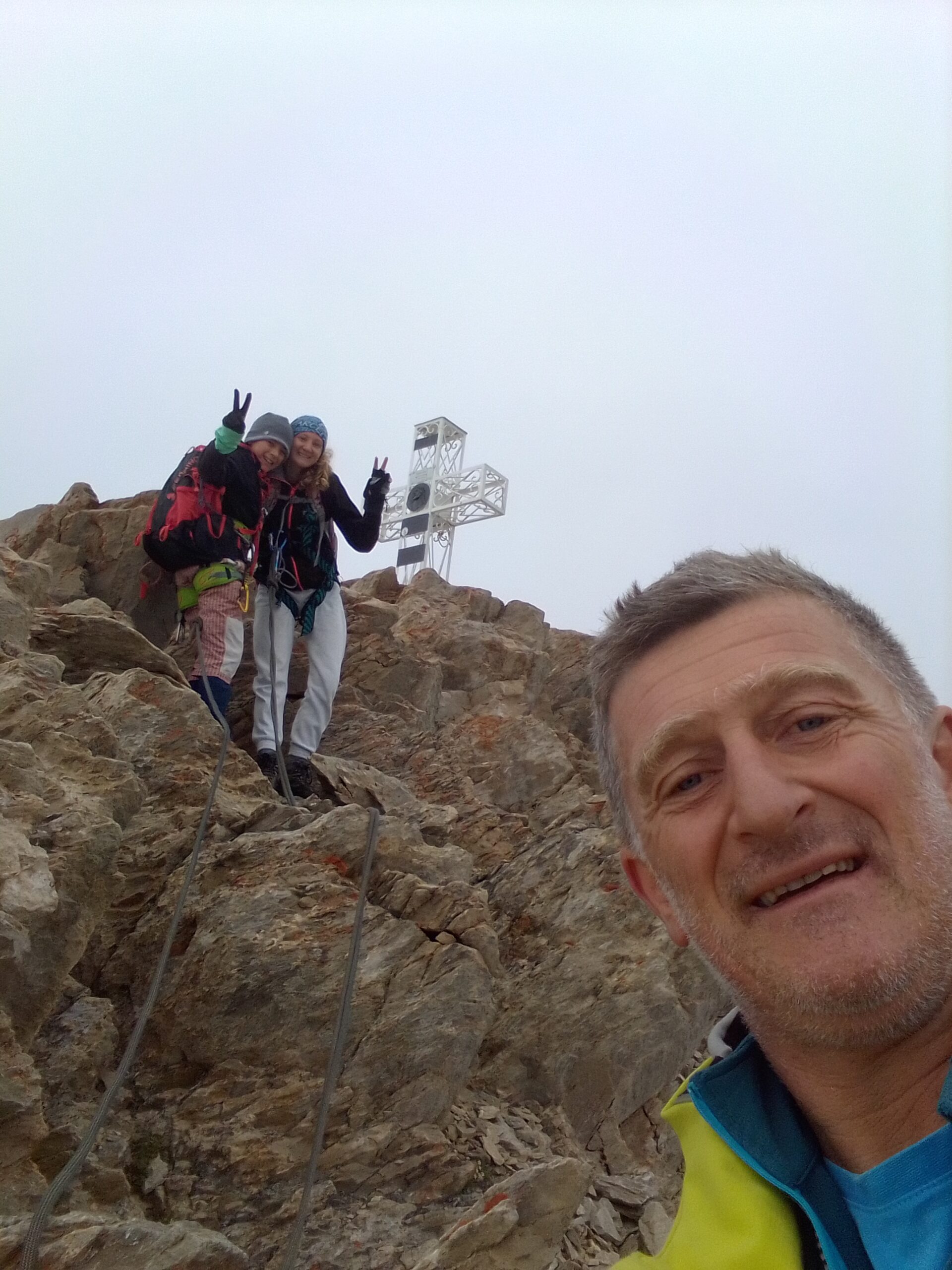 Oggi Irene e Mara al colle ,io proseguito con Elena e Luigi legati in conserva protetta si sono distinti bene , arrivo in cima peggioramento in agguato (4fiocchi di neve), a inumidito e messo carattere ai figli,che ho calato x facilitare la discesa mai da sottovalutare,anche se dove passa la via la roccia e buona (sarà almeno 20 anni fa’ che lo salito!!),poi rientro al laghetto dove ci aspettava il minivan x concederci un pranzo delle 14 mentre fuori infuriava il vento sopraggiunto nel mentre a liberare il cielo