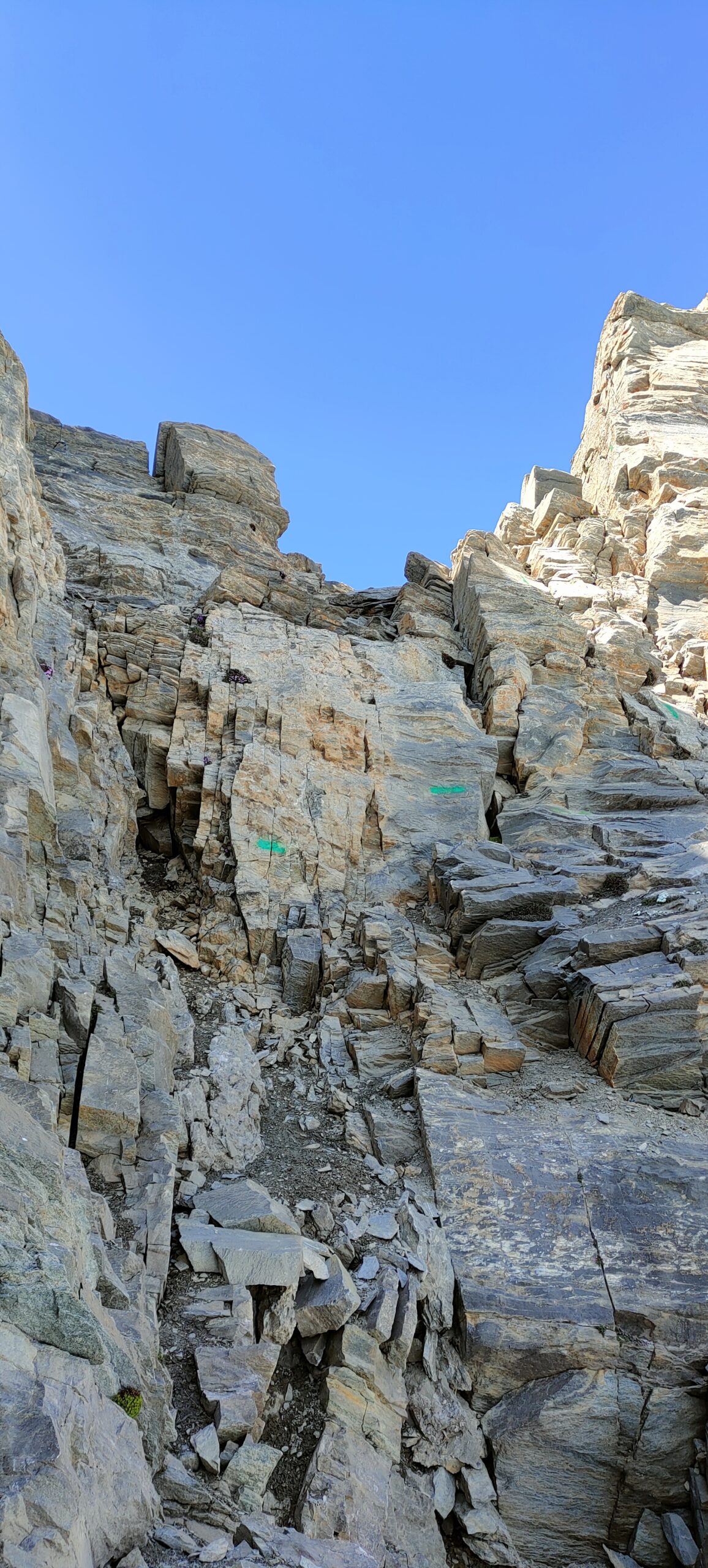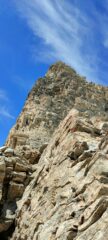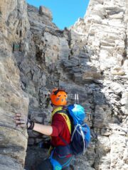 Il tratto alpinistico è divertente anche se abbastanza corto. Tecnicamente i passi sono facili (la maggior parte intorno al II/II+) ma bisogna fare attenzione all’esposizione che nell’ultimo tratto è notevole. Fatta una doppia da 30 metri al ritorno (siamo scesi di circa 20 metri lungo la cresta e poi ci siamo calati dal terrazzino dove è presente un anello praticamente nuovo)