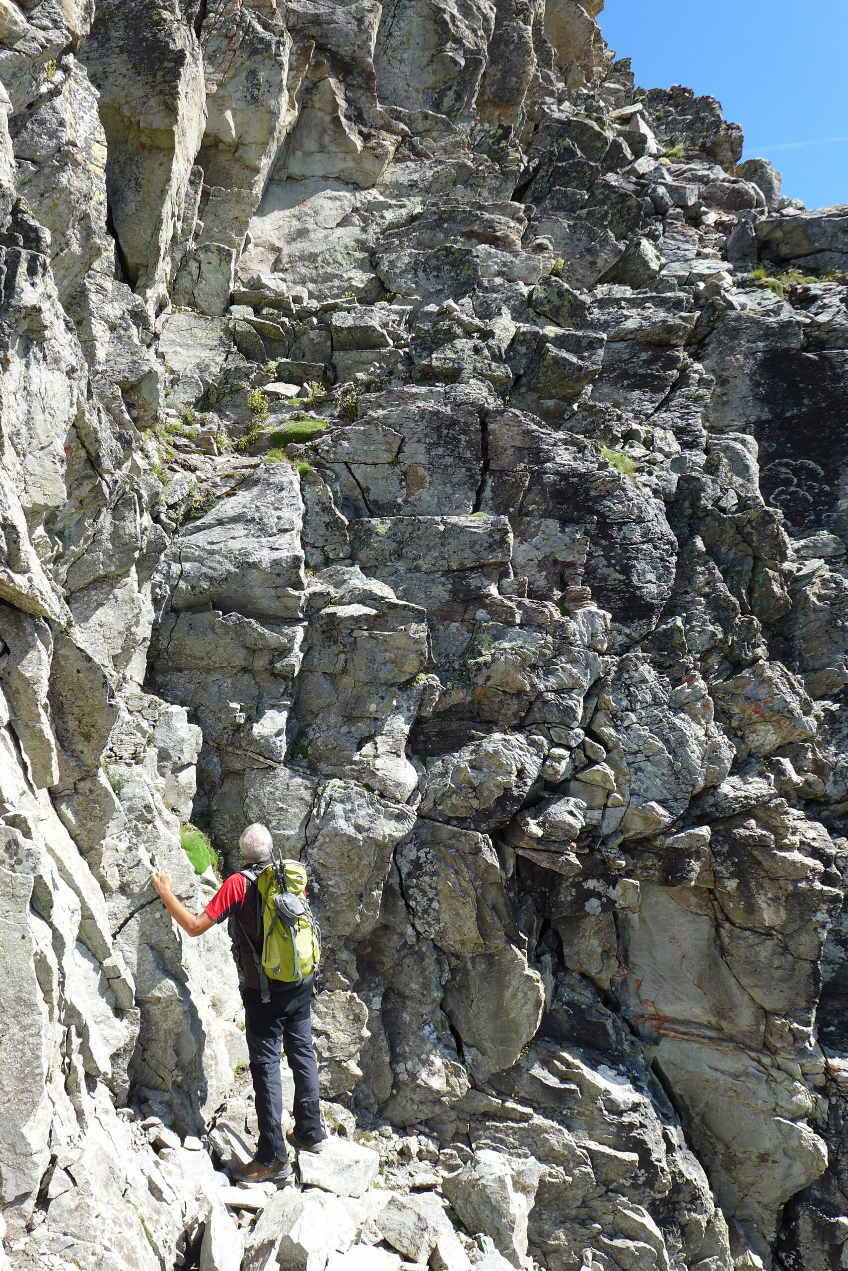Piegando a destra, il sentiero risale una ripido pendio detritico e di rocce montonate, guadagnando quota rapidamente, poi si incunea in un valloncello di pietroni e lastronate, con alcune diagonali prima a destra e poi a sinistra in direzione di una grande croce di legno (utile riferimento per la salita in caso di scarsa visibilità).