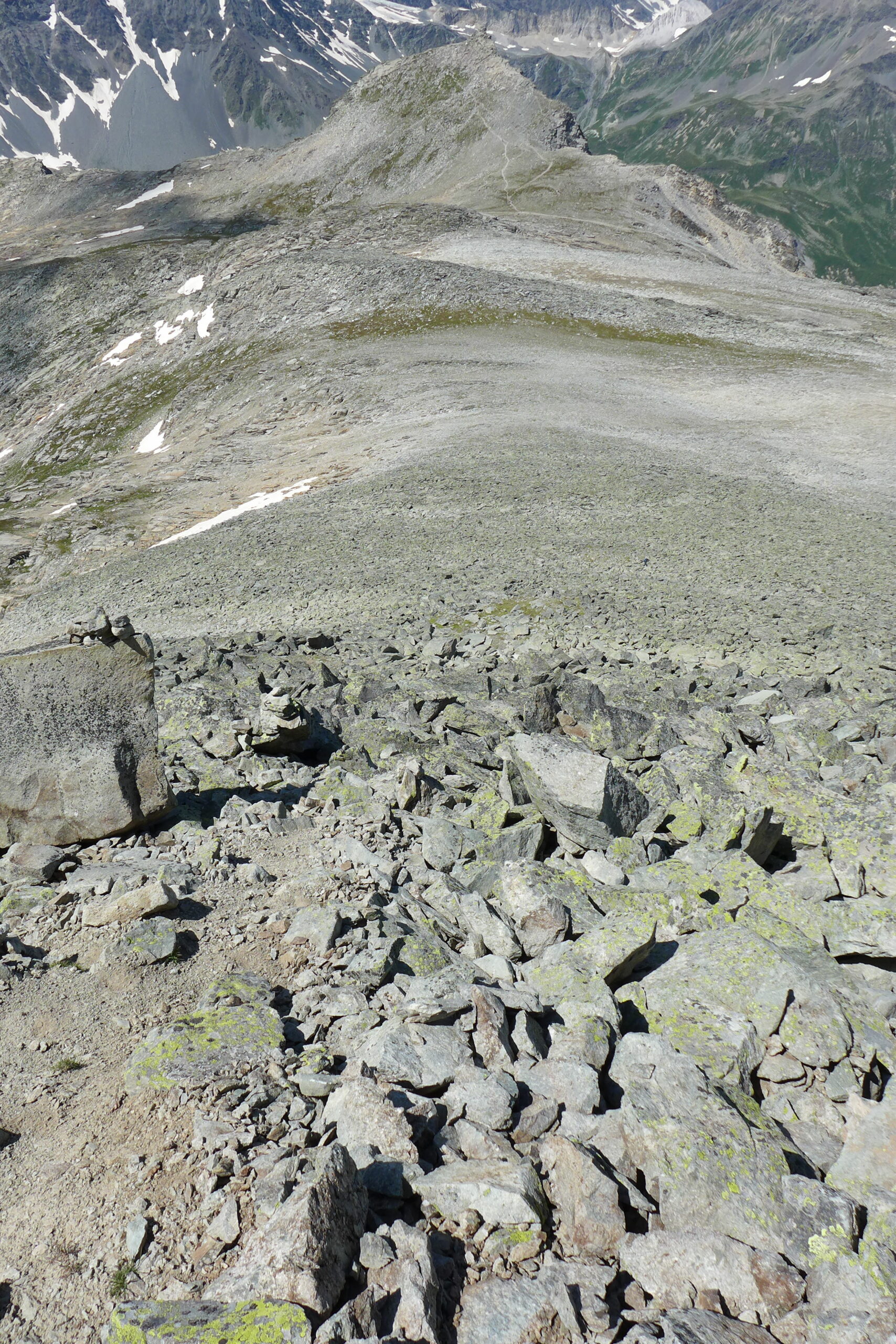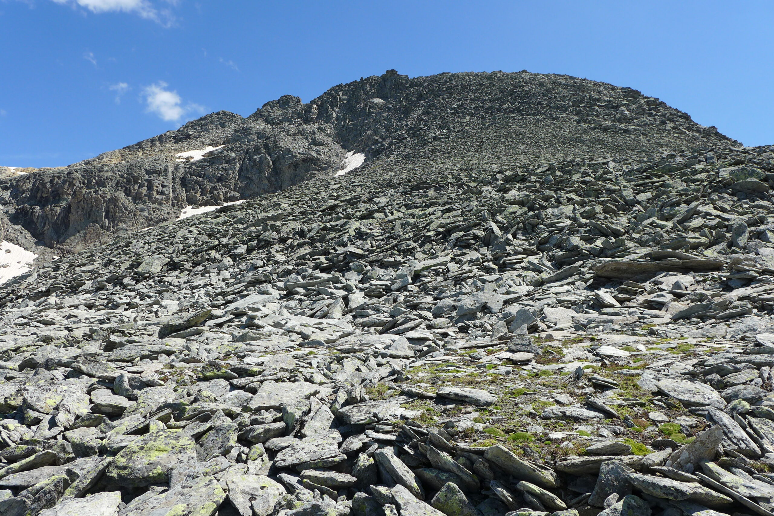 Volgendo a destra (est) su terreno ripido con rocce mobili di notevoli dimensioni, si raggiunge il filo di cresta e seguendo qualche raro ometto con tratti esposti e l’uso delle mani si giunge in vetta.