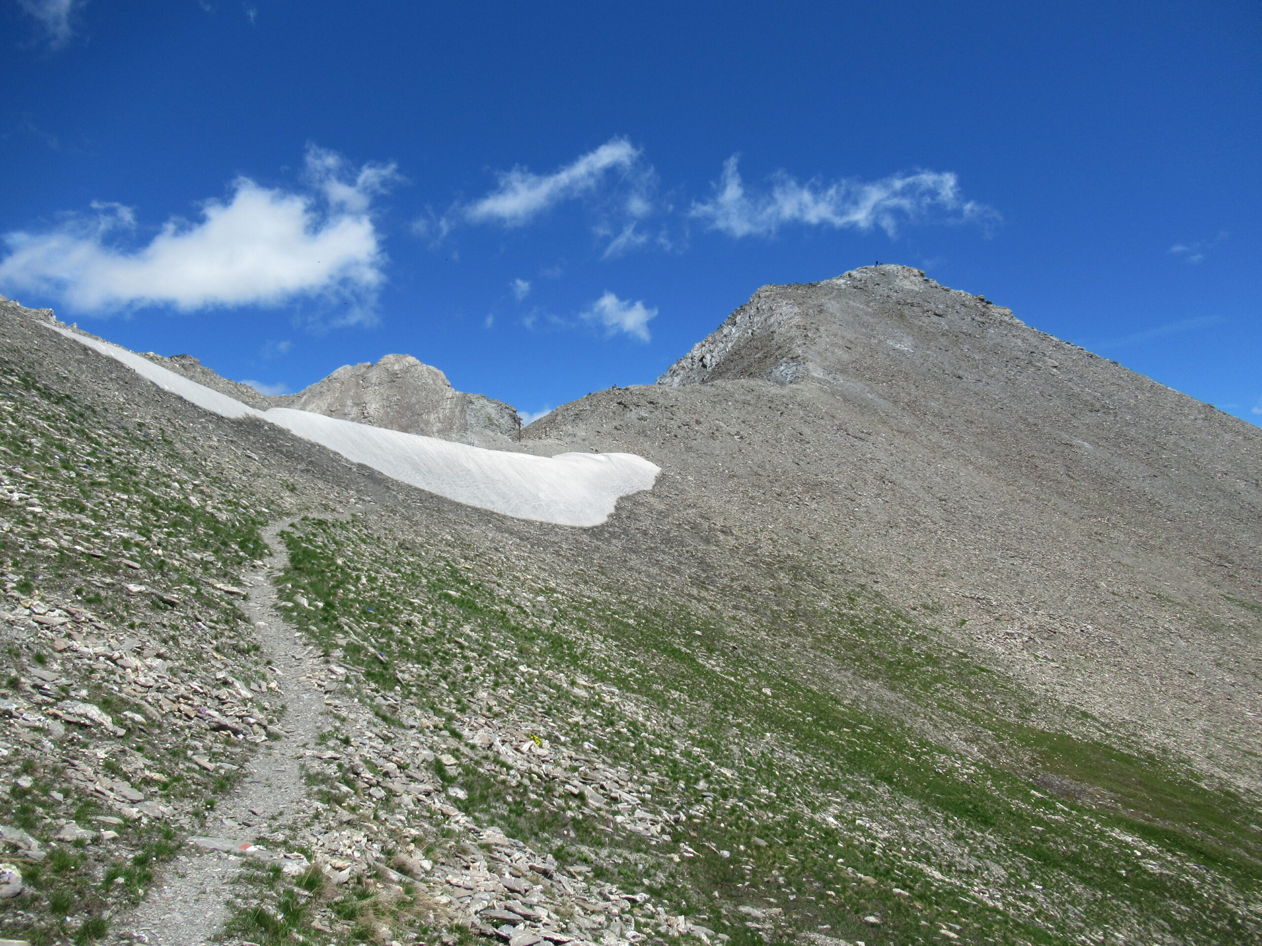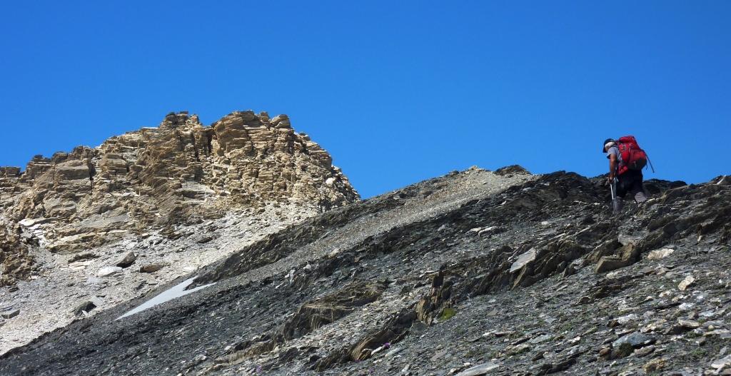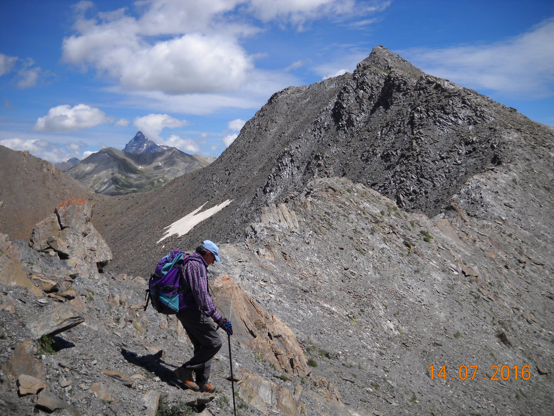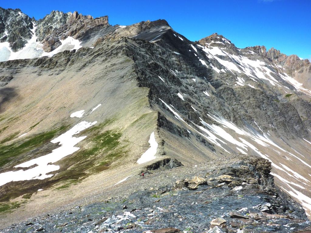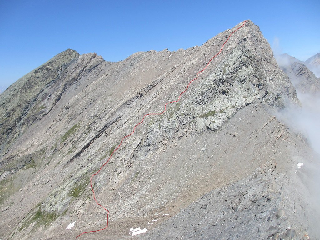 Raggiunto un ricovero poco sotto il Colle dell’Autaret, dove i prati lasciano il posto alle pietraie, si abbandona la traccia di sentiero salendo in diagonale verso destra su un ripido pendio di terra e detriti raggiungendo la cresta Ovest della nostra meta a monte di 2 evidenti affioramenti rocciosi.