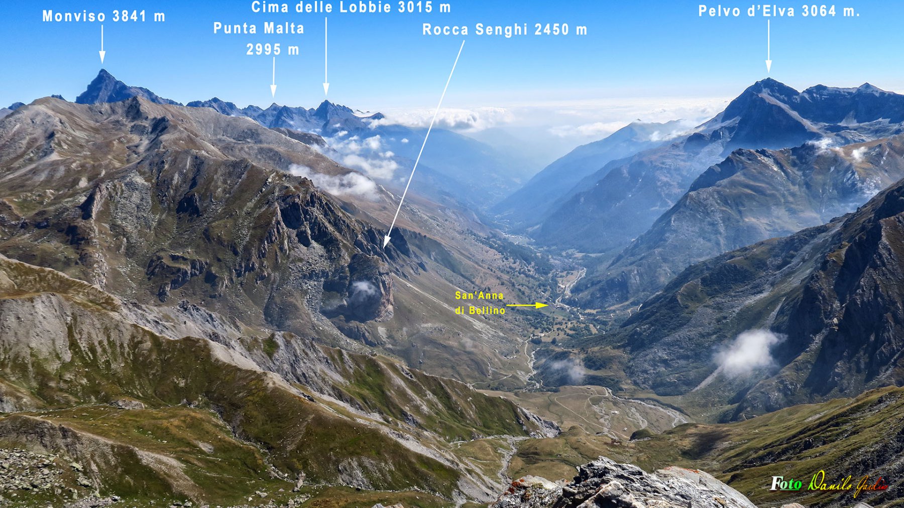 Il panorama, molto vasto, è limitato a Nord dal vicino e più alto Pelvo, mentre a sud lo sguardo si spinge fino alle Alpi Marittime.