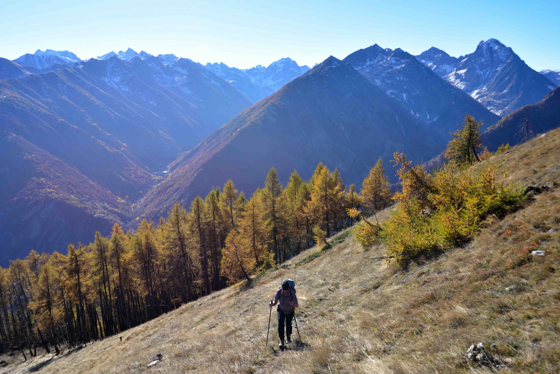 La strada segue l’andamento del pendio compiendo un lungo traverso: di fronte appare il colle Neraissa dove sono presenti un moderno alpeggio e una caserma in stato di abbandono.