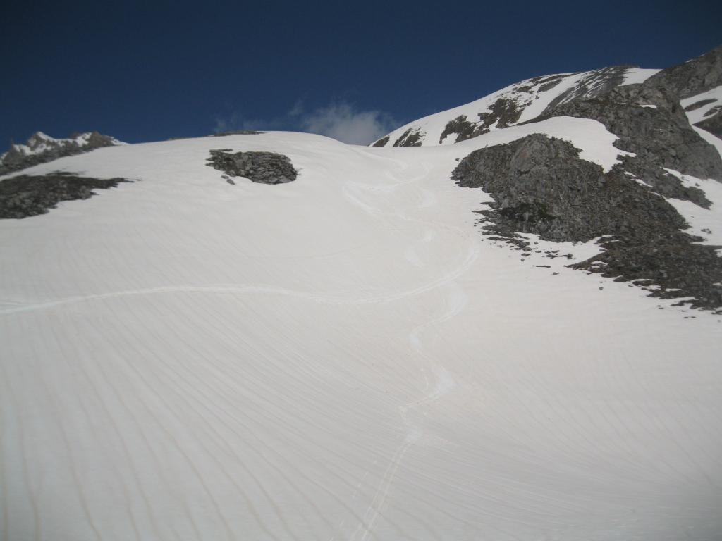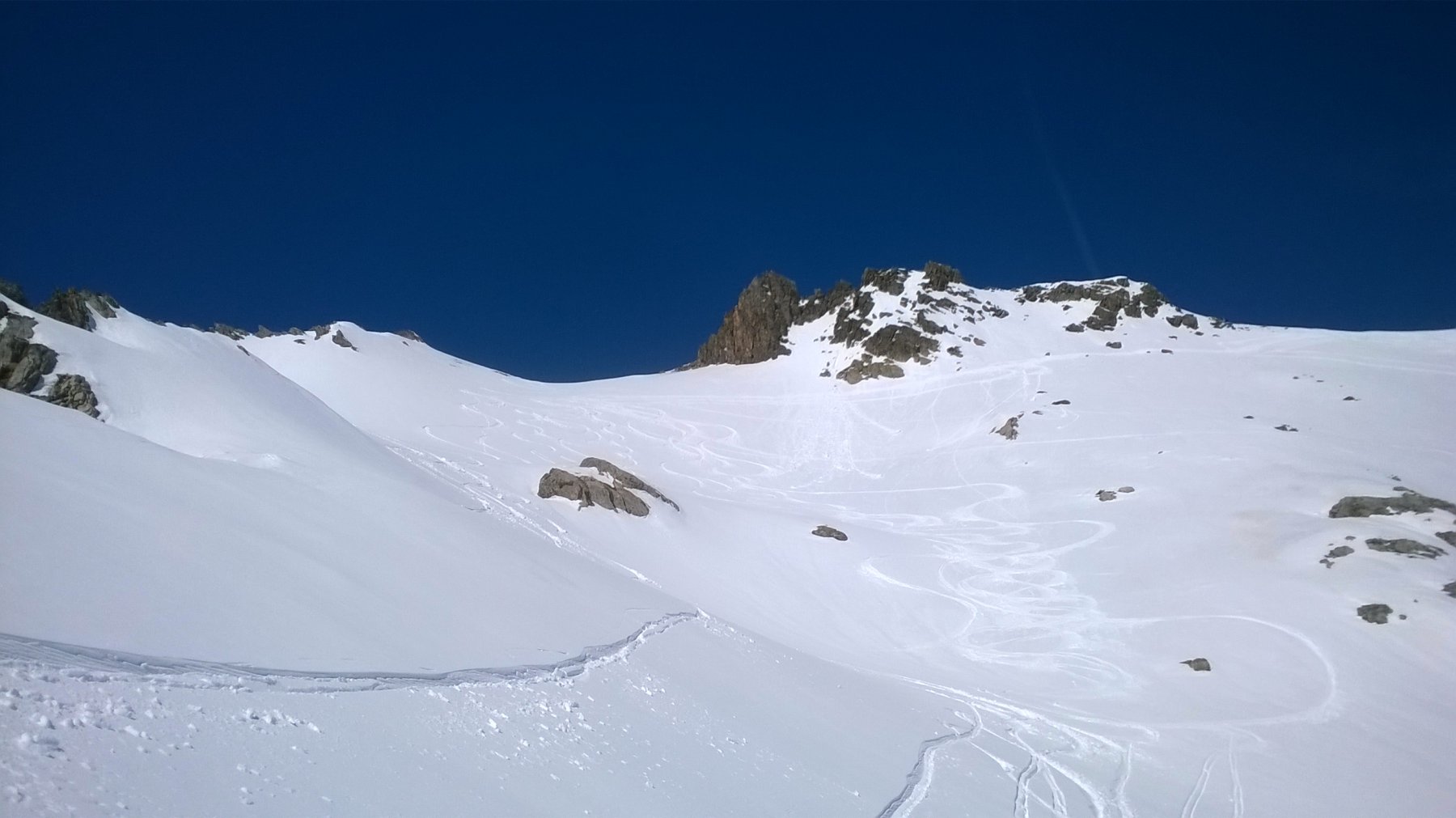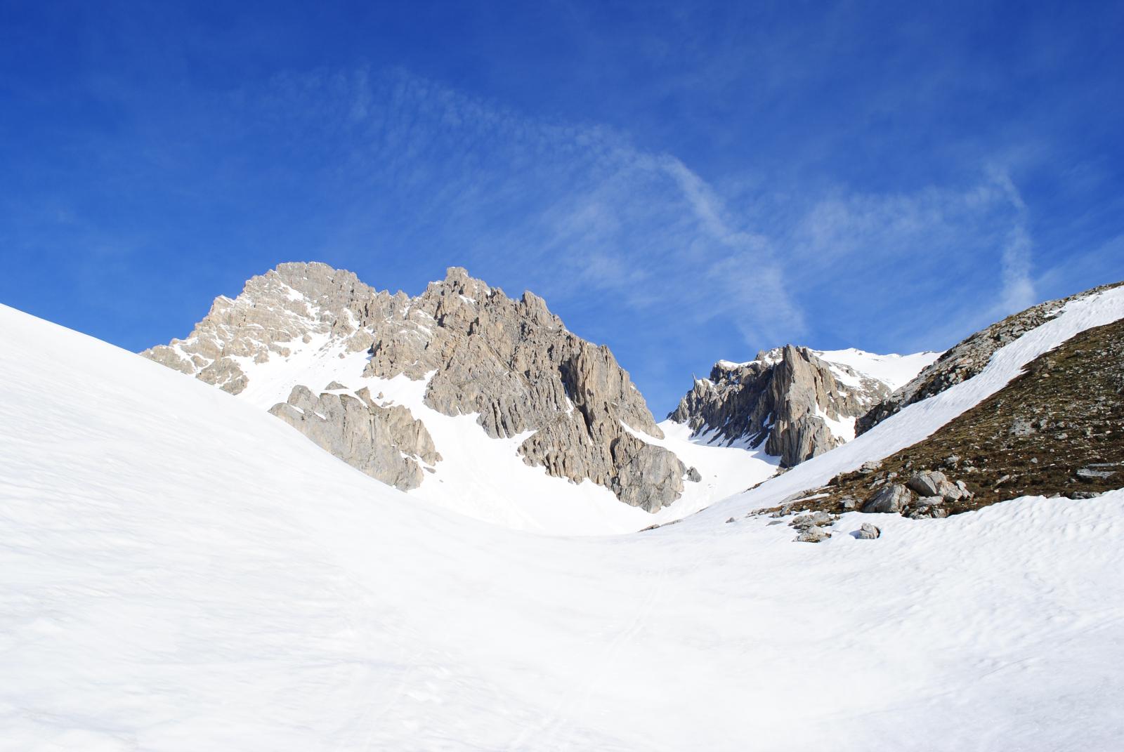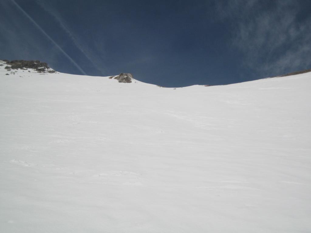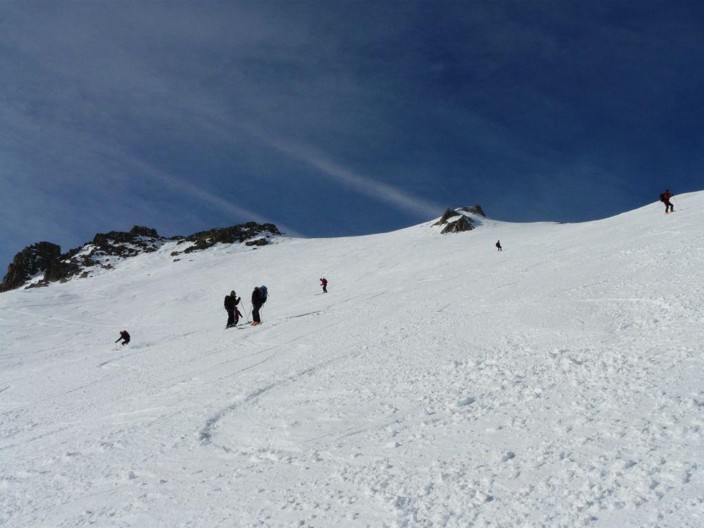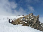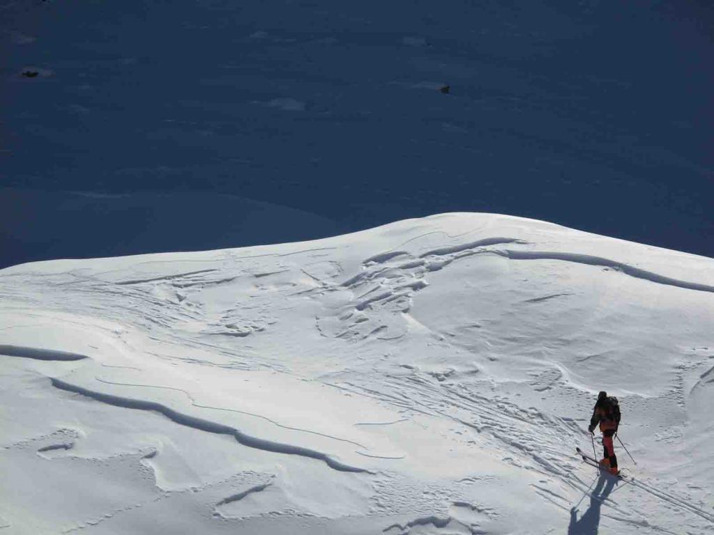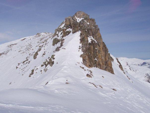 Da qui il percorso diventa alpinistico: si scende la cresta nevosa che si restringe e forma un’insellatura tra le due vette. Si supera un salto roccioso (aggirabile scendendo a sx su ripido traveso) che porta sul filo di cresta ed alla calotta nevosa finale (croce di ferro).