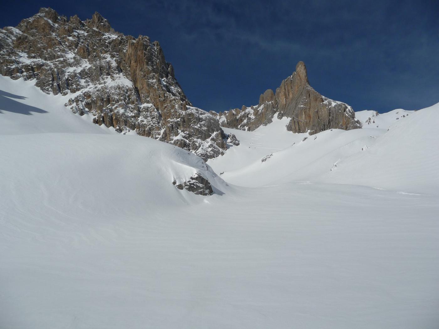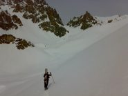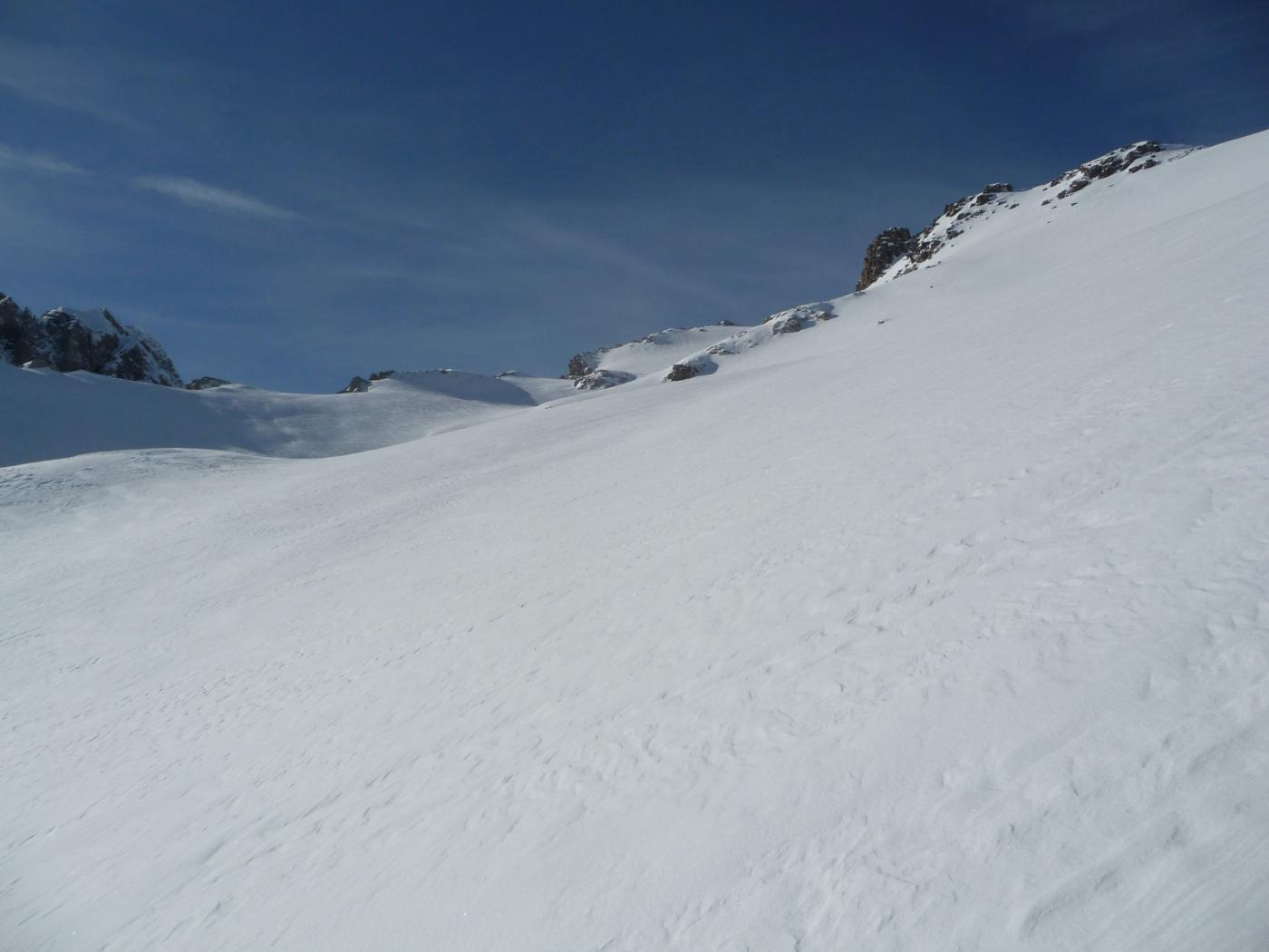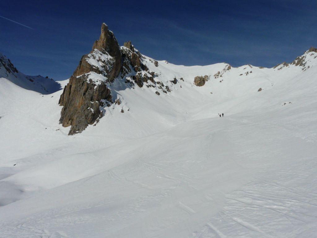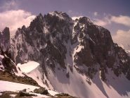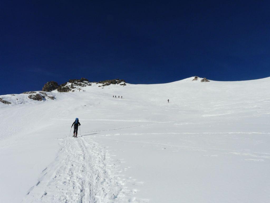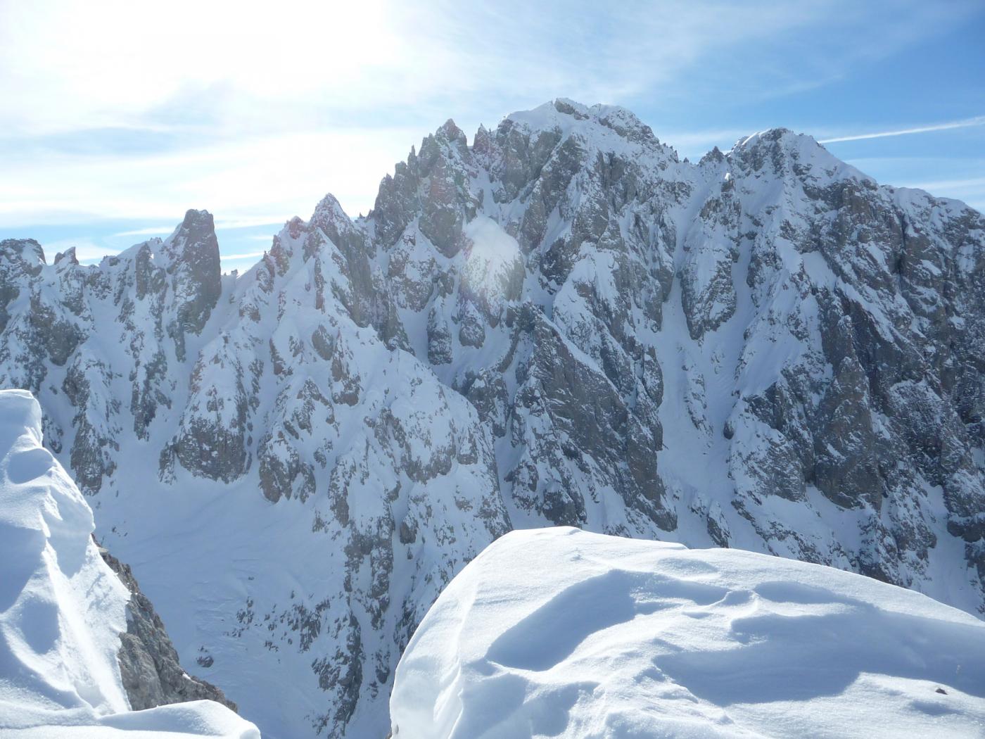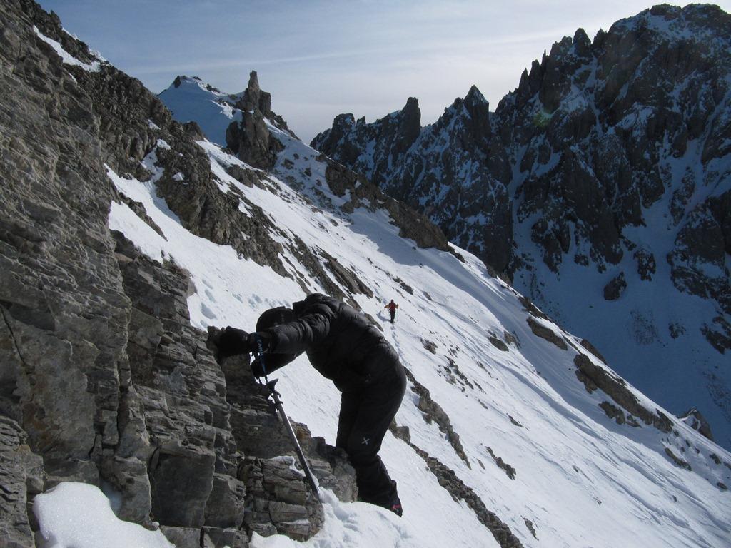 Da qui il percorso diventa alpinistico: si scende la cresta nevosa che si restringe e forma un’insellatura tra le due vette. Si supera un salto roccioso (aggirabile scendendo a sx su ripido traveso) che porta sul filo di cresta ed alla calotta nevosa finale (croce di ferro).
