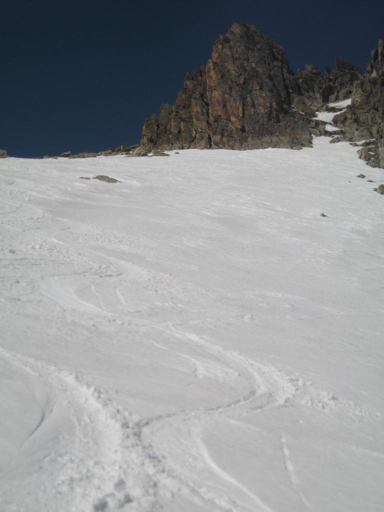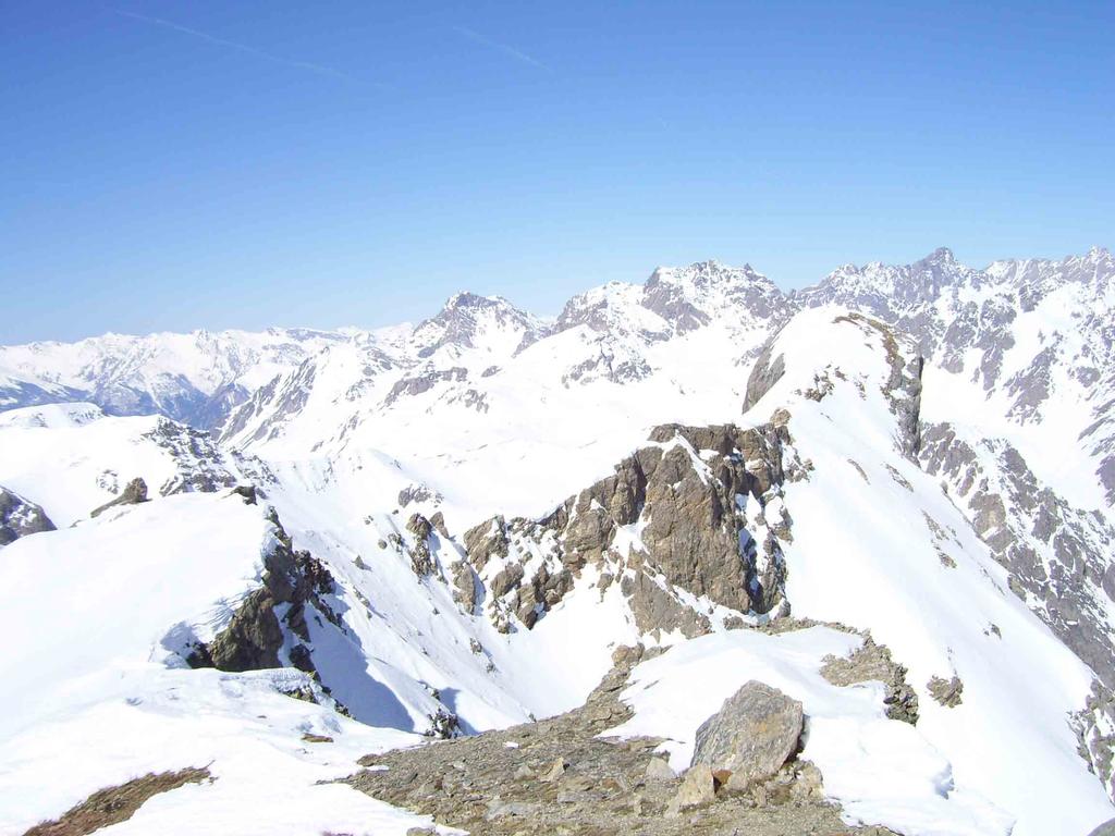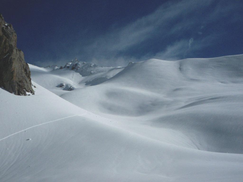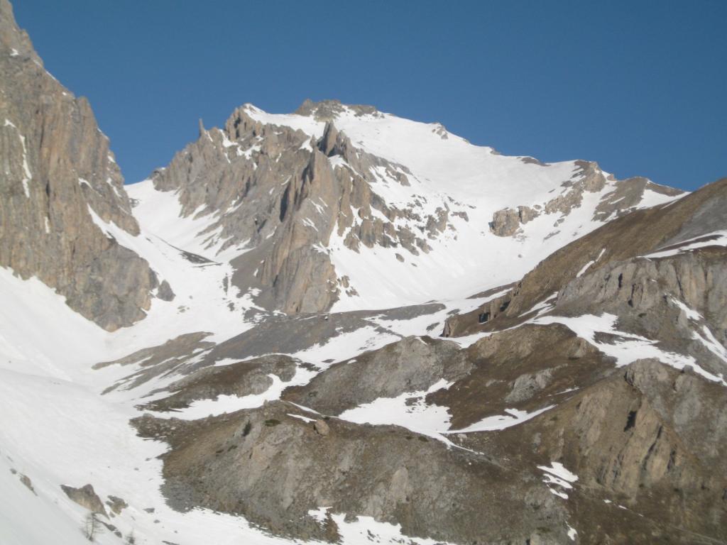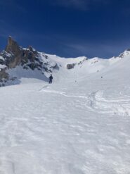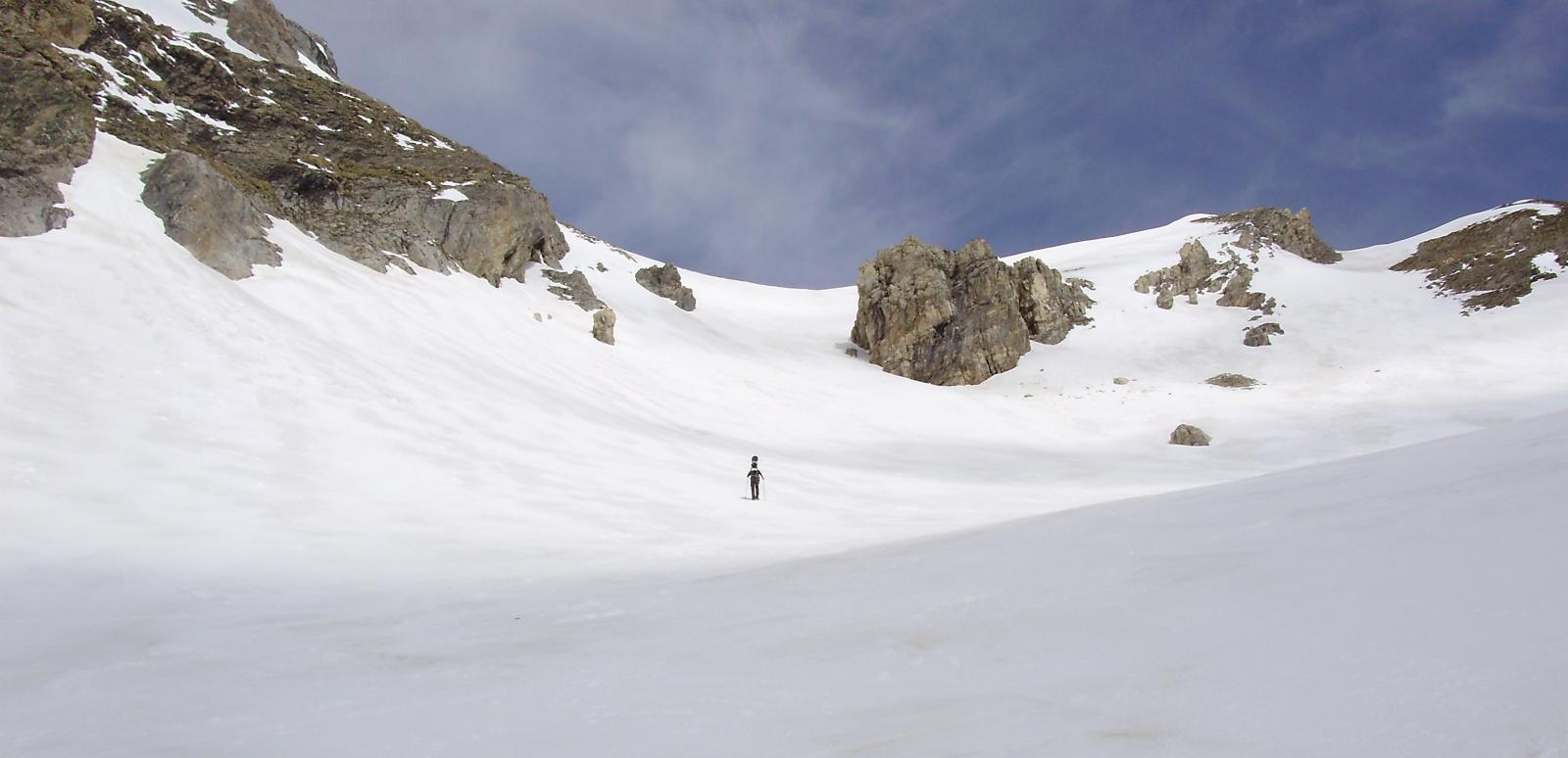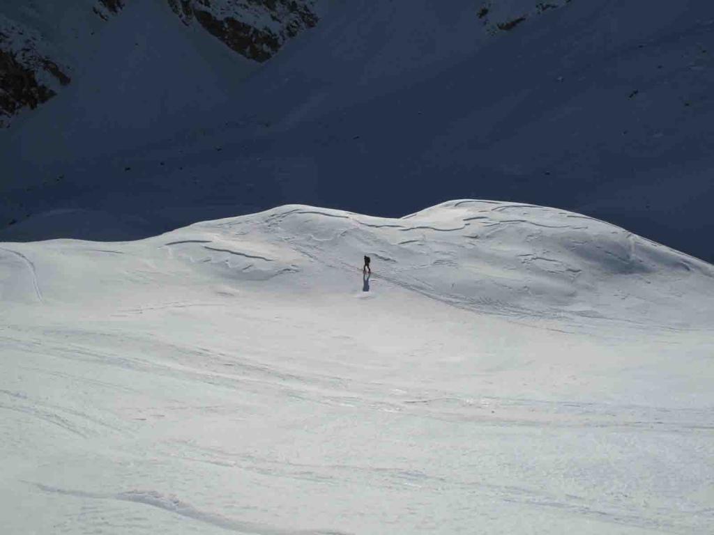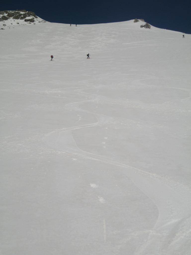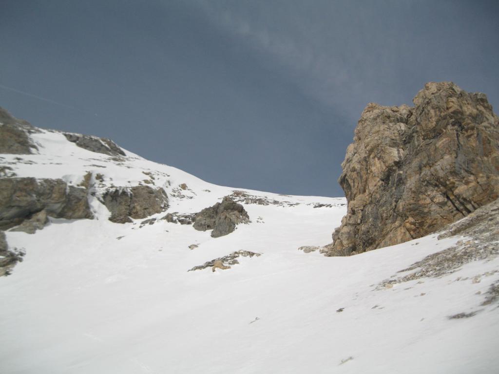 Da qui il percorso diventa alpinistico: si scende la cresta nevosa che si restringe e forma un’insellatura tra le due vette. Si supera un salto roccioso (aggirabile scendendo a sx su ripido traveso) che porta sul filo di cresta ed alla calotta nevosa finale (croce di ferro).
