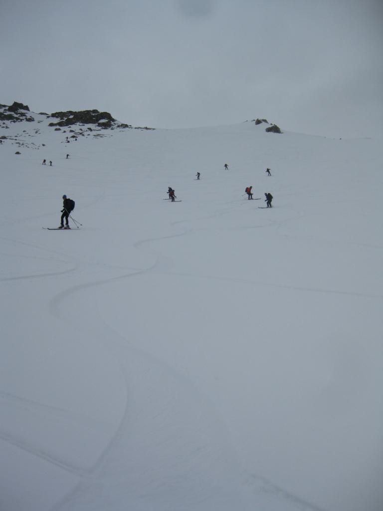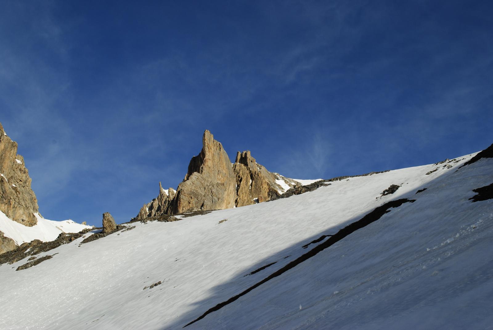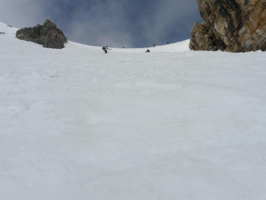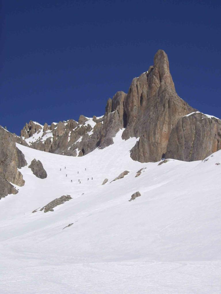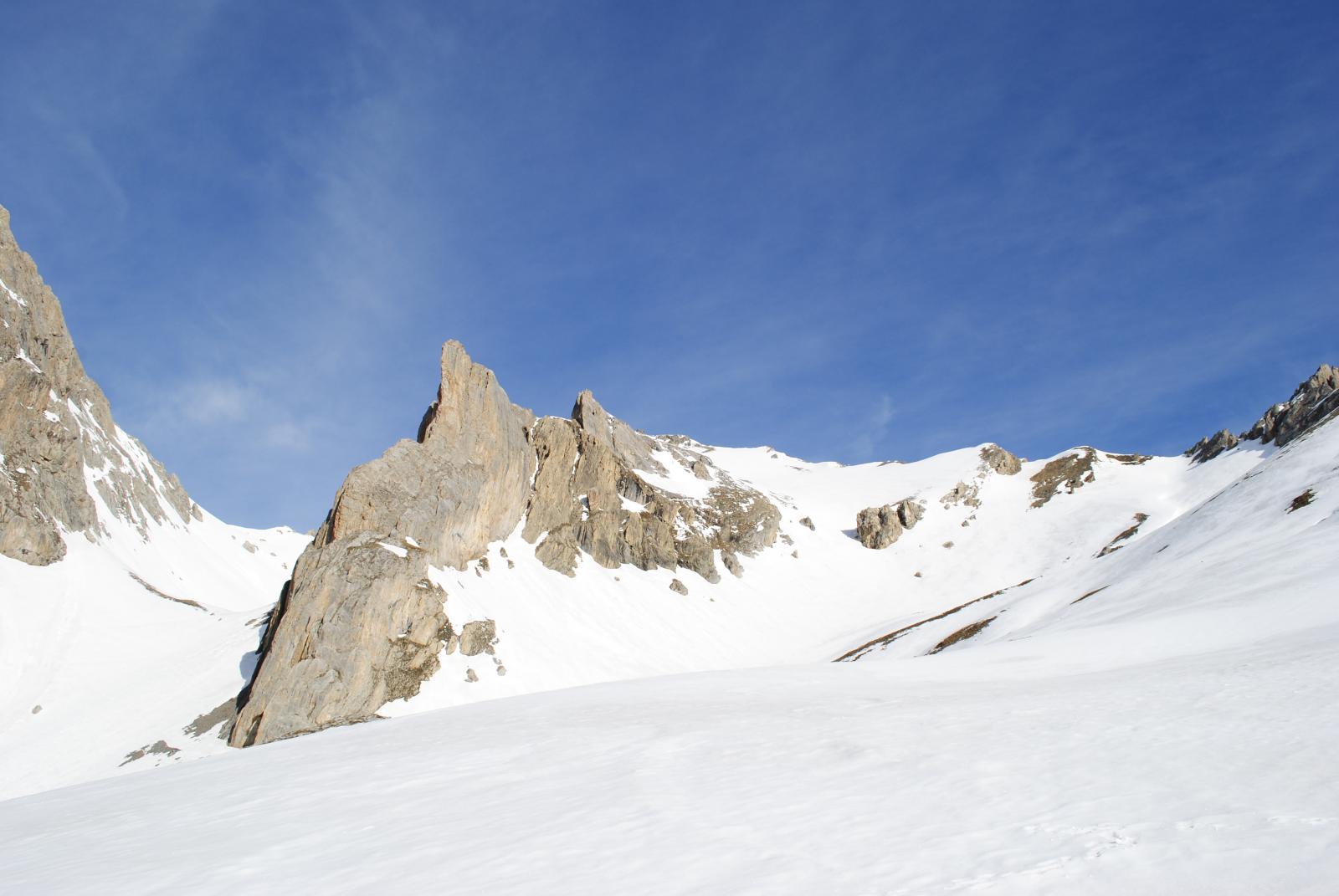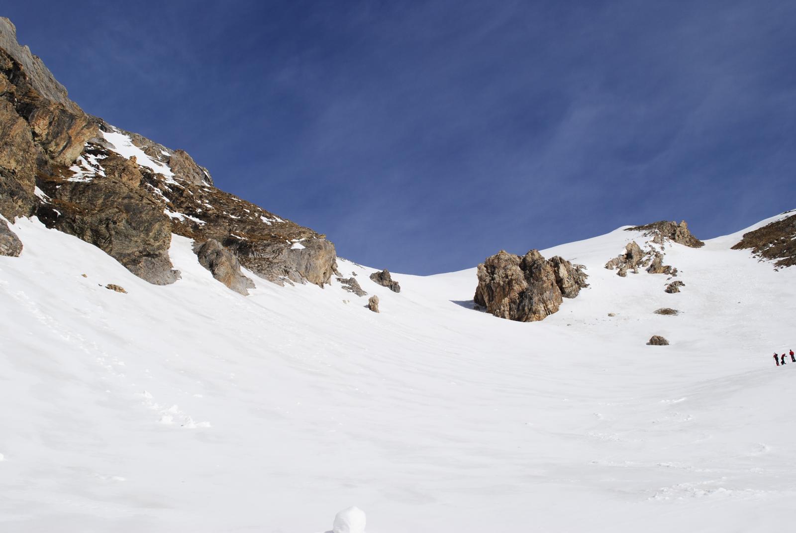 Da qui il percorso diventa alpinistico: si scende la cresta nevosa che si restringe e forma un’insellatura tra le due vette. Si supera un salto roccioso (aggirabile scendendo a sx su ripido traveso) che porta sul filo di cresta ed alla calotta nevosa finale (croce di ferro).