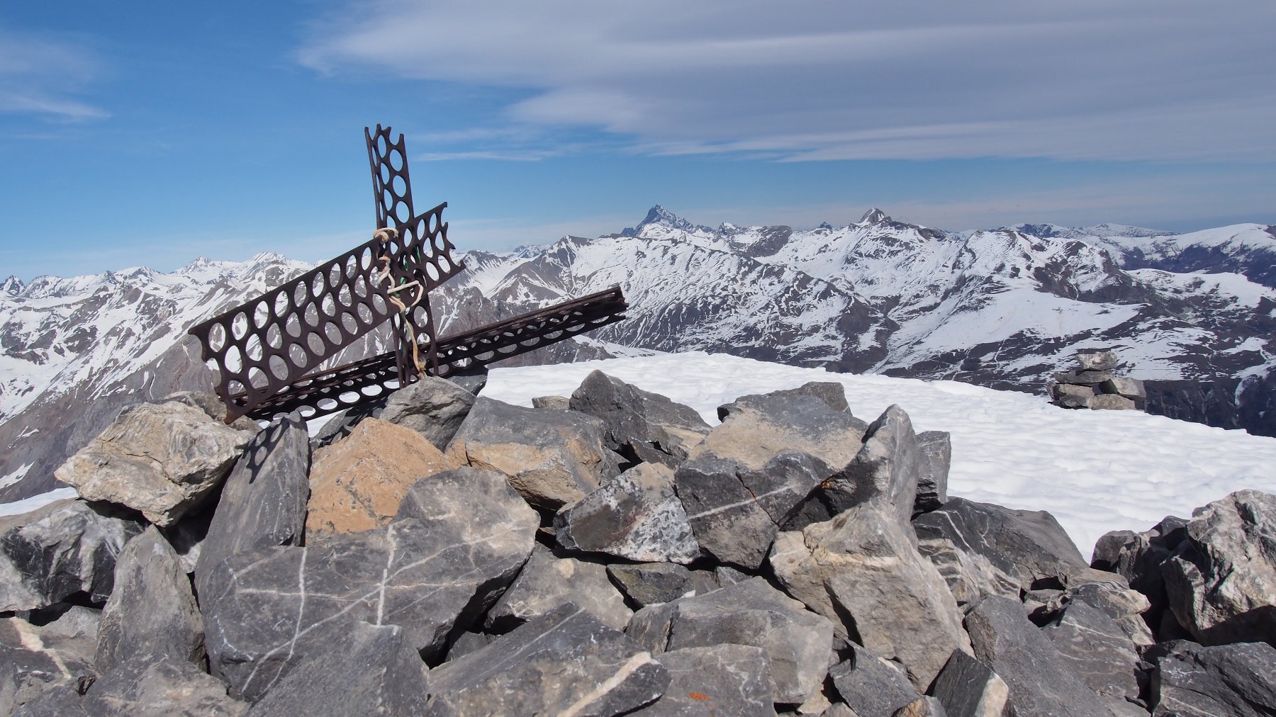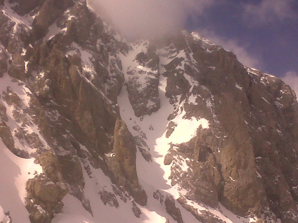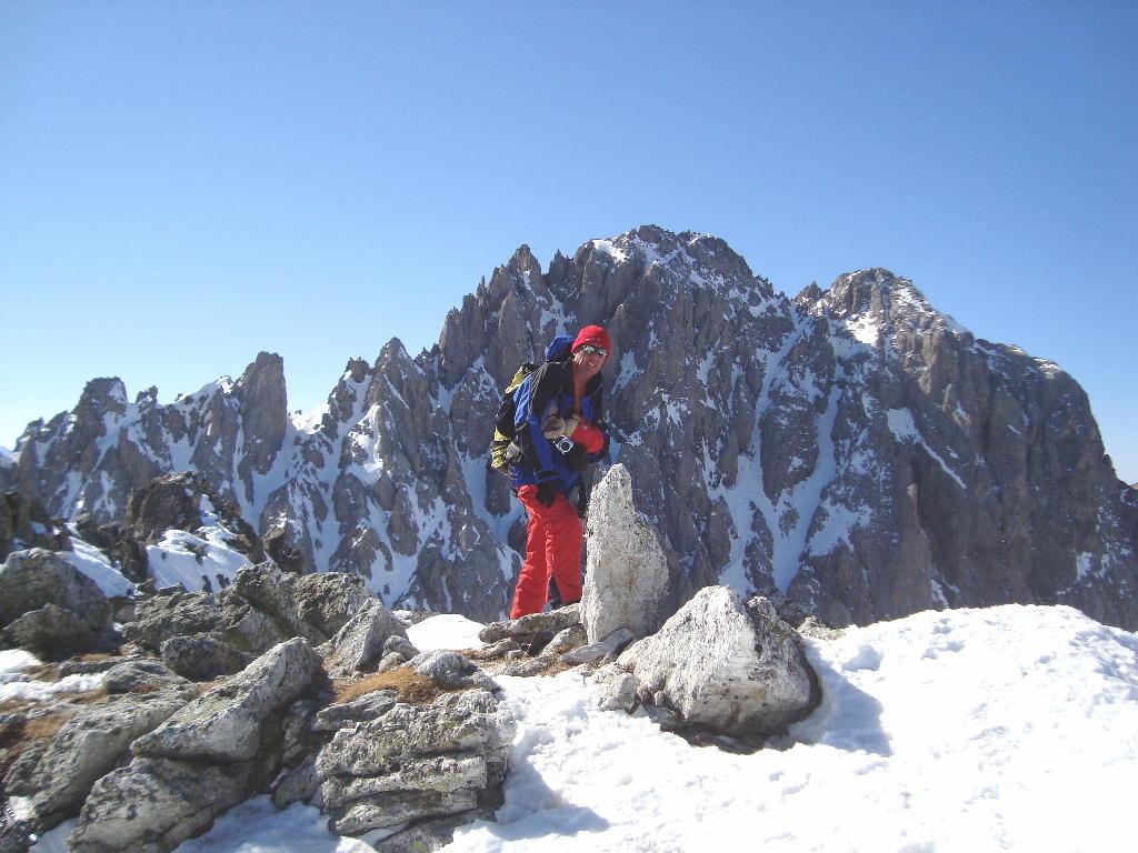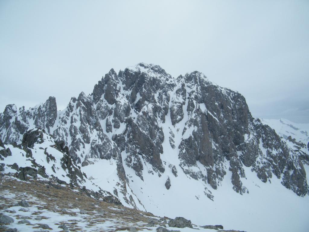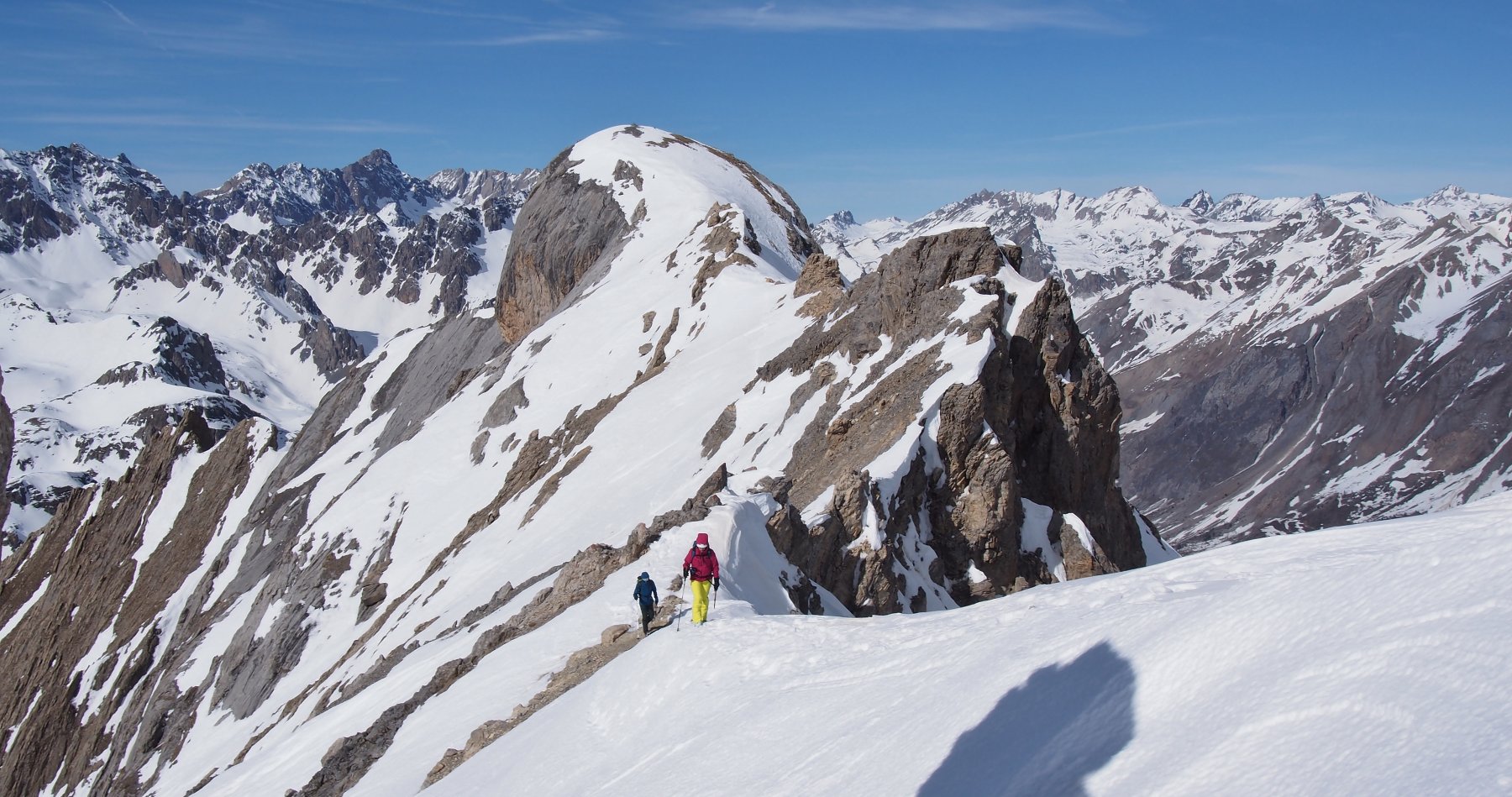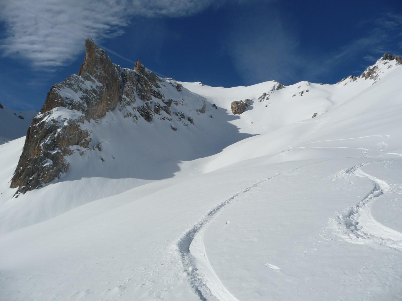 Da qui il percorso diventa alpinistico: si scende la cresta nevosa che si restringe e forma un’insellatura tra le due vette. Si supera un salto roccioso (aggirabile scendendo a sx su ripido traveso) che porta sul filo di cresta ed alla calotta nevosa finale (croce di ferro).