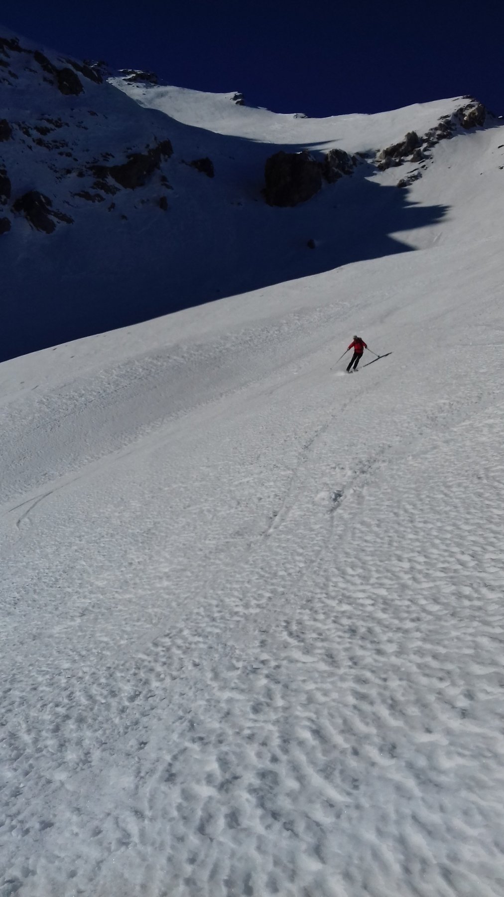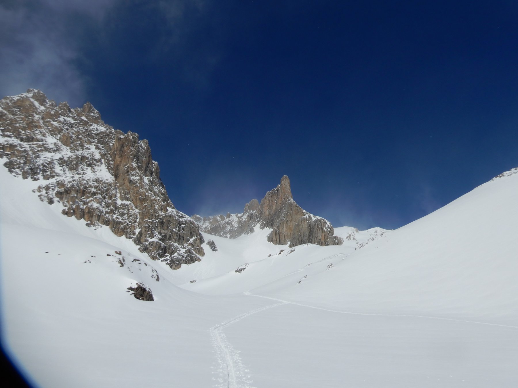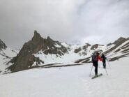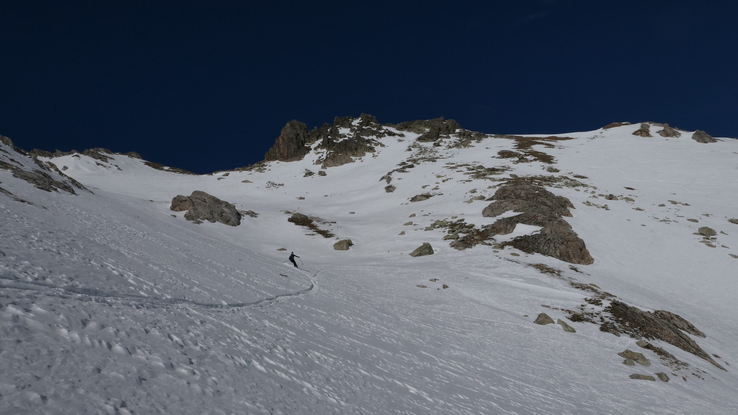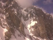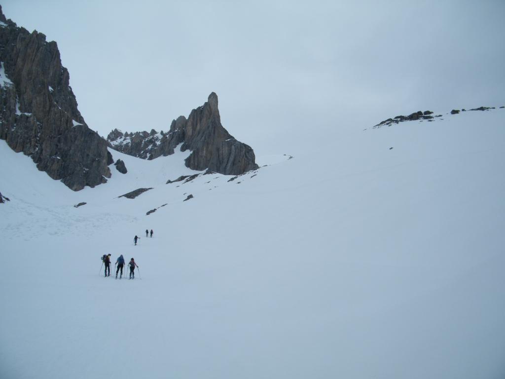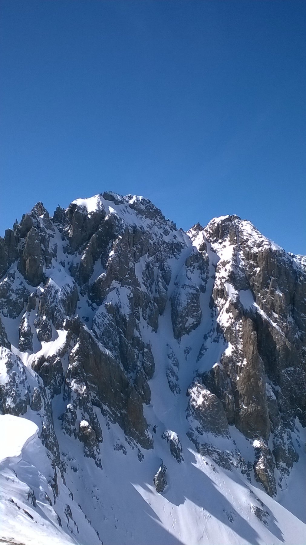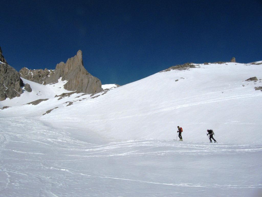 Da qui il percorso diventa alpinistico: si scende la cresta nevosa che si restringe e forma un’insellatura tra le due vette. Si supera un salto roccioso (aggirabile scendendo a sx su ripido traveso) che porta sul filo di cresta ed alla calotta nevosa finale (croce di ferro).