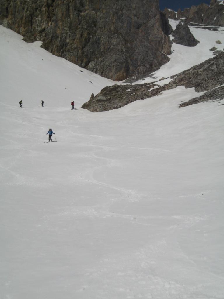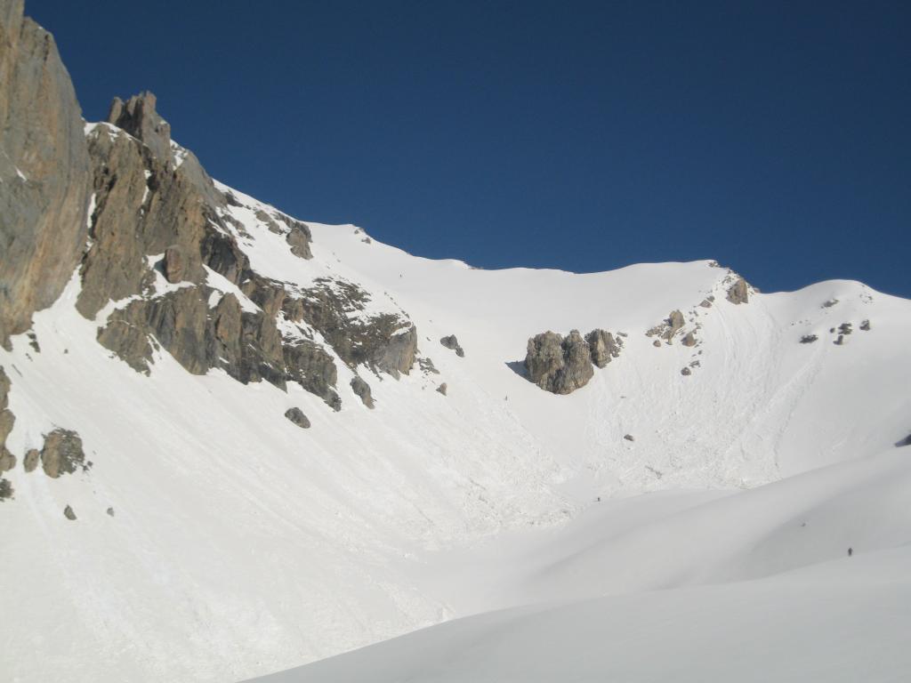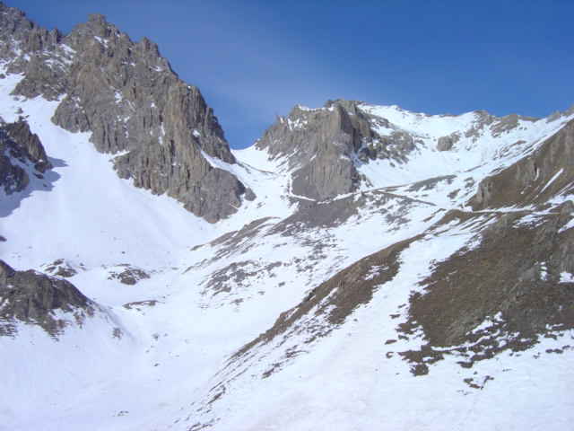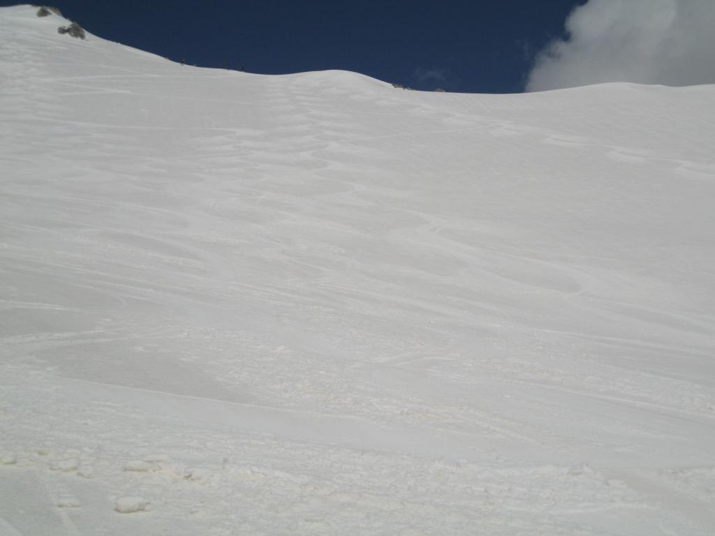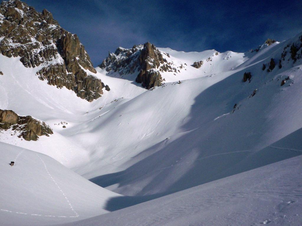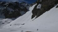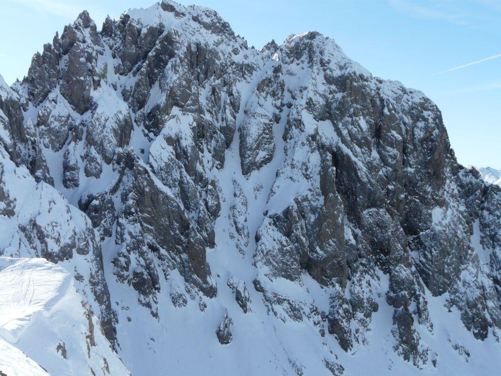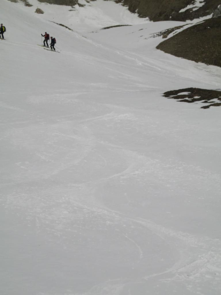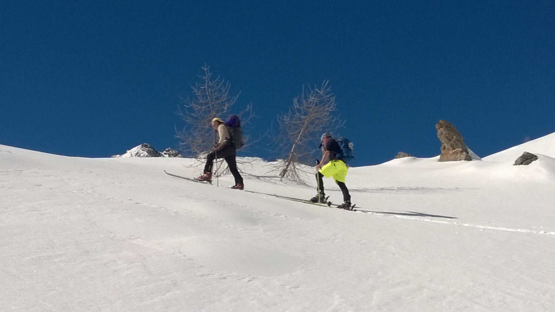 Da qui il percorso diventa alpinistico: si scende la cresta nevosa che si restringe e forma un’insellatura tra le due vette. Si supera un salto roccioso (aggirabile scendendo a sx su ripido traveso) che porta sul filo di cresta ed alla calotta nevosa finale (croce di ferro).