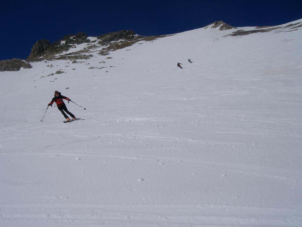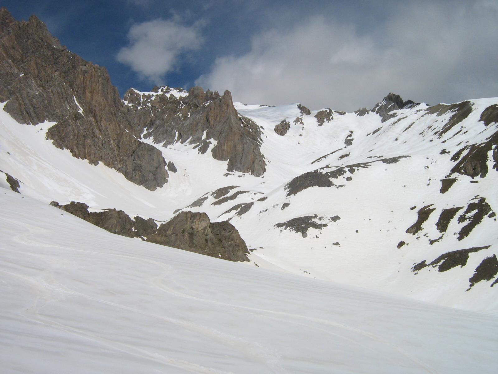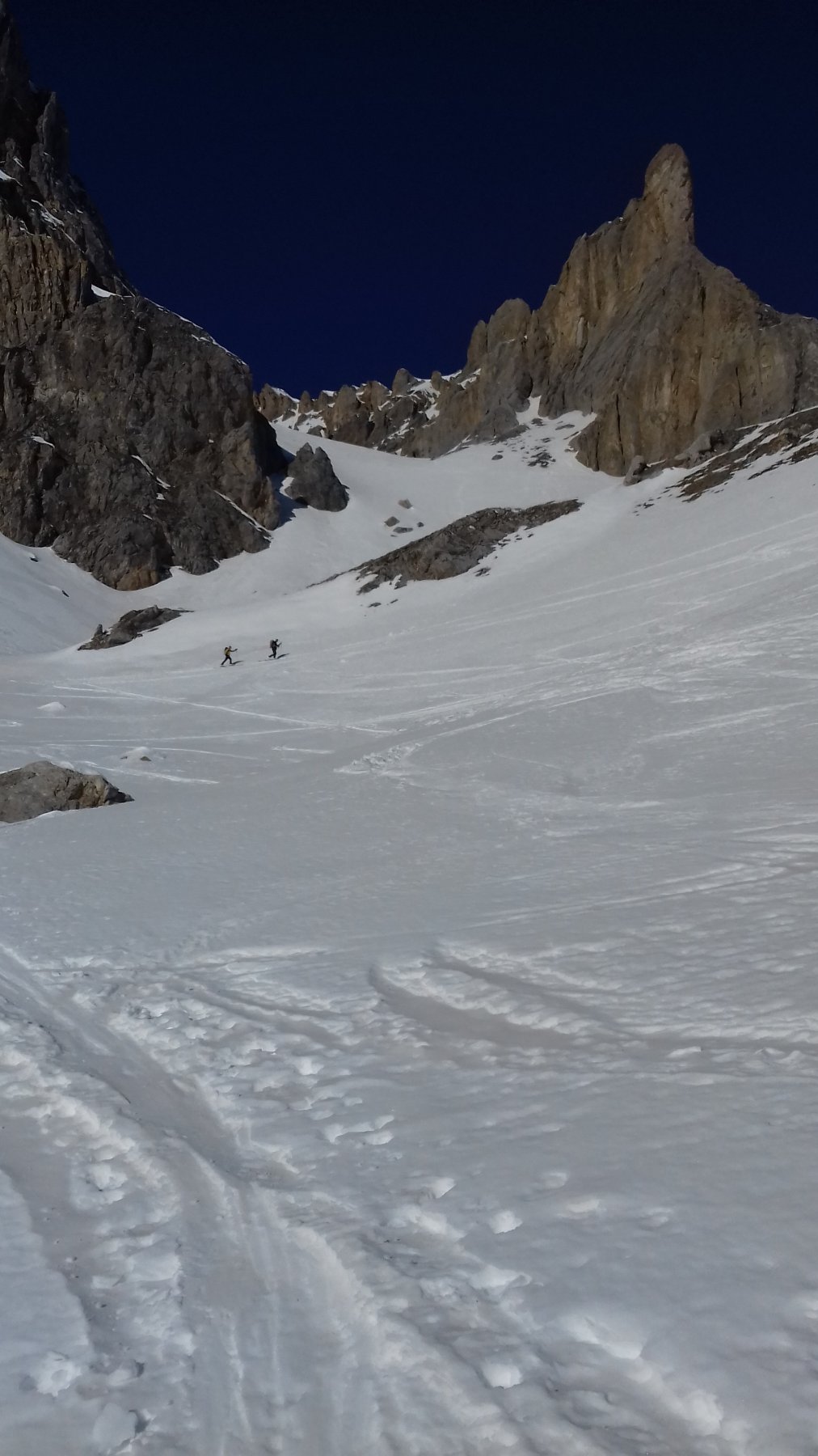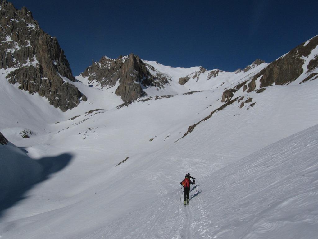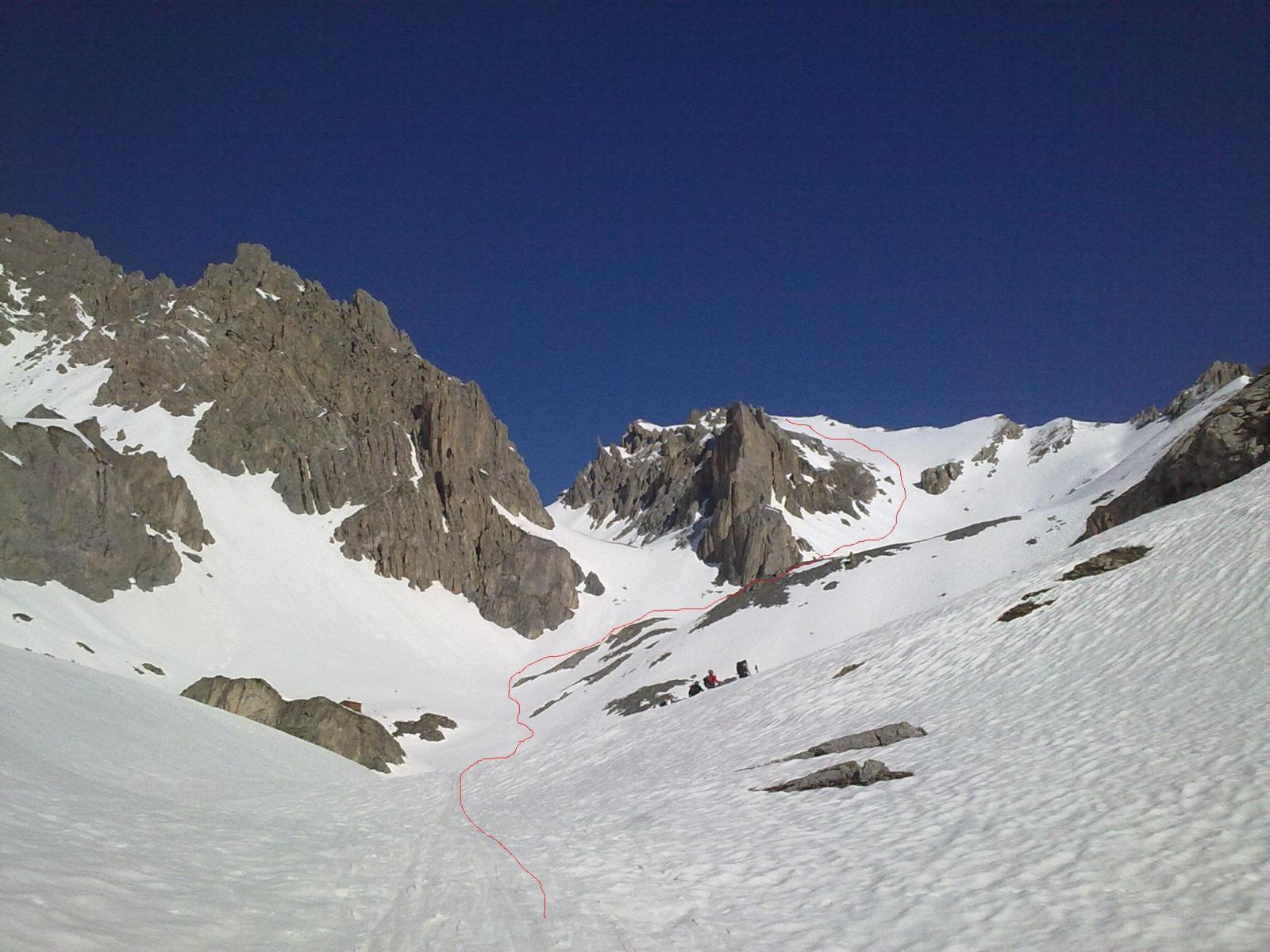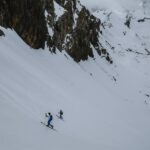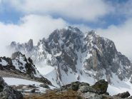 Da qui il percorso diventa alpinistico: si scende la cresta nevosa che si restringe e forma un’insellatura tra le due vette. Si supera un salto roccioso (aggirabile scendendo a sx su ripido traveso) che porta sul filo di cresta ed alla calotta nevosa finale (croce di ferro).