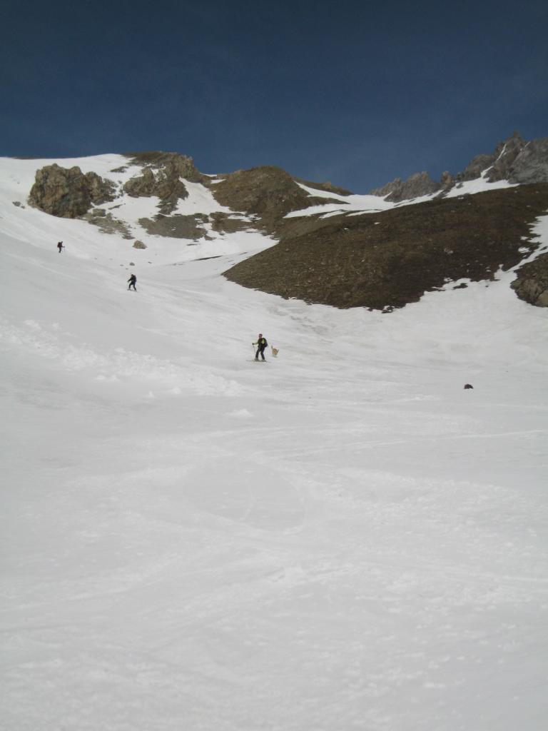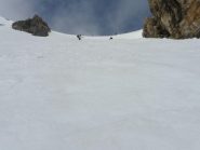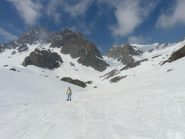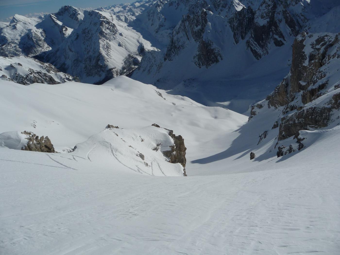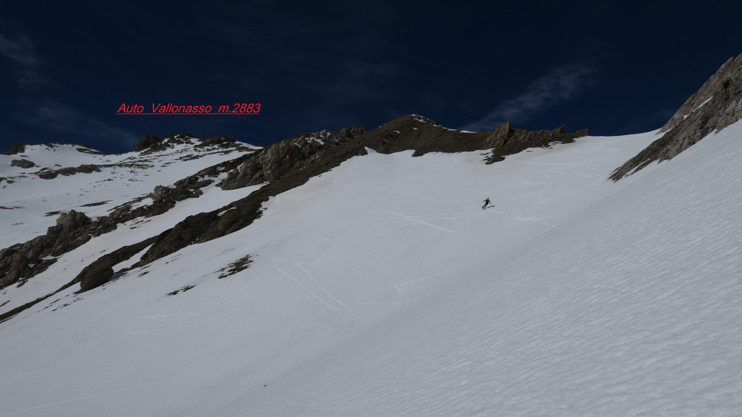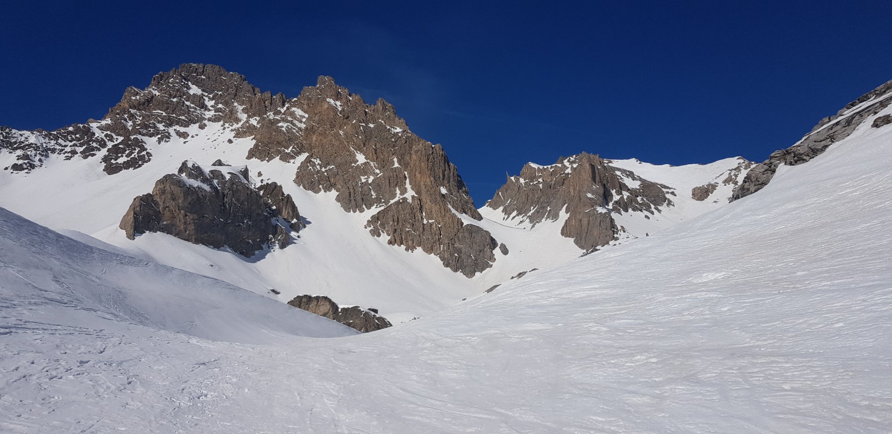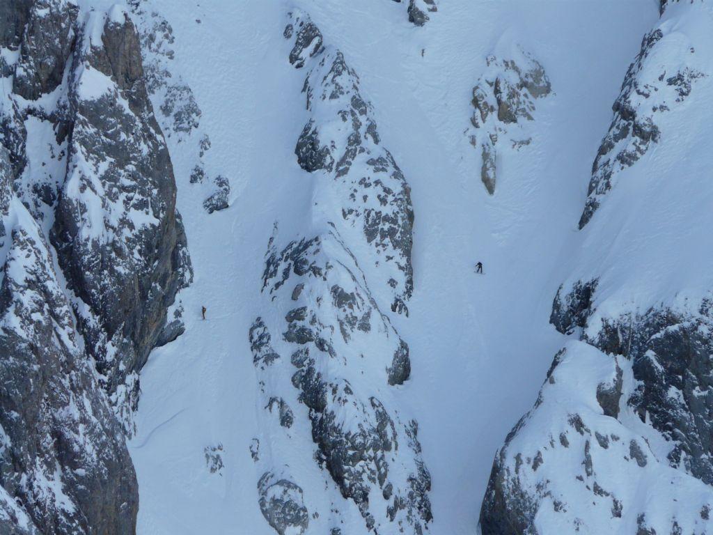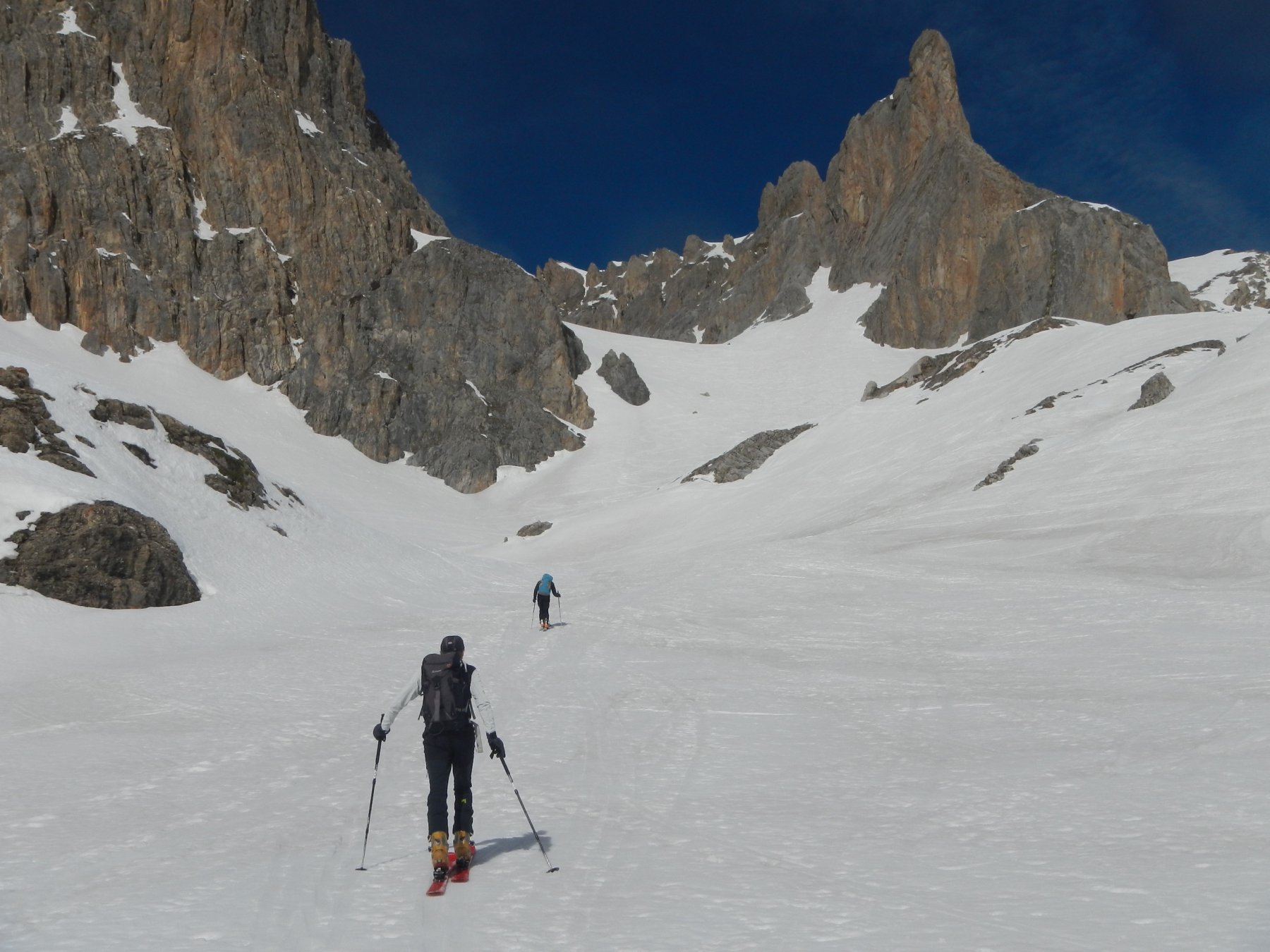 Da qui il percorso diventa alpinistico: si scende la cresta nevosa che si restringe e forma un’insellatura tra le due vette. Si supera un salto roccioso (aggirabile scendendo a sx su ripido traveso) che porta sul filo di cresta ed alla calotta nevosa finale (croce di ferro).