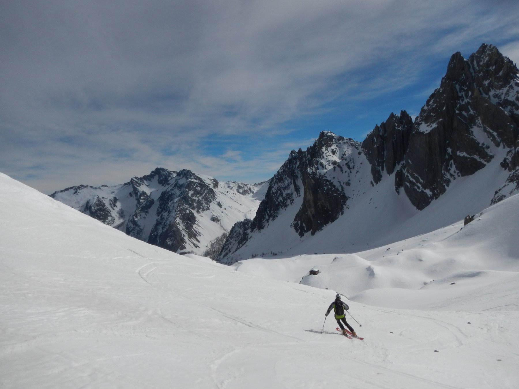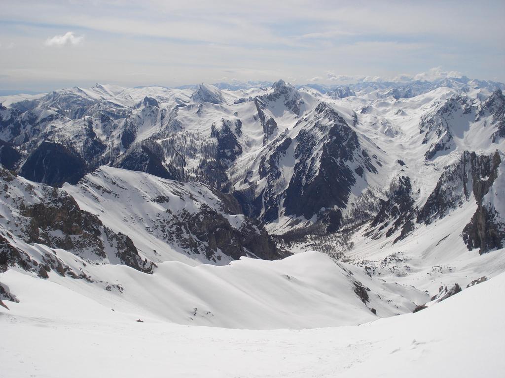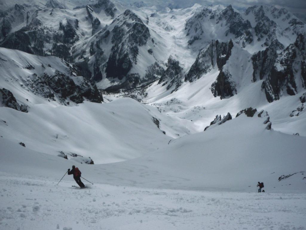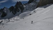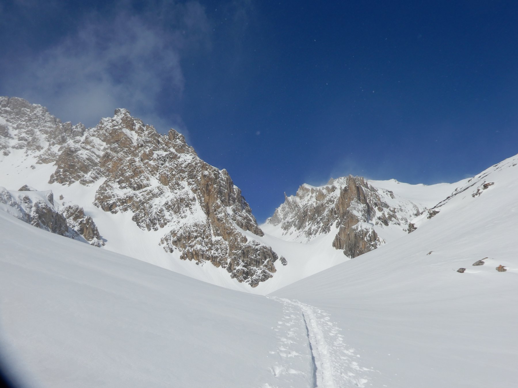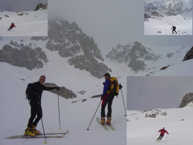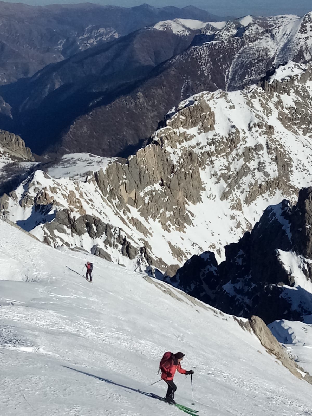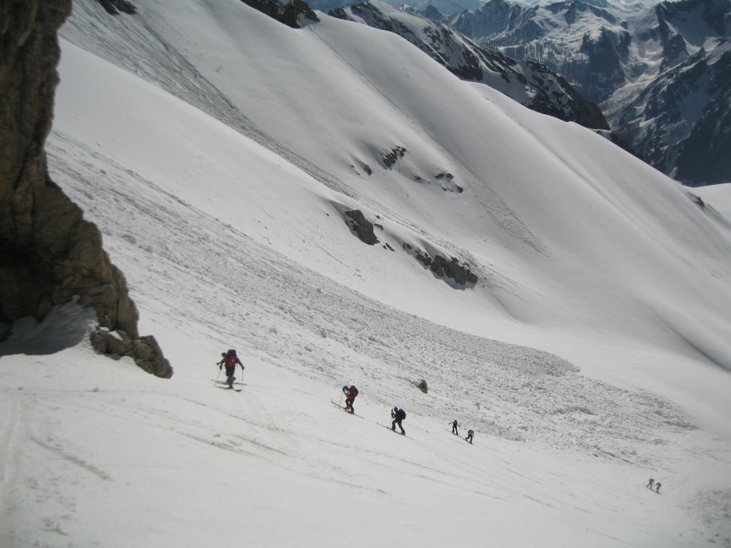 Da qui il percorso diventa alpinistico: si scende la cresta nevosa che si restringe e forma un’insellatura tra le due vette. Si supera un salto roccioso (aggirabile scendendo a sx su ripido traveso) che porta sul filo di cresta ed alla calotta nevosa finale (croce di ferro).