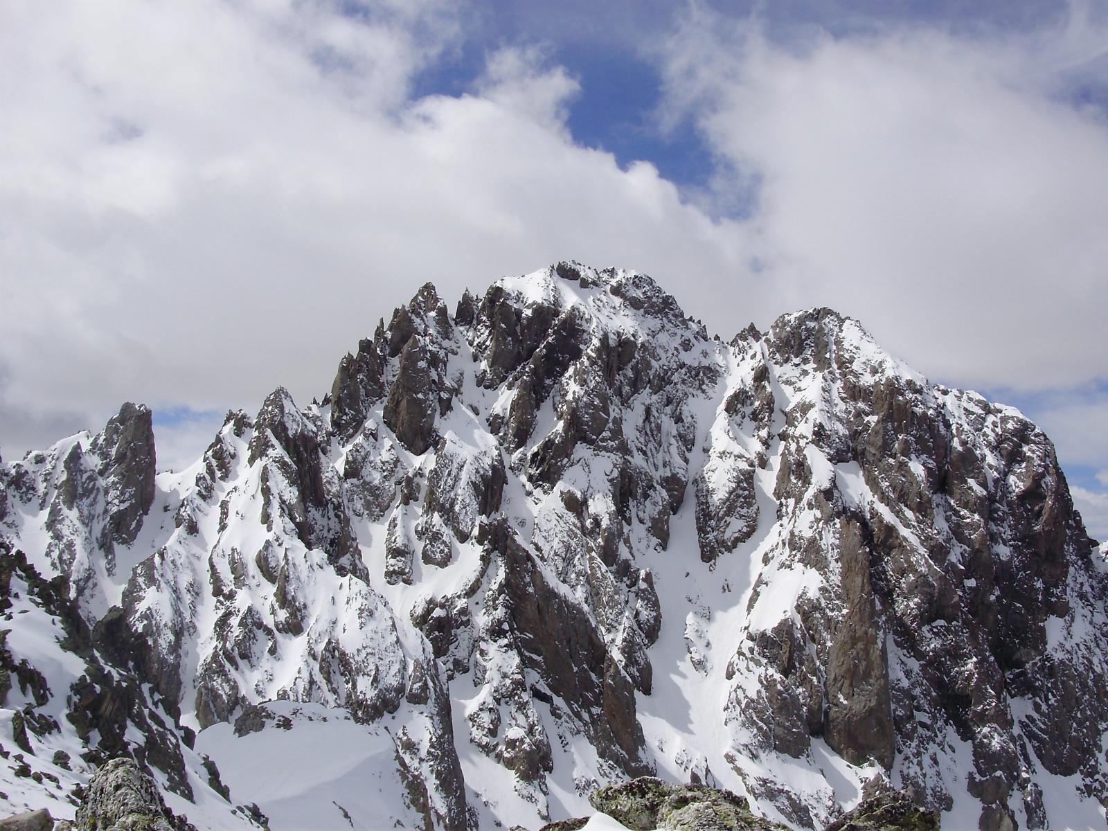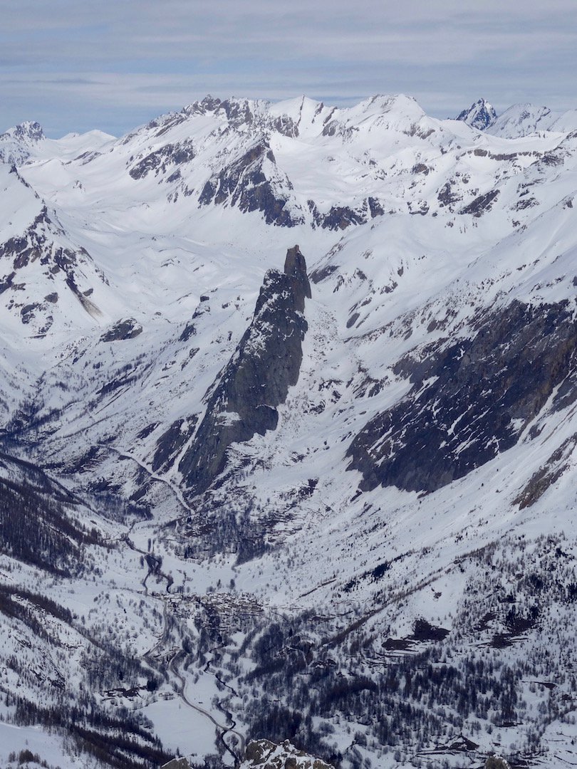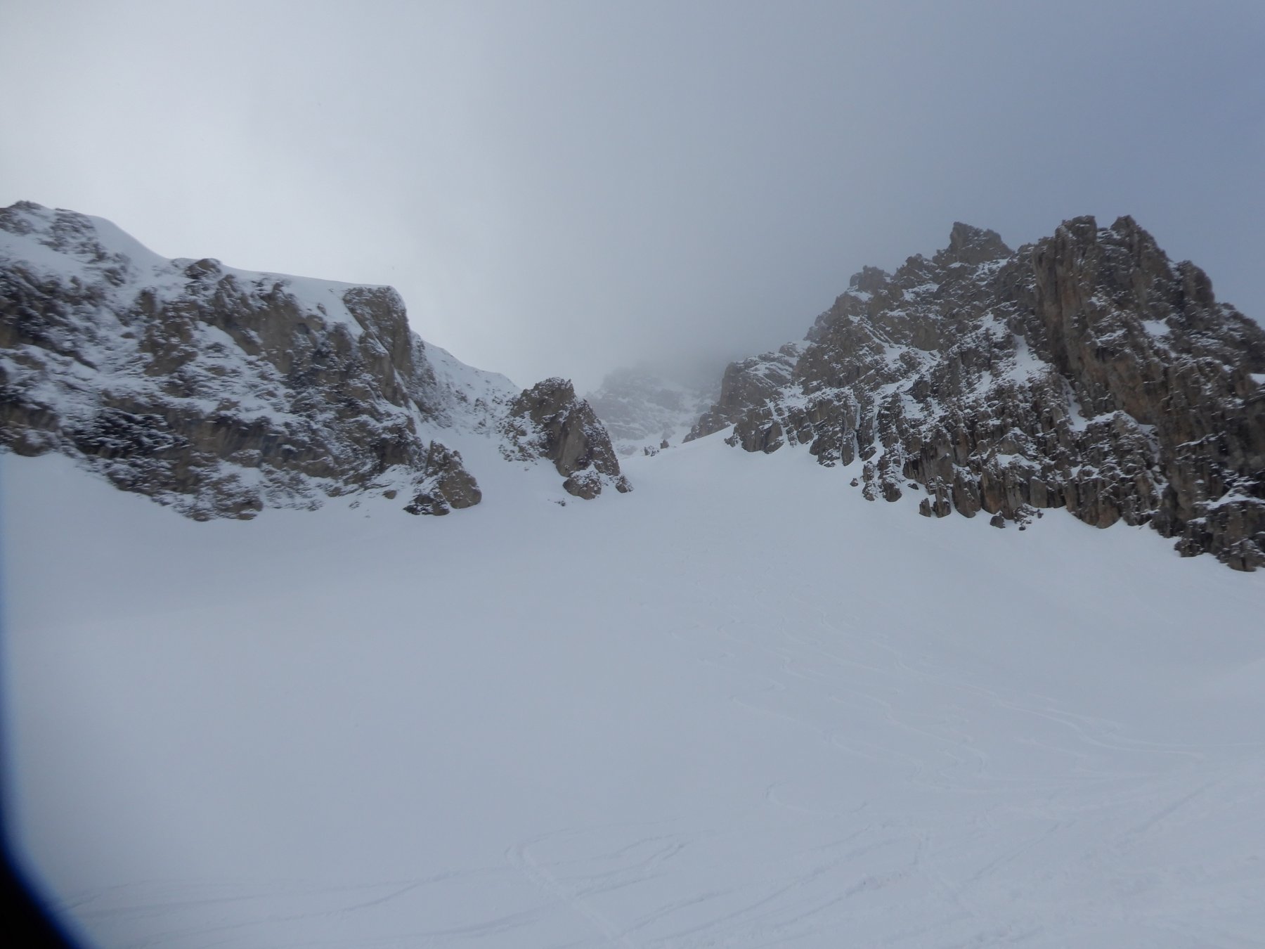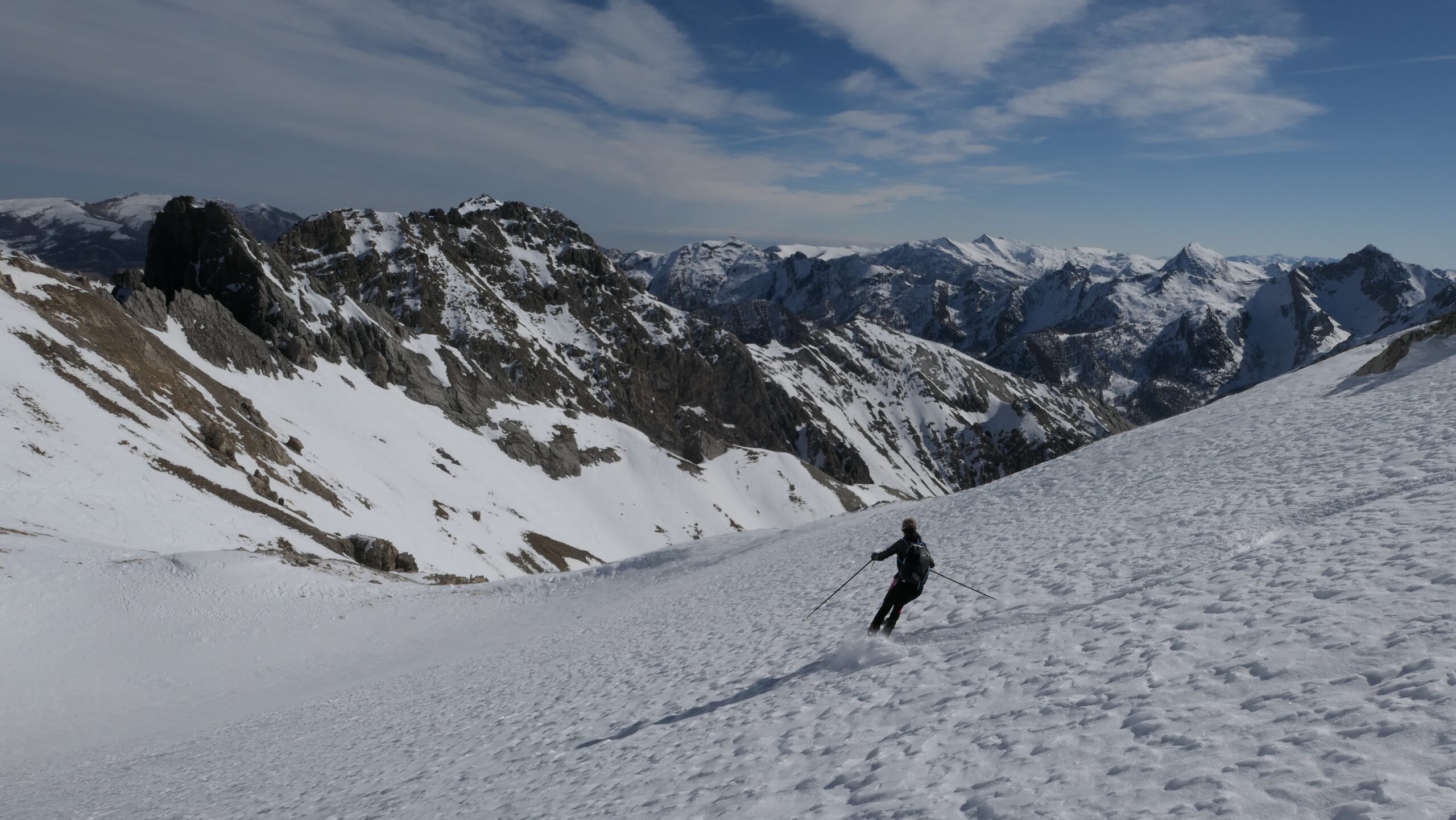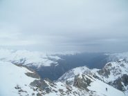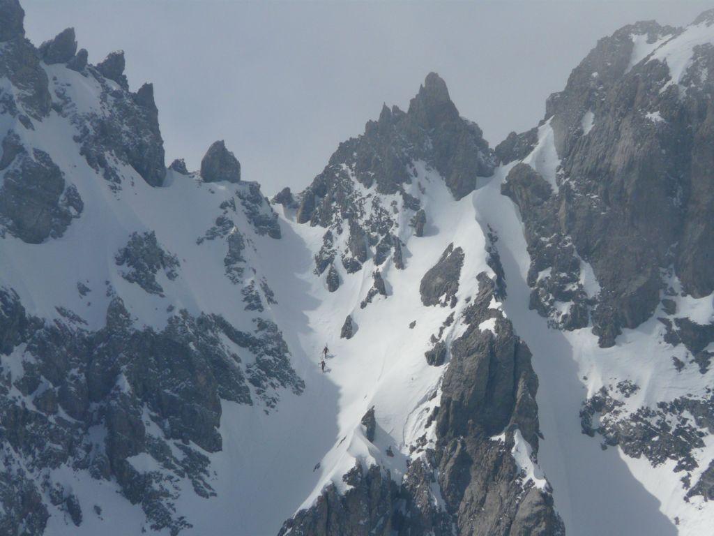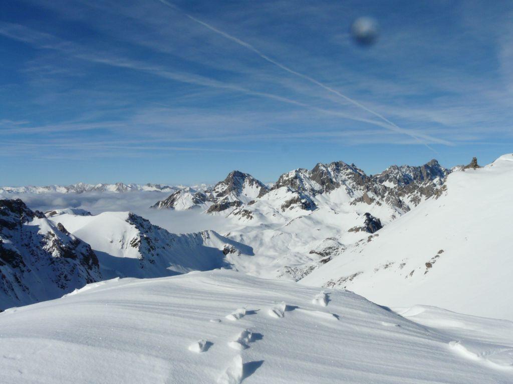 Da qui il percorso diventa alpinistico: si scende la cresta nevosa che si restringe e forma un’insellatura tra le due vette. Si supera un salto roccioso (aggirabile scendendo a sx su ripido traveso) che porta sul filo di cresta ed alla calotta nevosa finale (croce di ferro).
