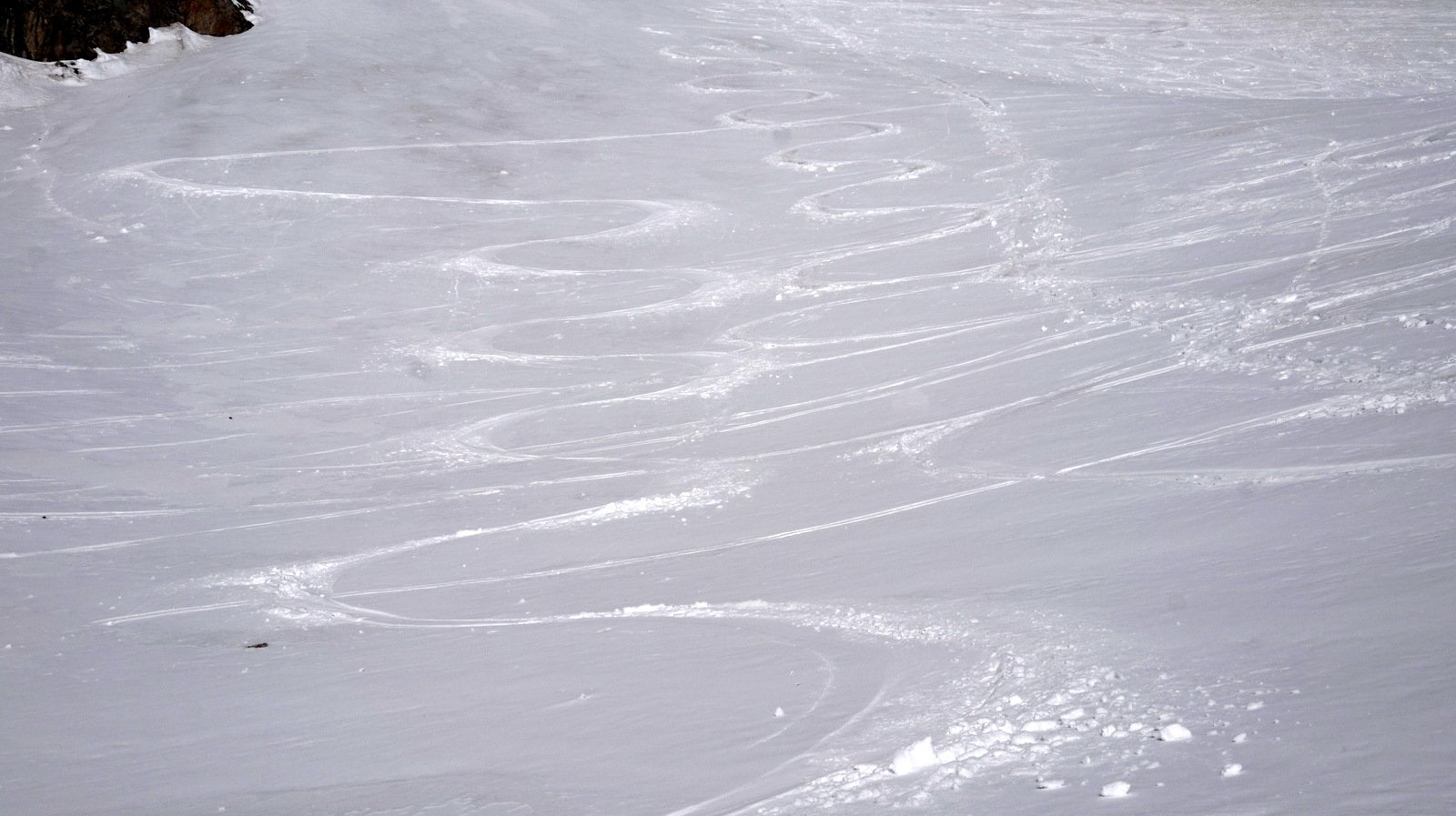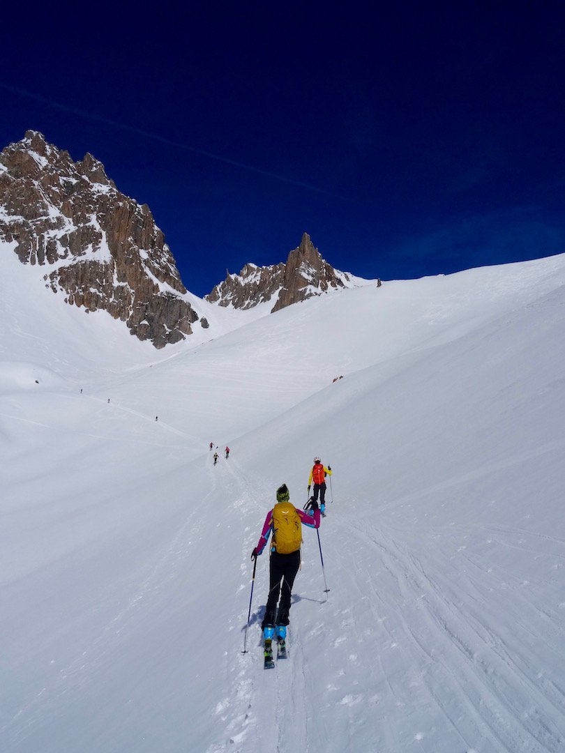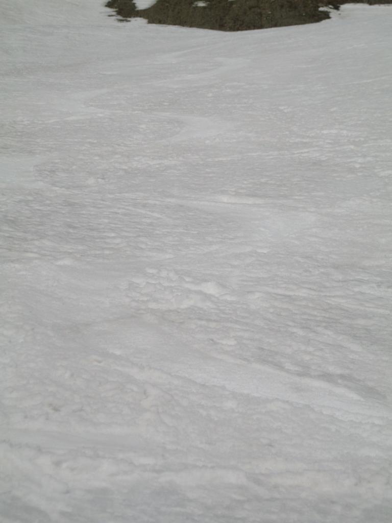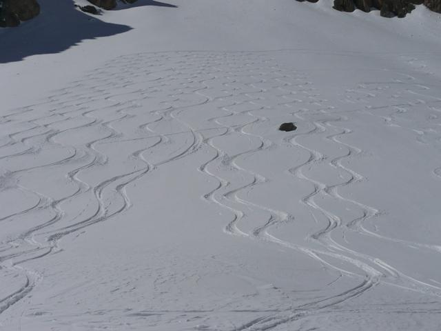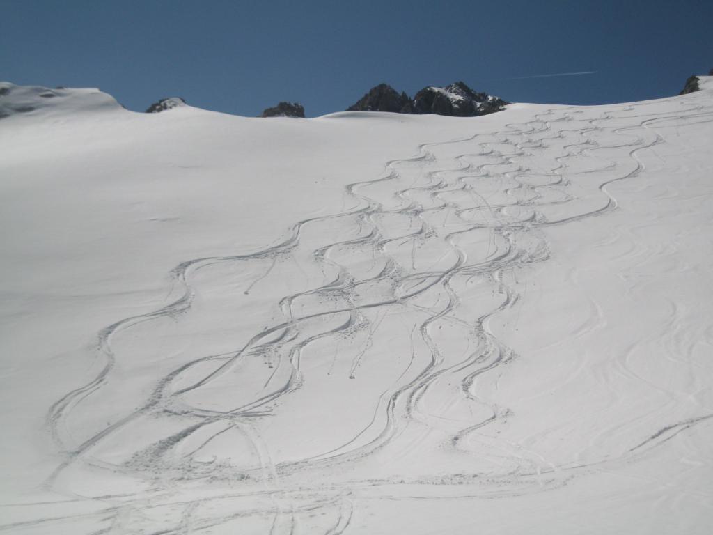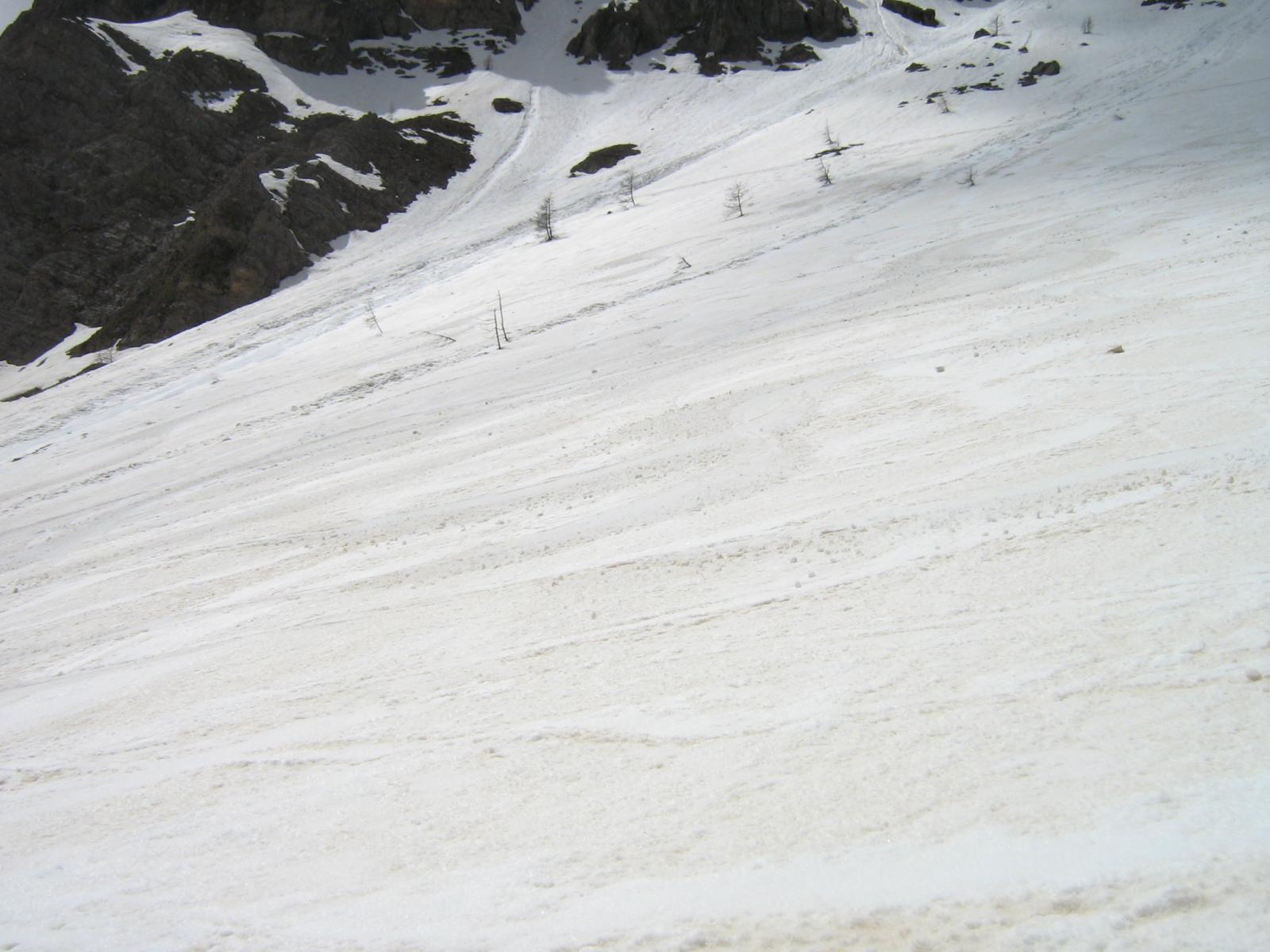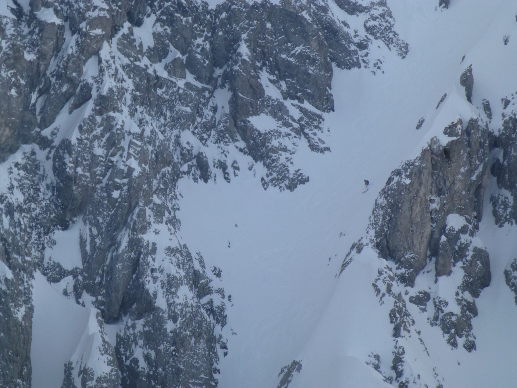 Da qui il percorso diventa alpinistico: si scende la cresta nevosa che si restringe e forma un’insellatura tra le due vette. Si supera un salto roccioso (aggirabile scendendo a sx su ripido traveso) che porta sul filo di cresta ed alla calotta nevosa finale (croce di ferro).