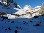 Si attraversa un bosco di larici e si arriva al pianoro della Grangia Gorra, lo si attraversa, sempre con l’Oronaye e il Vallonasso in primo piano, e si entra nel Vallone d’Enchiausa. Si prosegue verso ovest/nord-ovest ignorando a destra il ramo secondario del Vallonetto. Si superano 2 tratti pianeggianti e si arriva a quota 2400 alla base del ripido vallone che porta al Colle. Si volta a destra per raggiungere la base del pendio-canale finale che si restringe passando a lato di un roccione caratteristico a quota 2650. A quota 2750 il pendio si addolcisce e si raggiunge l’anticima Sud-est.