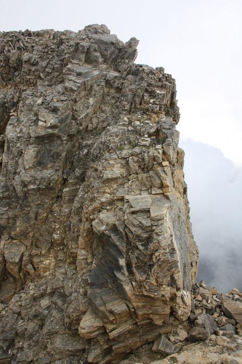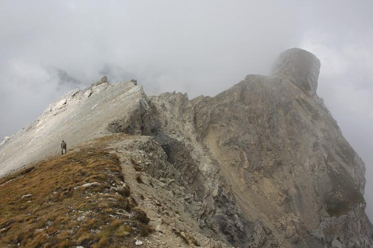 Dall’anticima SE o vetta scialpinistica (che ha la stessa quota della cima vera e non 20-40 m in meno come riportato su diverse carte e guide), ho seguito le indicazioni di Parodi e ho affrontato sul filo lo spuntone più grosso (4 m di II appigliato ma quasi verticale), che altrimenti si può aggirare perdendo quota sul lato SO per mobili detriti. Nella traversata fra le due cime si scendono e risalgono circa 60 m di dislivello.