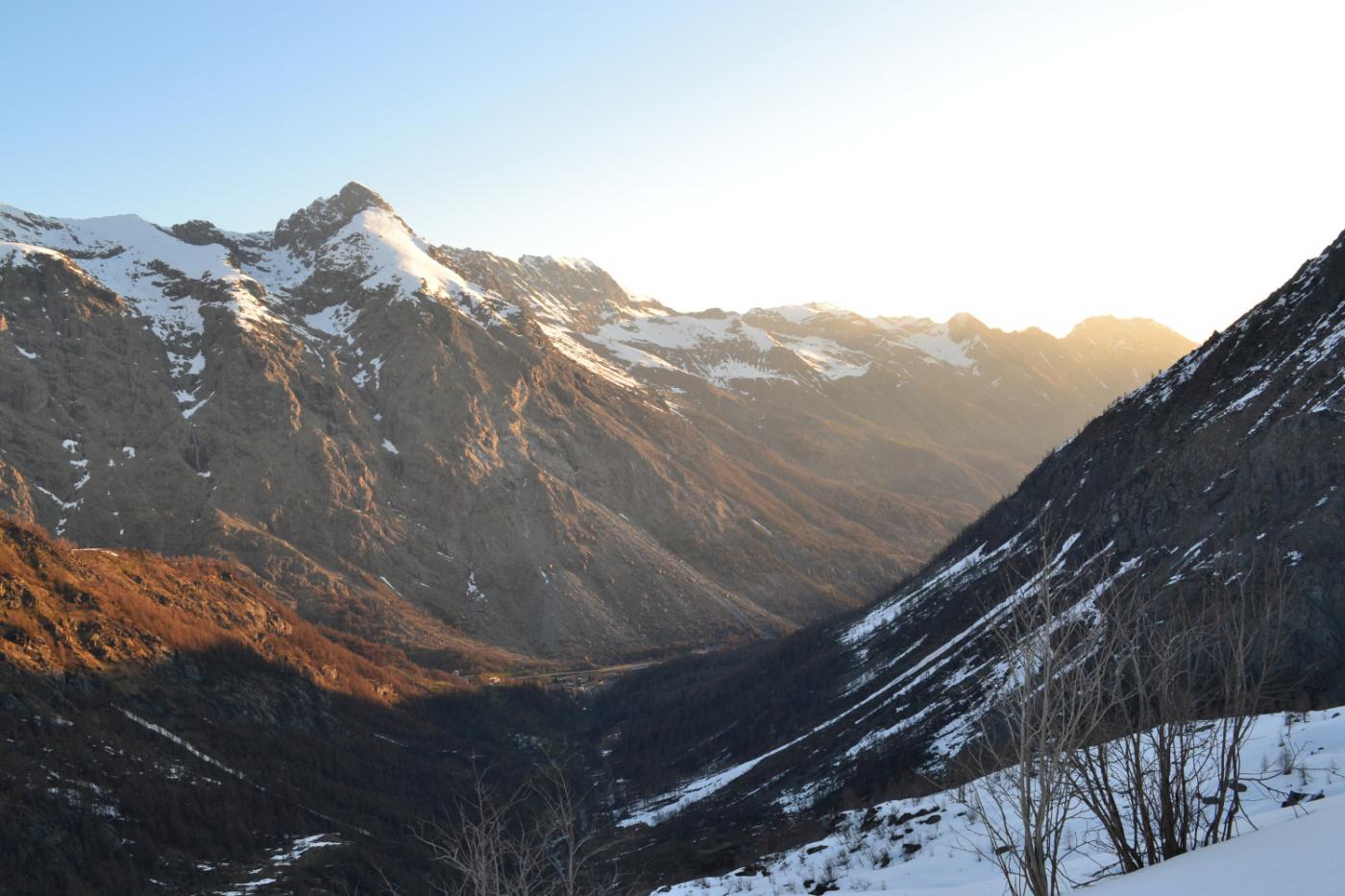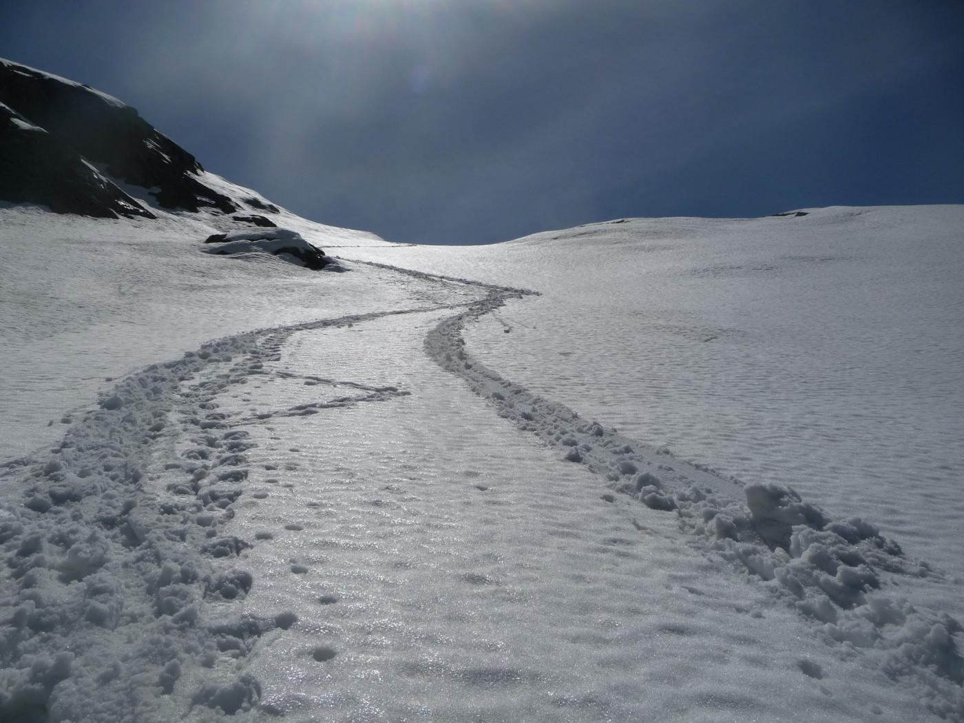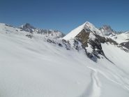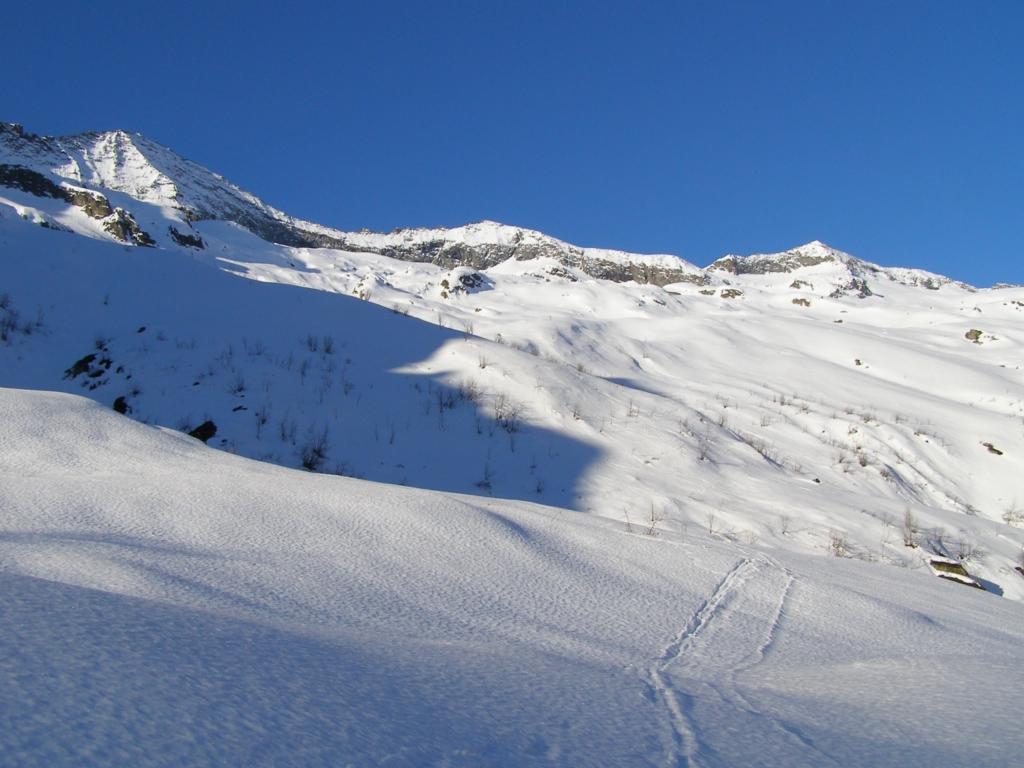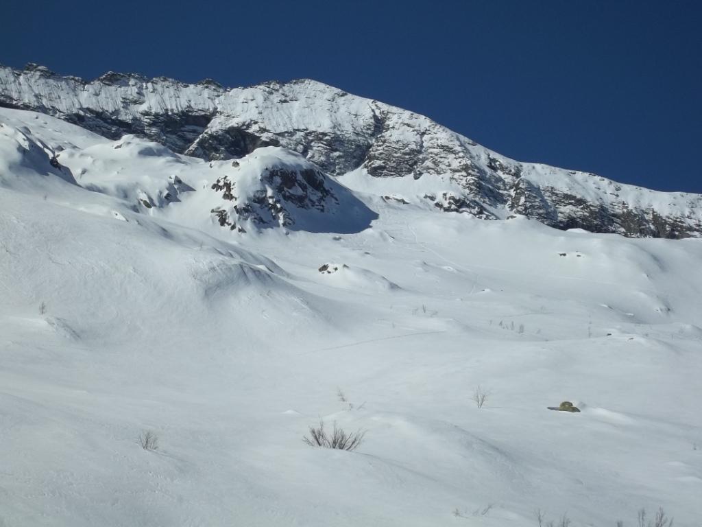Raggiunto un ripiano posto sotto il versante nord della punta della Sarda, si abbandona il vallone Paschiet e si volge a dx (SO) tagliando i ripidi pendii sottostante la punta della Sarda per giungere nei pressi dell’alpe Belvedere(diroccata) 2167m. Questo traverso richiede molta attenzione a causa dei grossi massi misti a rododendri spesso nascosti dalla neve.