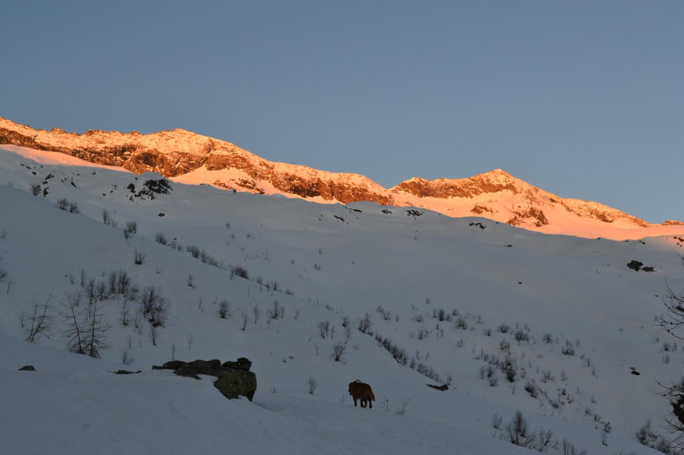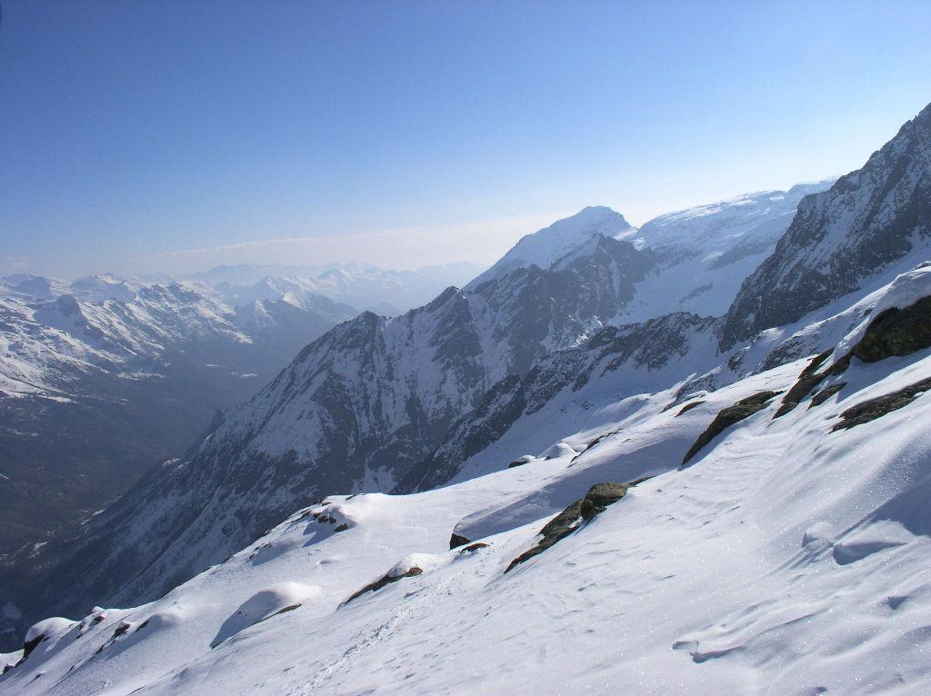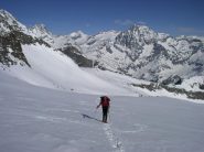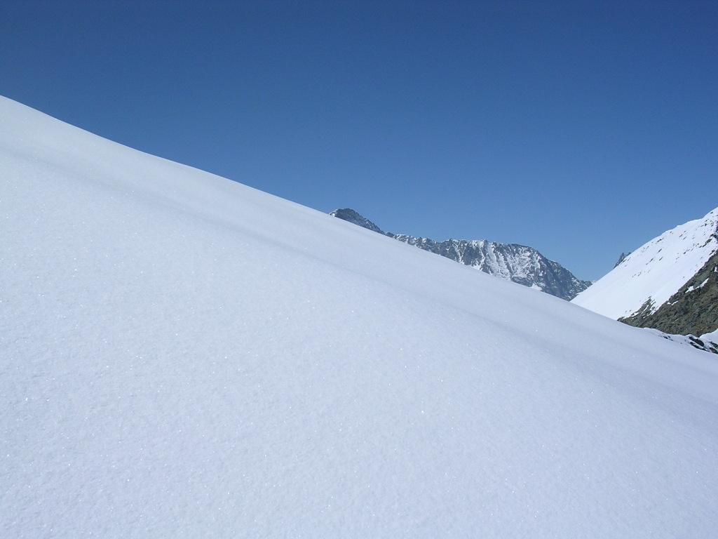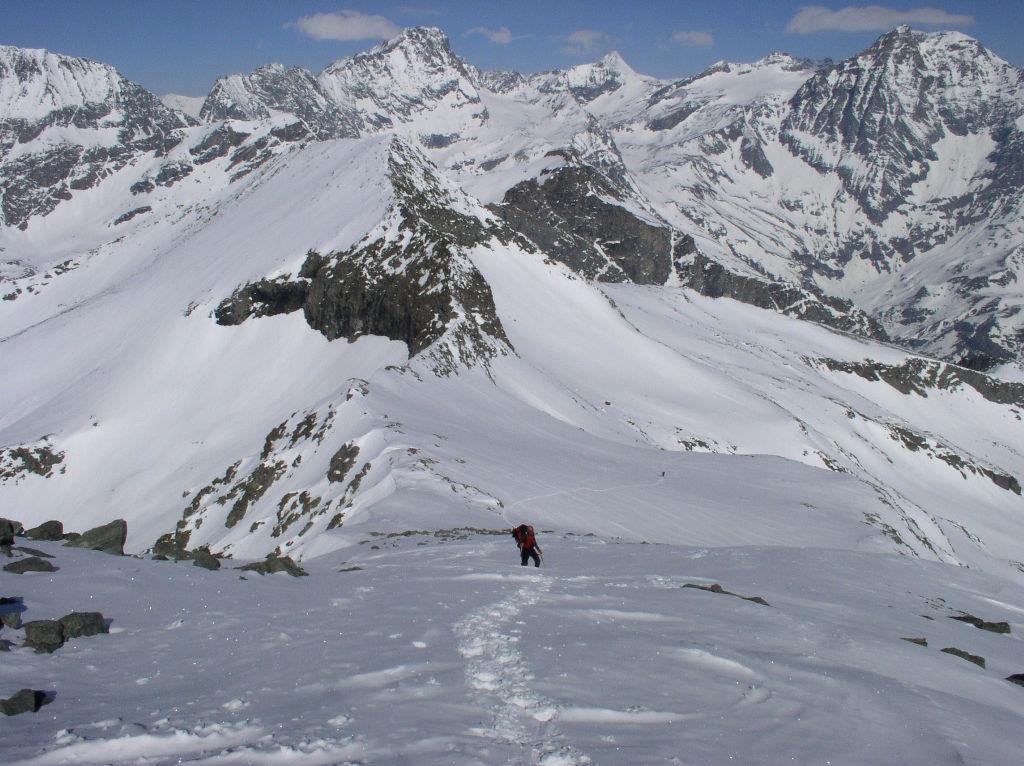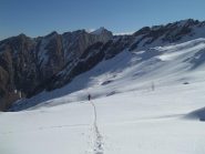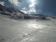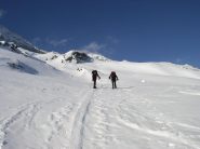 Raggiunto un ripiano posto sotto il versante nord della punta della Sarda, si abbandona il vallone Paschiet e si volge a dx (SO) tagliando i ripidi pendii sottostante la punta della Sarda per giungere nei pressi dell’alpe Belvedere(diroccata) 2167m. Questo traverso richiede molta attenzione a causa dei grossi massi misti a rododendri spesso nascosti dalla neve.