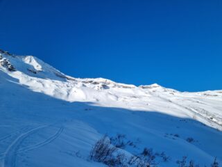 Strada di partenza innevata, zero portage per ora. Consigliati i coltelli perché il bosco è ghiacciato al mattino presto. Sceso alle 11.30 con le temperature che stavano salendo in fretta. In alto farina ben sciabile, in mezzo tratti di crosta portante, più morbida e bella stando un pò sulle tracce più basse. Boschetto lievemente ghiacciato ma molto godibile.