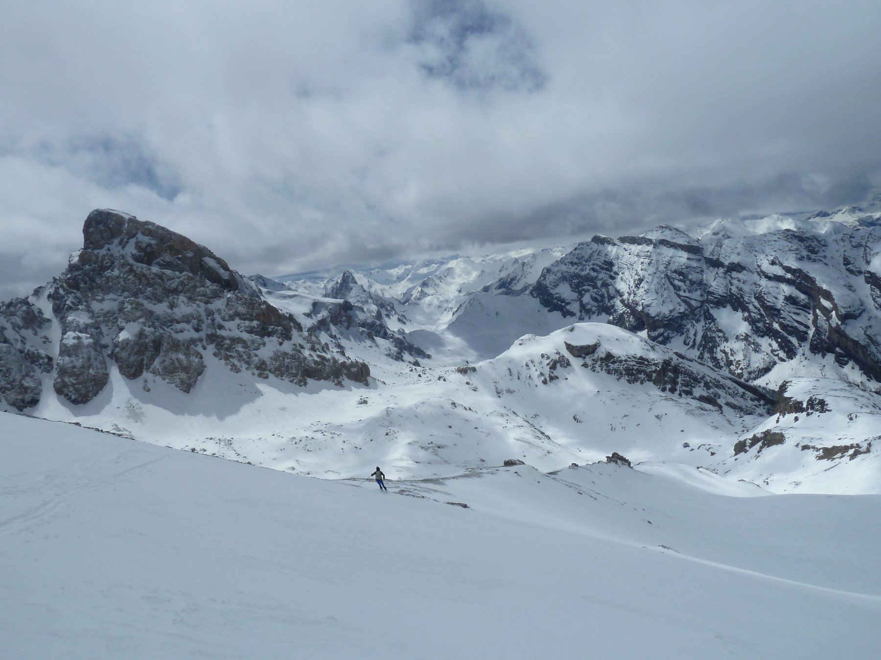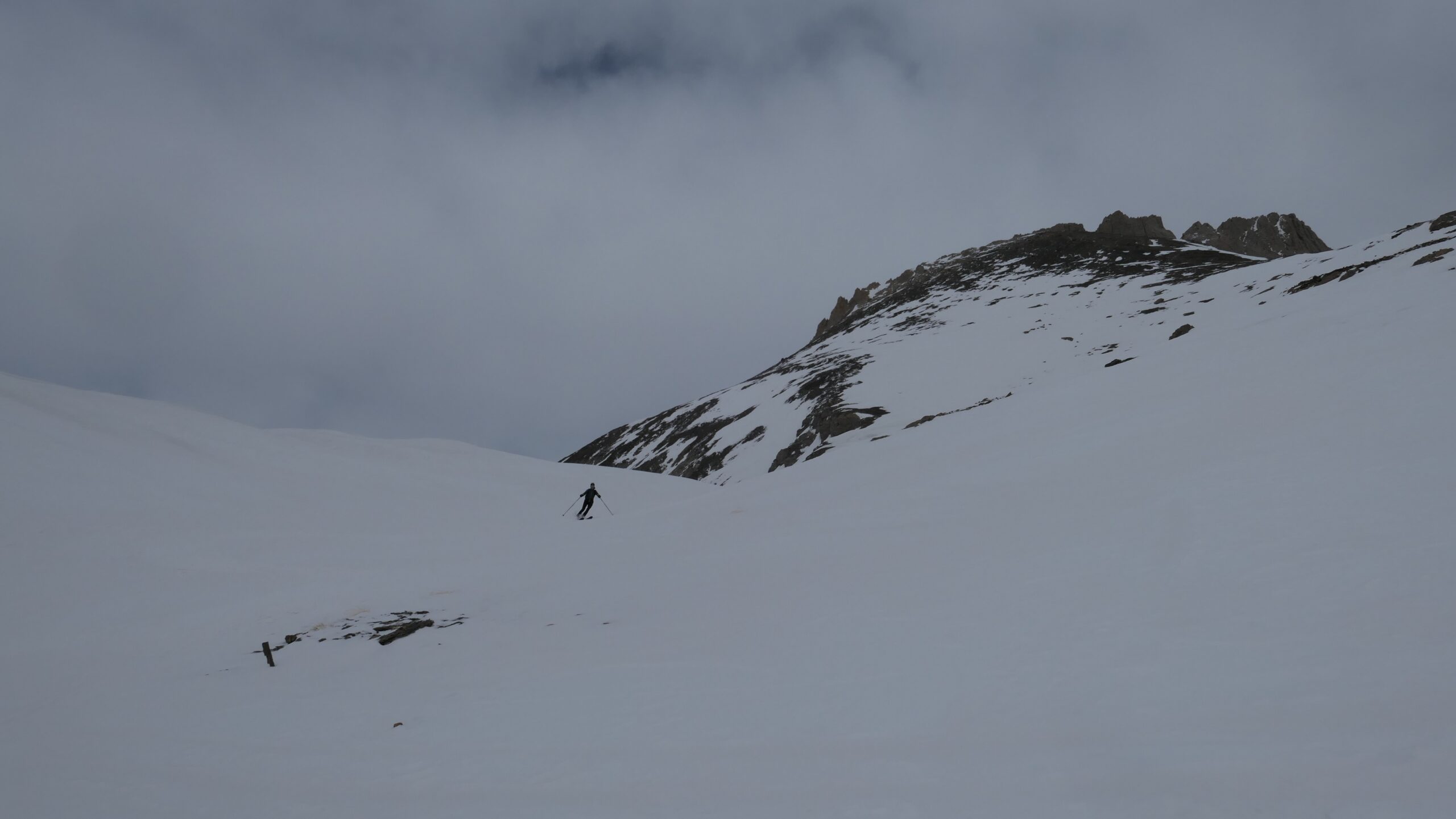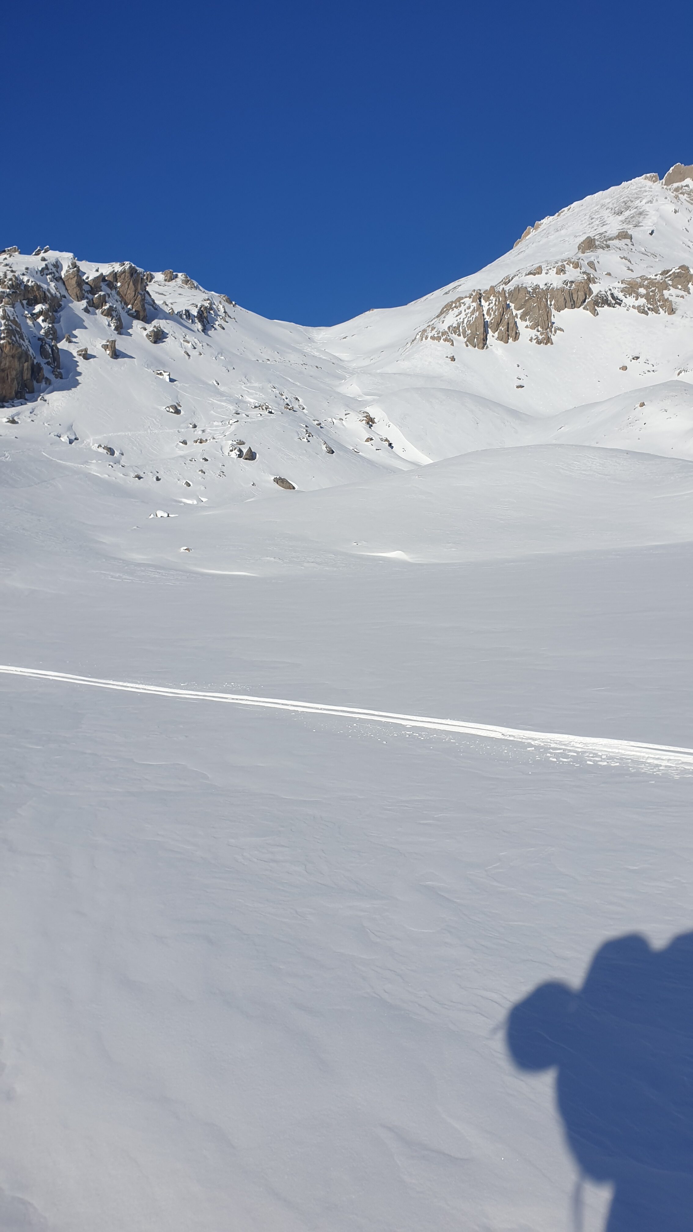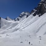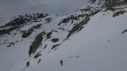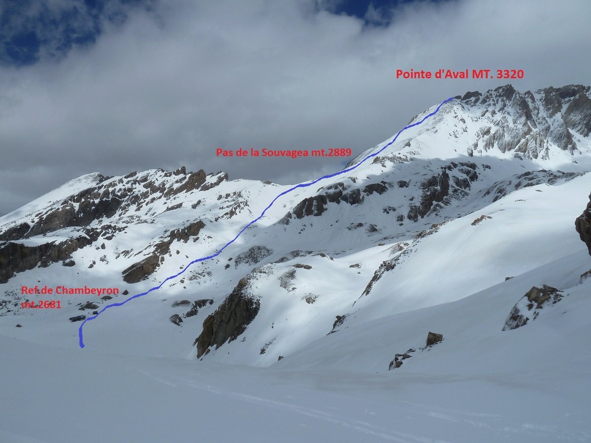 Da quota 2.300 mt.a 2.600 mt. tramite un lungo traverso verso dx si raggiunge il vallone che porta al passo di Souvagea a quota 2.889 mt. dal quale si inizia a salire l’ampio pendio SW che porta direttamente alla Point d’Aval e che in buone condizioni si può raggiungere facilmente con gli sci ai piedi.