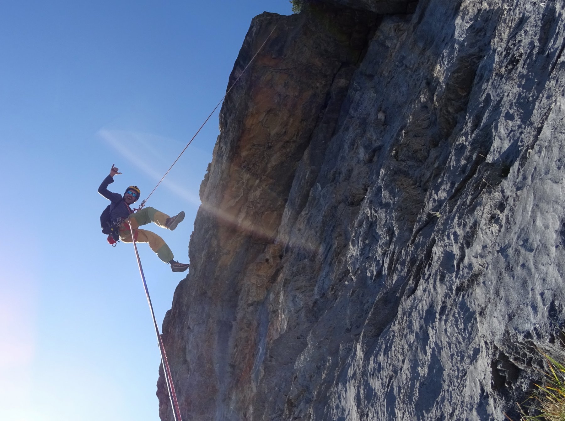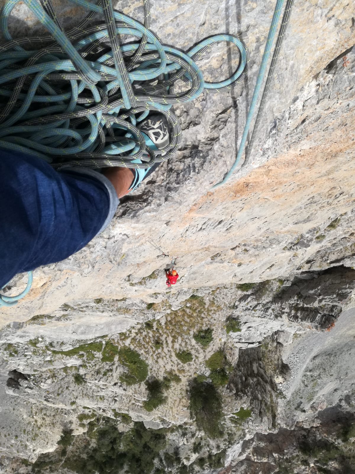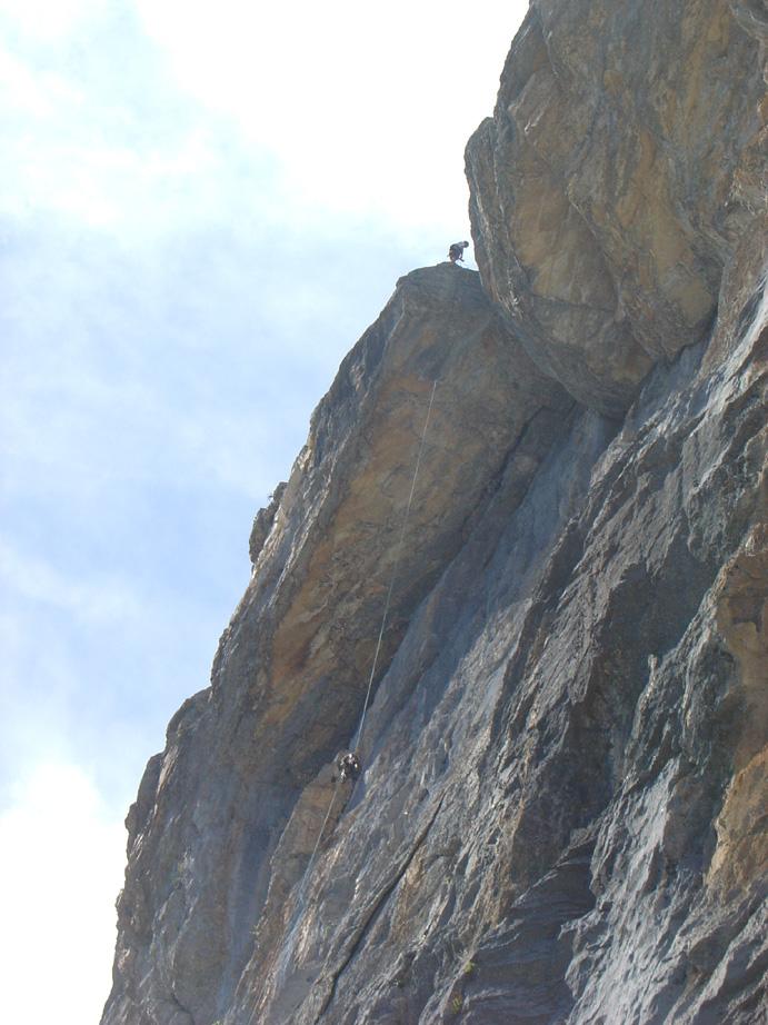Dall’ ultimo torrione si scende con 3 doppie da 60m molto lineari fino al cengione; poi raggiungere il masso con la “sosta” del 6a sotto cui c’è la sosta di calata ( con tanto di catena ed anello ) e con varie doppie si raggiunge l’attacco.