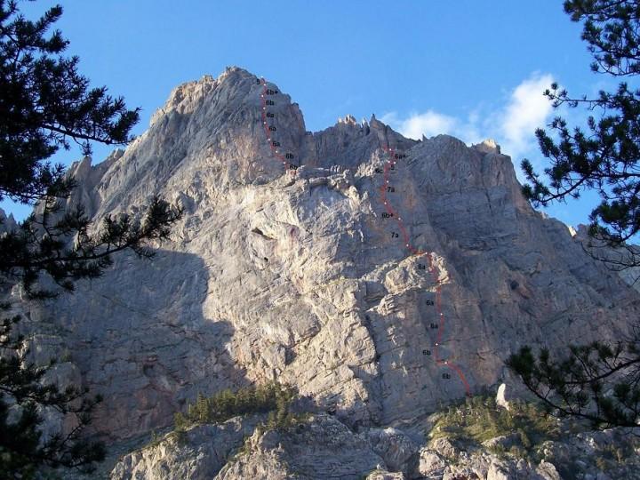 La via continua sul torrione rosso di fronte; alla base è presente una sosta
