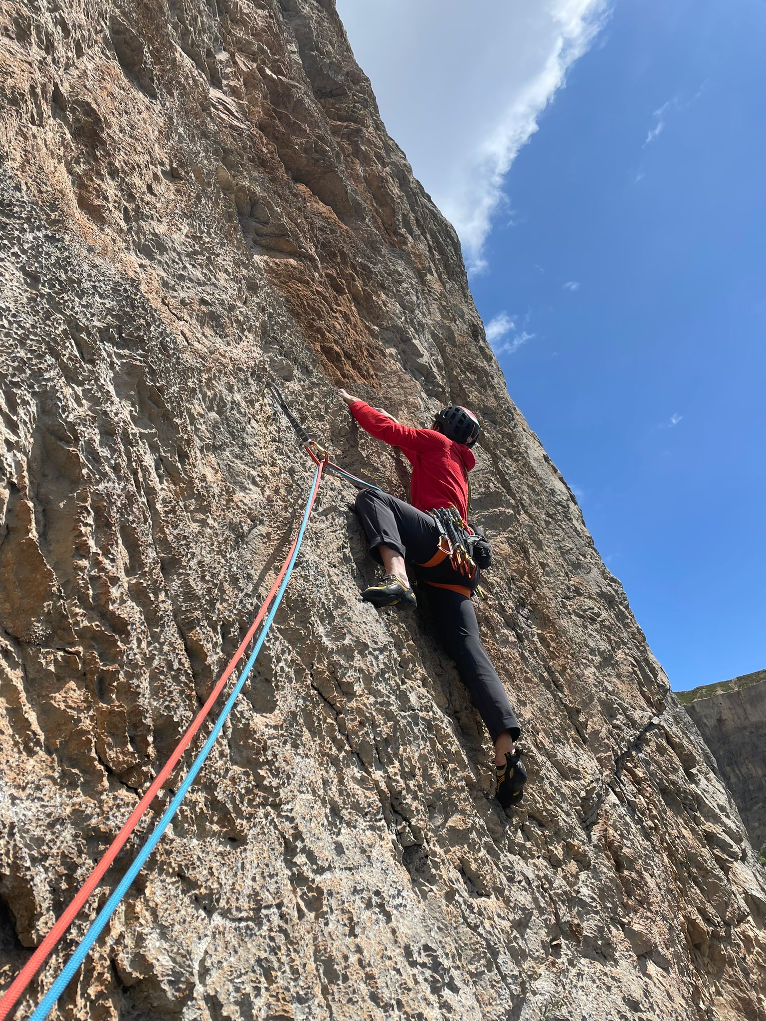 L.6: V cengia e poi muretto per raggiungere la sosta alla destra di un diedro rosso