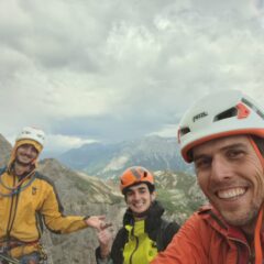 Abbiamo percorso la via in tre, siamo partiti dal camper parcheggiato dalle cisterne grigie (non più arancioni) alle 5:20 e abbiamo iniziato a scalare alle 6:30 per uscire in punta alle 15:00. Il meteo ci ha graziato perchè dopo quattro gocce poco fastidiose sul finale ci ha ancora dato il tempo di scendere all’asciutto.