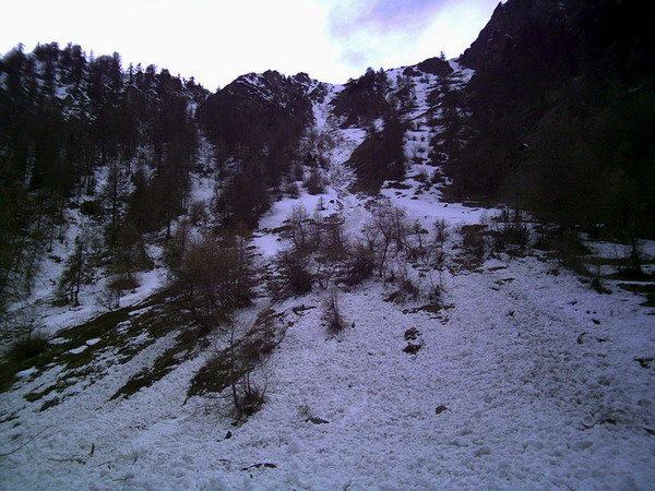 Da Plan Prorion si punta direttamente l’evidente canalone SE della Becca, attraversando il bosco di conifere mai troppo fitto. Dopo mezz’oretta si giunge ad un pianoro più rado (vegetazione spazzata dalle valanghe) a quota 1950m, da dove inizia il canalone.
