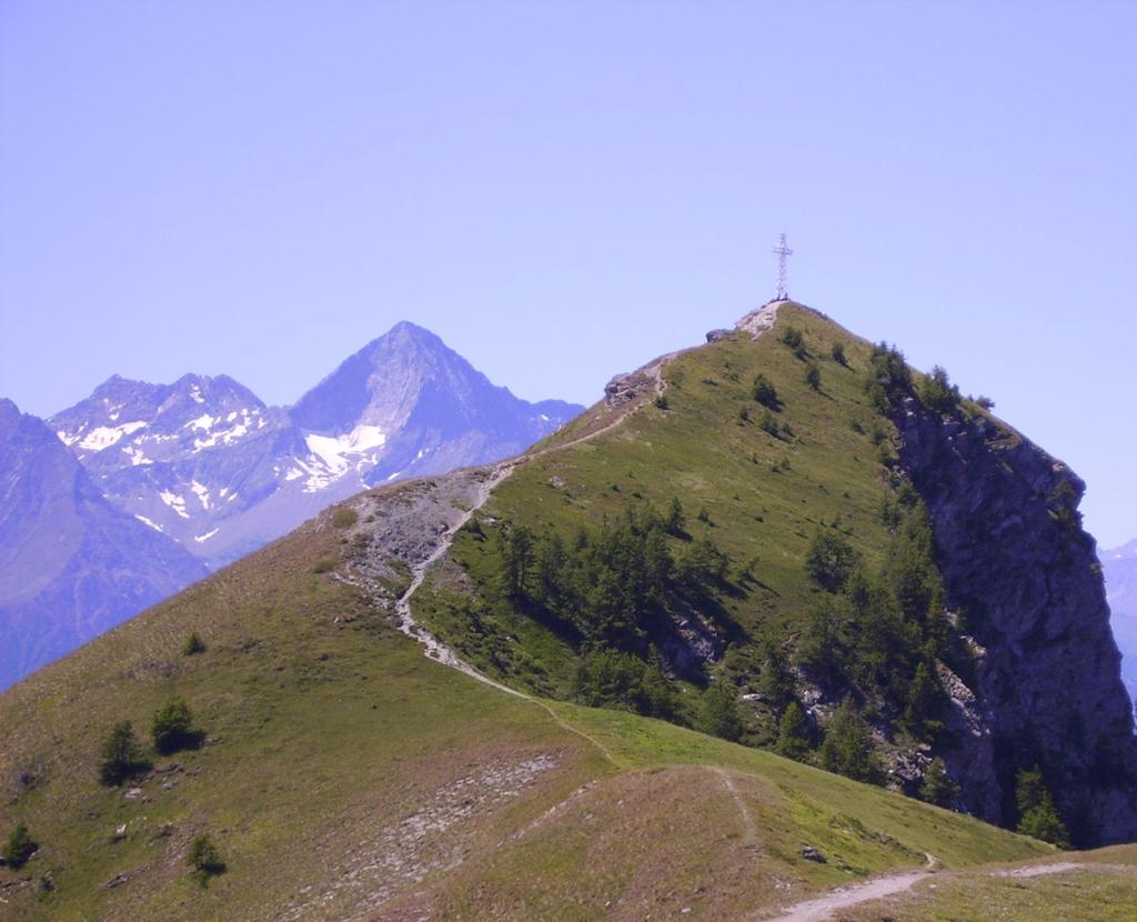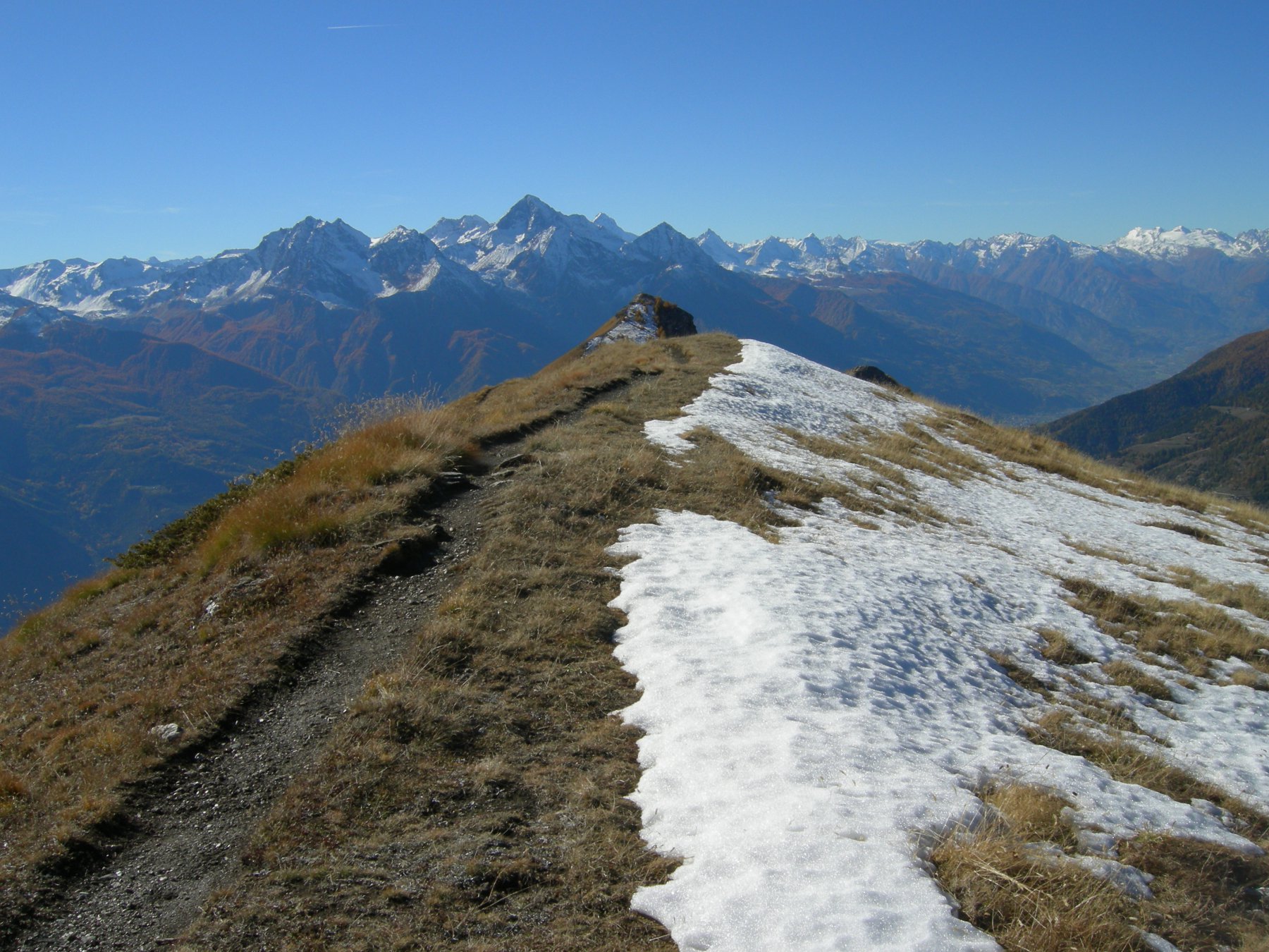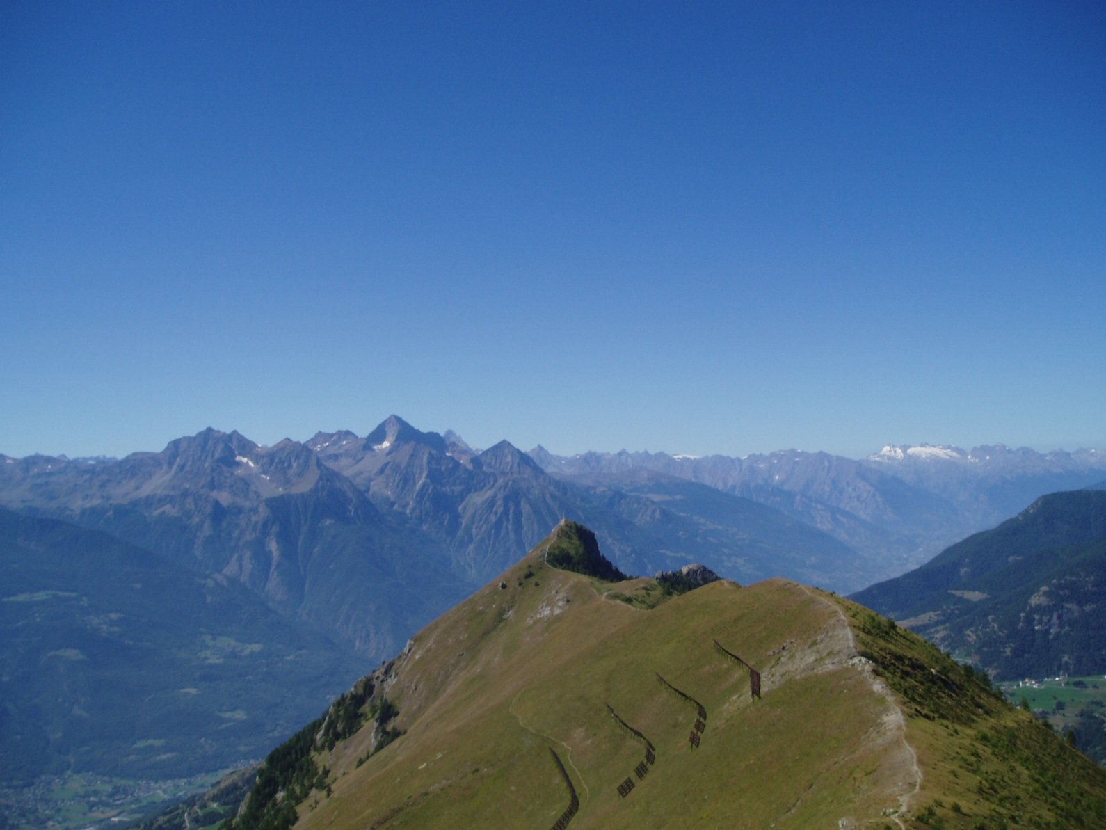 Il sentiero prosegue ora sulla dx della cresta , raggiunge una baita e un bivio (2360 m); si lascia a dx il sentiero che porta in cima alla Becca d’Aver e si prende il sentiero di sx che a mezza costa passa attraverso dei paravalanghe e si porta in cresta sotto la cima Longhede che si raggiunge con una breve e facile salita (2416 m) 1 ora dopo aver lasciato la macchina.Dalla cima della Longhede il panorama spazia dal gruppo dell’Emilius , alla Tersiva , al vallone di St. Barthelemy .