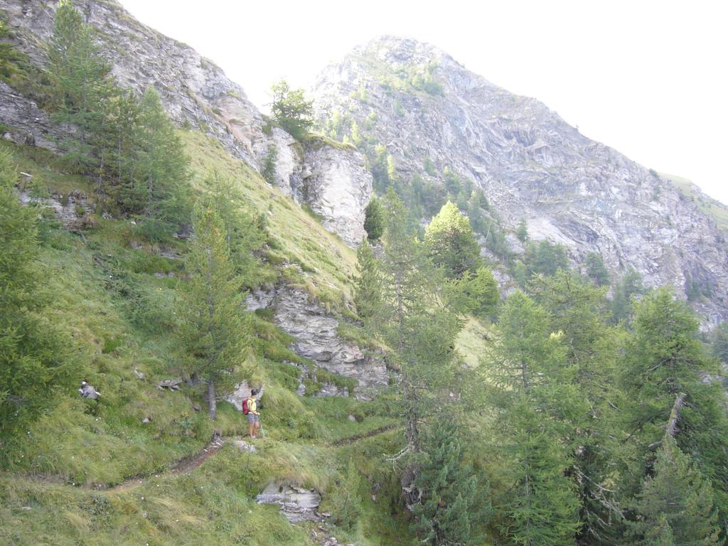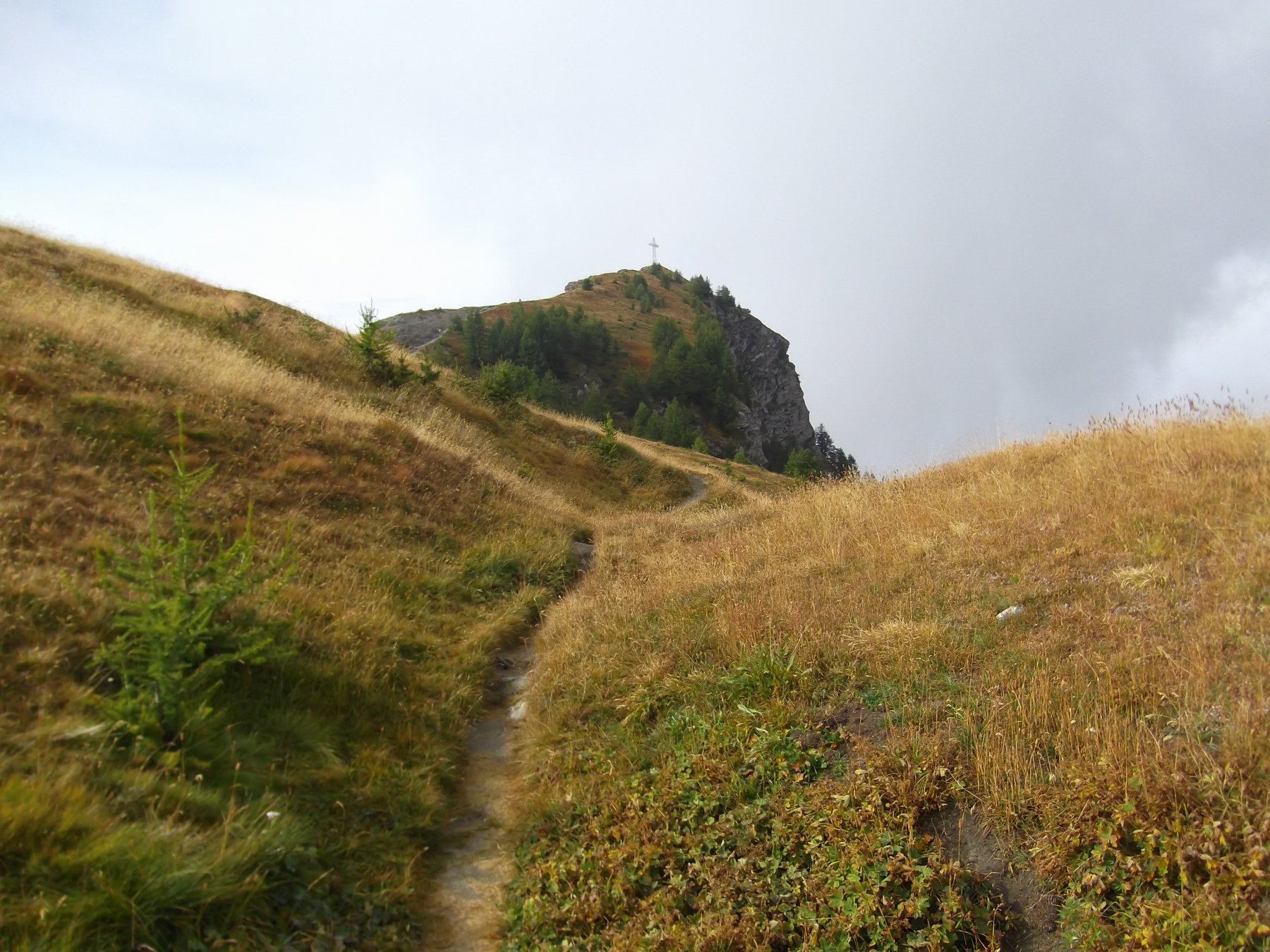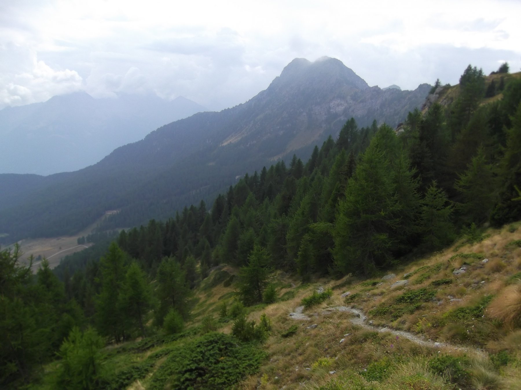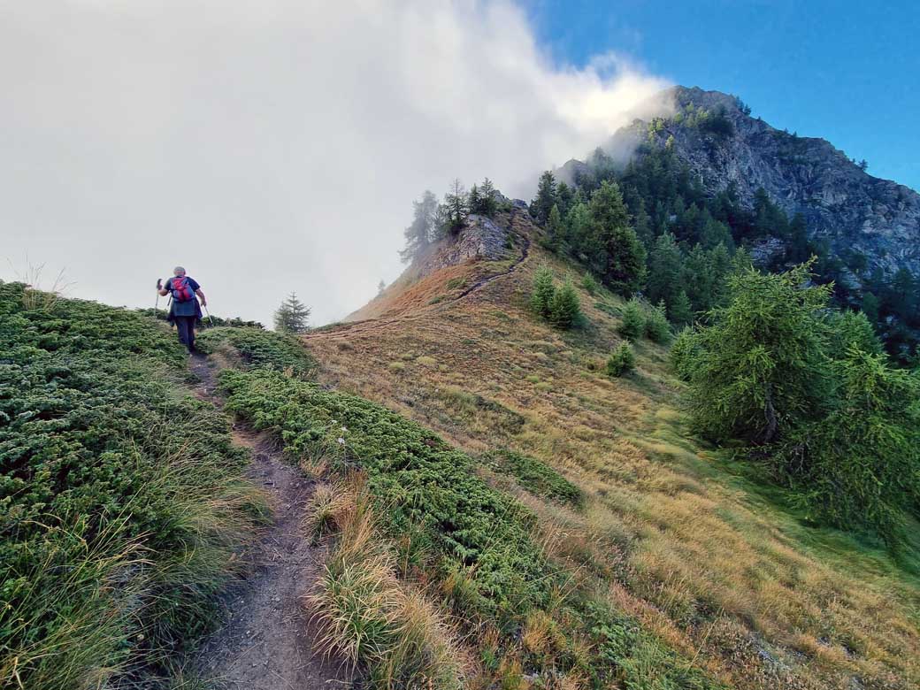 Raggiunta una carrareccia la si imbocca a sx e si riprende a salire con percorso mai monotono ; il sentiero traversa un pendio erboso , rientra nell’ultimo tratto di bosco e poi entra in un canalone erboso chiuso da salti rocciosi,lo si risale a tornanti e poi si obliqua a sx e si raggiunge il Col d’Aver (2330 m) dove si apre il panorama sulla valle centrale e sull’Emilius.
